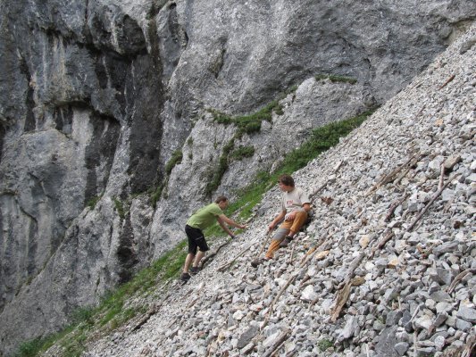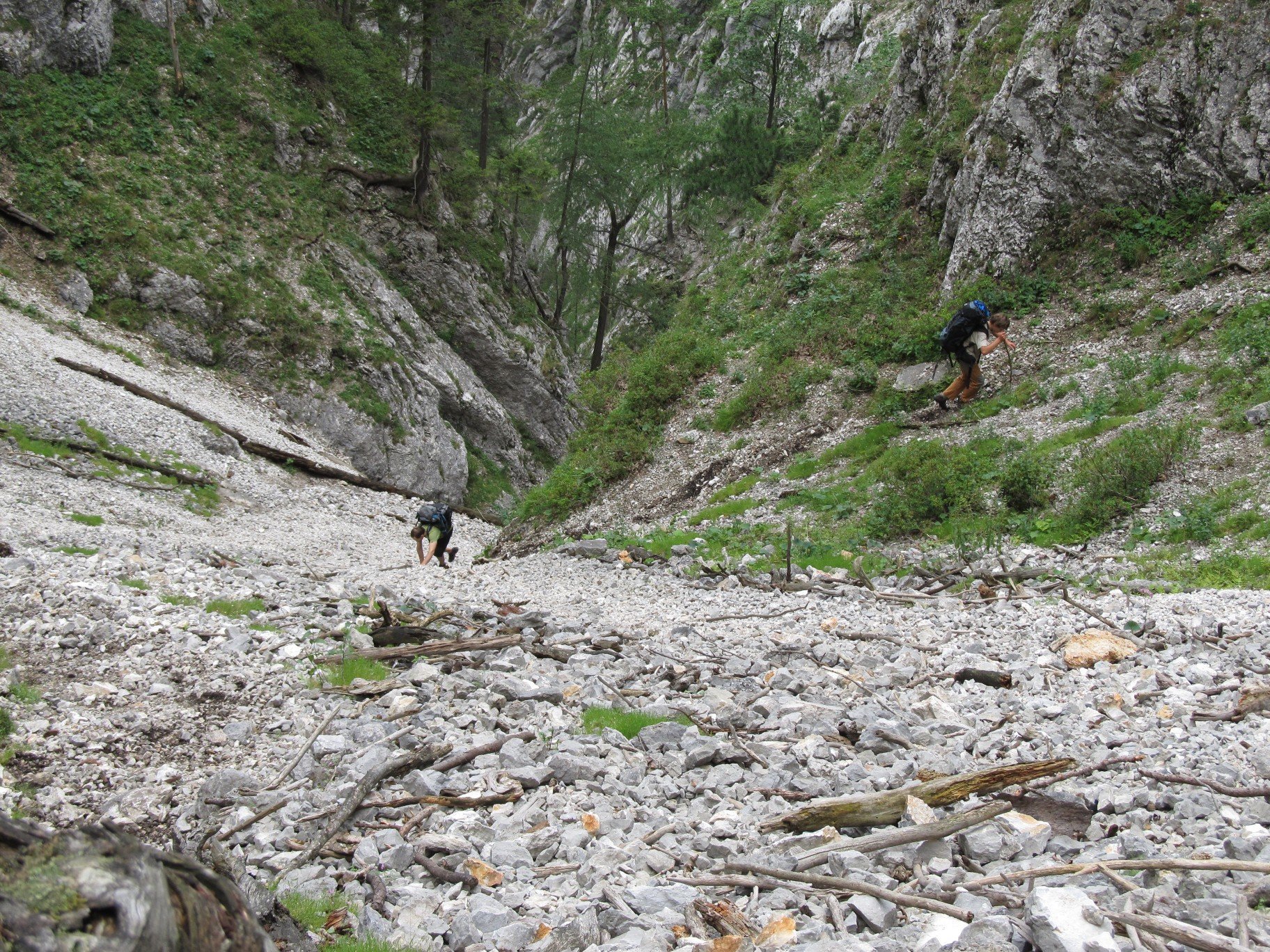 Stoupání od auta se ukázalo být dost prudkým. Po hodině funění do kopce a nastoupaných 400 metrech v nás začínají hlodat jisté pochybnosti o správnosti našeho počínání. Obracíme se a s velkou nechutí scházíme zpět k výchozímu bodu. Zkoušíme štěstí v dolince o trošku víc vlevo, ale rychle zjišťujeme, že i tady jsme špatně. Naše dolinka musí být ta uprostřed. Po další hodině stoupání suťoviskem, které připomínalo špíš šlapání vody v bazénu (jeden krok nahoru a dva zpět) jsme se zorientovali. Ano, opět jsme špatně, ale alespoň víme kde. Na lezení tu připadá v úvahu vpodstatě pouze jedna cesta - Sisyphus (7/7+, 150m, 4 dýlky). Připravujeme se, oblíkáme sedáky. Zbýša se pořád někde hemží a motá, a tak už jenom sledujeme můj milovaný foťáček, jak se nastoupaným suťoviskem kutálí zpět do údolí. Tak nějak vzpomínáme na podzimní Paklenici a Liborův výkřik: "Chyť ho". Tady bohužel nebyl nikdo, kdo by ho mohl chytit, tak se Zbyšour prošel. Radši začínám lízt, nebo bych ho musel zamordovat. Moje tajné naděje, že ho futrál ochrání, se rozpývají asi v půlce první dýlky, kdy se Zbyšek vrací pod nástup..