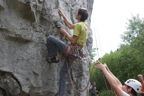 Dejv je klasik a zvlášt při lezení-kafe a Koala. Sluníčko peklo a Hřebenáč byl rozpálený jako pětník. Máme štestí-moc lidí tu není. Dejv mně, Speedymu a Zbyšanovi předlézá Severní Hranu. Vše jde jako po drátkách. Pak natáhne Brekův nářek. Nádherné lezení, které se ovšem mému těžkému pozadí nepozdává-vzdávám se, Speedy na 3. pokus a Zbyšan na druhý. Radek nám po svačince(ke které Dejv zavelel-klasik :) )ukazuje jak se leze Východní. Nejlépe to přetancuje Zbýša. My se Speedym až na x-tý pokus. Moc hezká cesta s překrásným krokem :) Dále už nemohu popisovat jelikož jsem upadl do stavu kdy jsem byl tak tak schopen nasadit batoh na záda a dojít za hřiště, kde Dejv násleďne začal škodit v Brazílii. Moc hezká lezecká neděle.