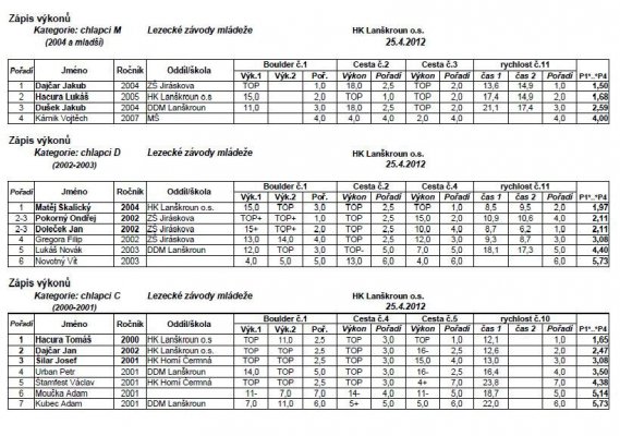 Ve čtvrtek 24.5.2012 se po šesté konaly "Školní lezecké závody" pro děti a mládež z Lanškrouna a okolí. Tradiční program a tradiční začátek. Ve dvě tradičně zahájili děti ze speciální školy, od tří už taky tradičně předškoláci, školáci a studenti. Nejmladší Sára Šebrlová a Vojta Kárník mají v listě narození shodně rok 2007, "nejstarší" Speedy si během závodů odskočil pro maturitní vysvědčení. Tradičně tvrdý byl Dejvův bolder a nedradiční byli snad jen stavěči Michal a Zbyšek. Na konci pár čísel: Speciální škola - 13 lezců, školkáči, školáci a studenti celkem - 42 lezců. Tradičním sponzorům - Vondra a Vondra Luková, Kovoobrábění Hacura Linhartice a městu Lanškroun - díky za podporu.