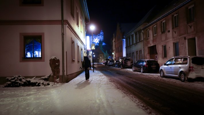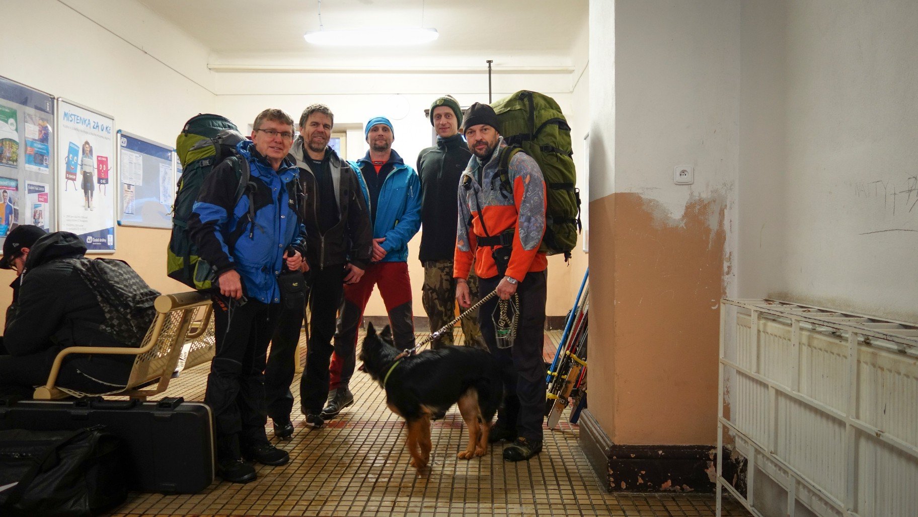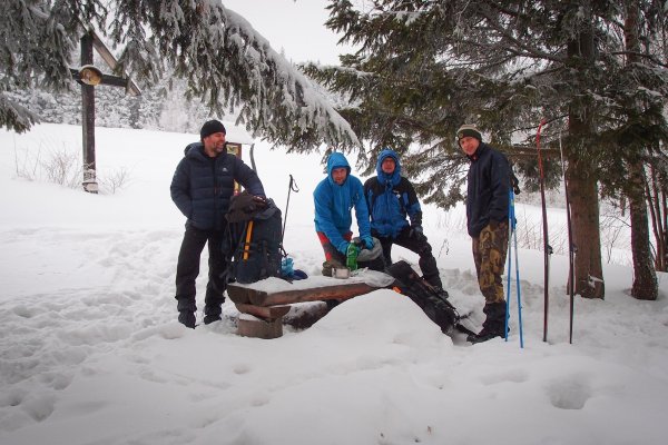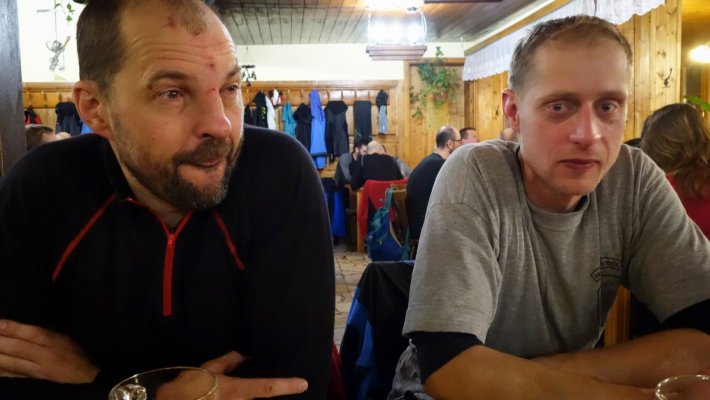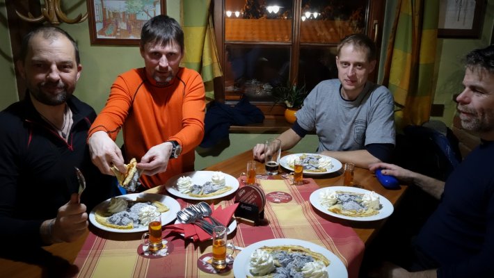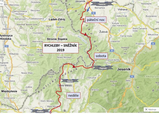 Letošní plán na přechod Rychleb jsme doplnili o zdolání Králického sněžníku. Zásob máme na celý víkend, Charlie ještě narychlo dokoupil kartáček a zubní pastu, nechápeme na co. Auta zanecháváme již v Hanušovicích a ve vlaku se těšíme na javornickou Tavernu, kde doplňujeme kalorie, co se vleze. Ryze mužskou sestavu Fous, Charlie, Pavel, Standa a já doplňuje ženský element Cajka. Když už není, kam by se další sousta vešla, šoupneme tam jednu rychlebskou hořkou na trávení a nadrženě vybíháme do nočního chladu.