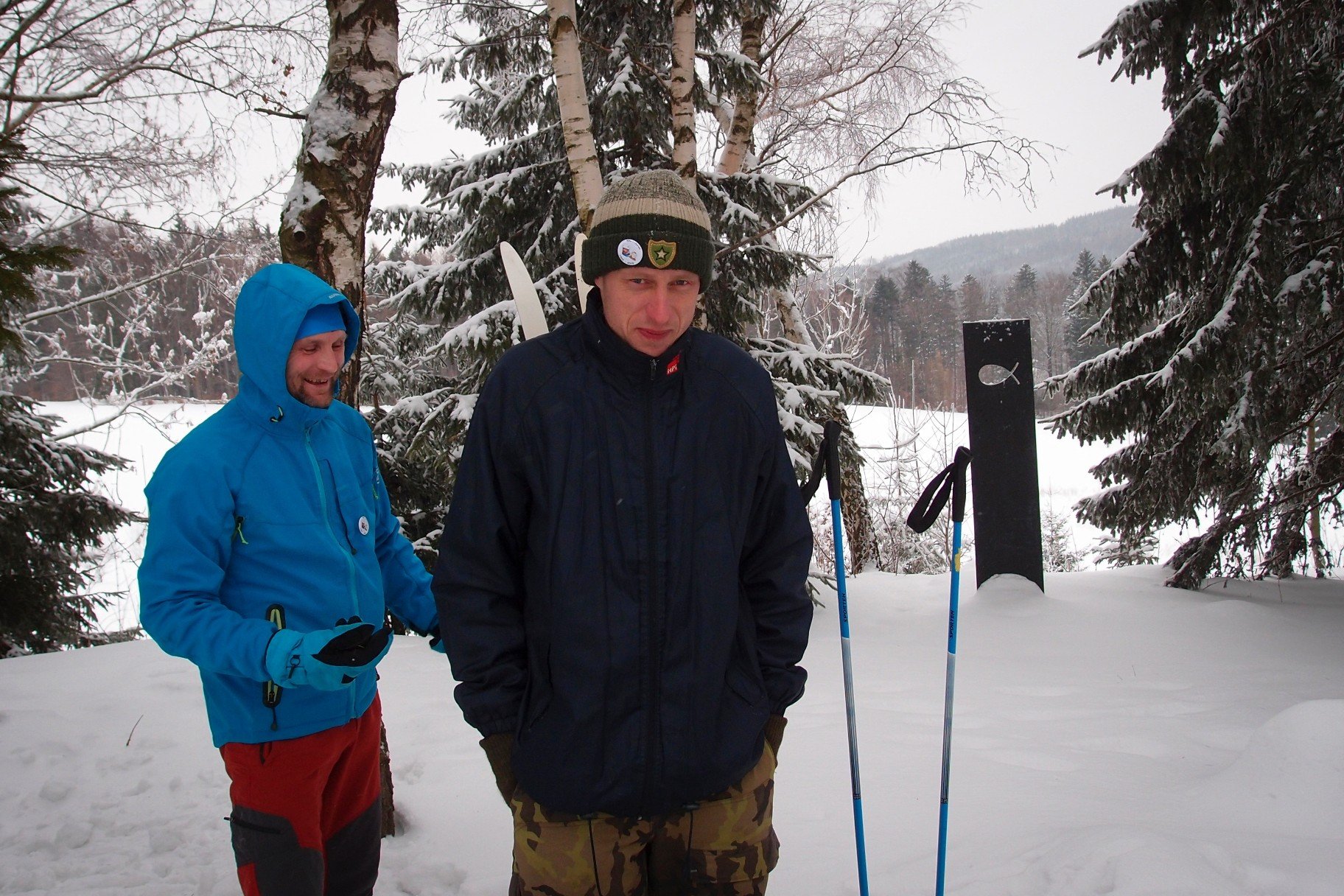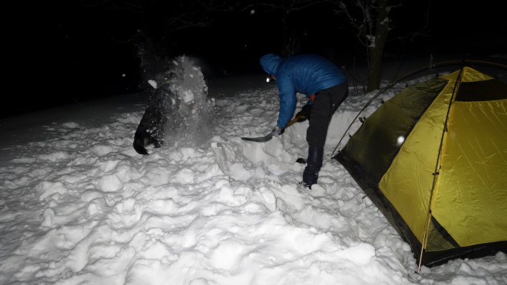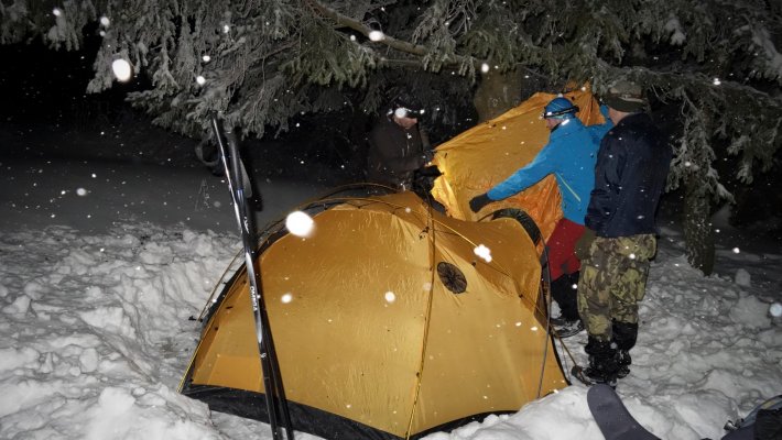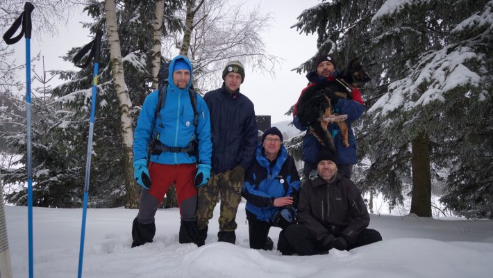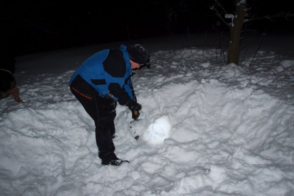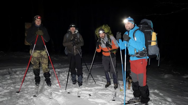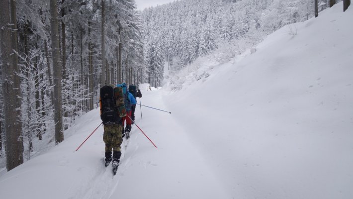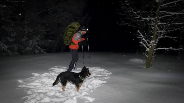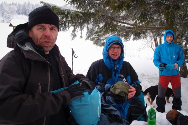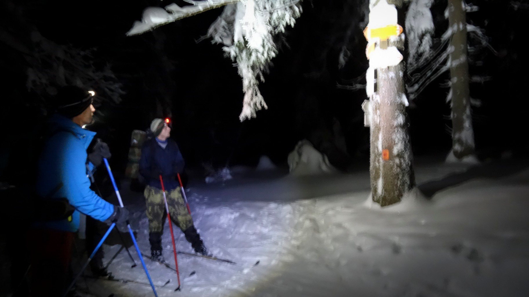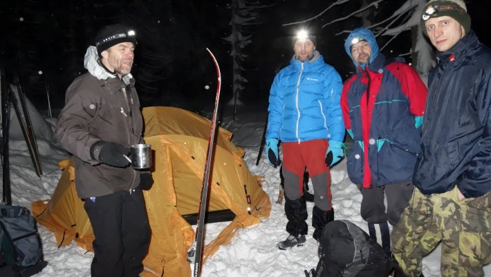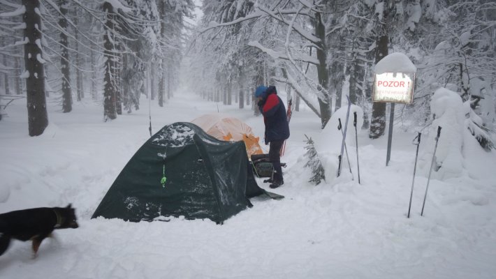 Sněhu je štědře naděleno a lyže nedočkavě nasazujeme pod lesem za Javorníkem. Skluznice se chtivě noří do prašanu, ten však nemá žádný sněhový podklad a tak sem tam zadrhávájí o štěrk a kamení. To nás přece nezastaví, jsme neohrožení vládci nočních hor. Tu se cesta láme směrem dolů a po chvilce zbytečného manévrování letím vpřed, zatímco lyže zarputile stojí zapíchlá o kámen. Nevím kde je nahoře a kde dole. Všude je tma jak v hrobě a světlo v dáli mě k sobě láká, chci jít k němu. Nejde to, na krku mi leží batoh. Natahuji ruku a beru světlo do ní, třepotá se jak motýl a je mi povědomé. Vypadá jak kus mé čelovky, co mi ji z hlavy urazil kámen, na kterém ležím. Musím rychle vstát, jinak tu zůstanu na věky. Už tu jsou ostatní a baví se tím, že žiju, případně jak vypadám. Pumelice do hlavy byla pořádná, takže se jen sleduji, zdali nepřijdou závratě či nevolnost, to bych musel zpět do Taverny. Procházíme Račím údolím a vylézáme nad Červený Důl. Znovu nasazujeme lyže, repete dopadá dobře. Podél Vilémovic přibývá sněhu ke kolenům a trochu přifoukává. Na Hraničkách jsme až v jednu po půlnoci. Lopata na Fousově báglu mi připadla zbytečná, teď jsme štastní, že ji máme. Cajka se točí do klubíčka na karimatku a před zhasnutím se ptám Standy, jak vypadám poté, co jsem si odtrhl přilepenou čepici. "Jo, máš to dobrý", a všímám si, že má brýle již pověšené u stropu stanu.