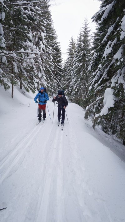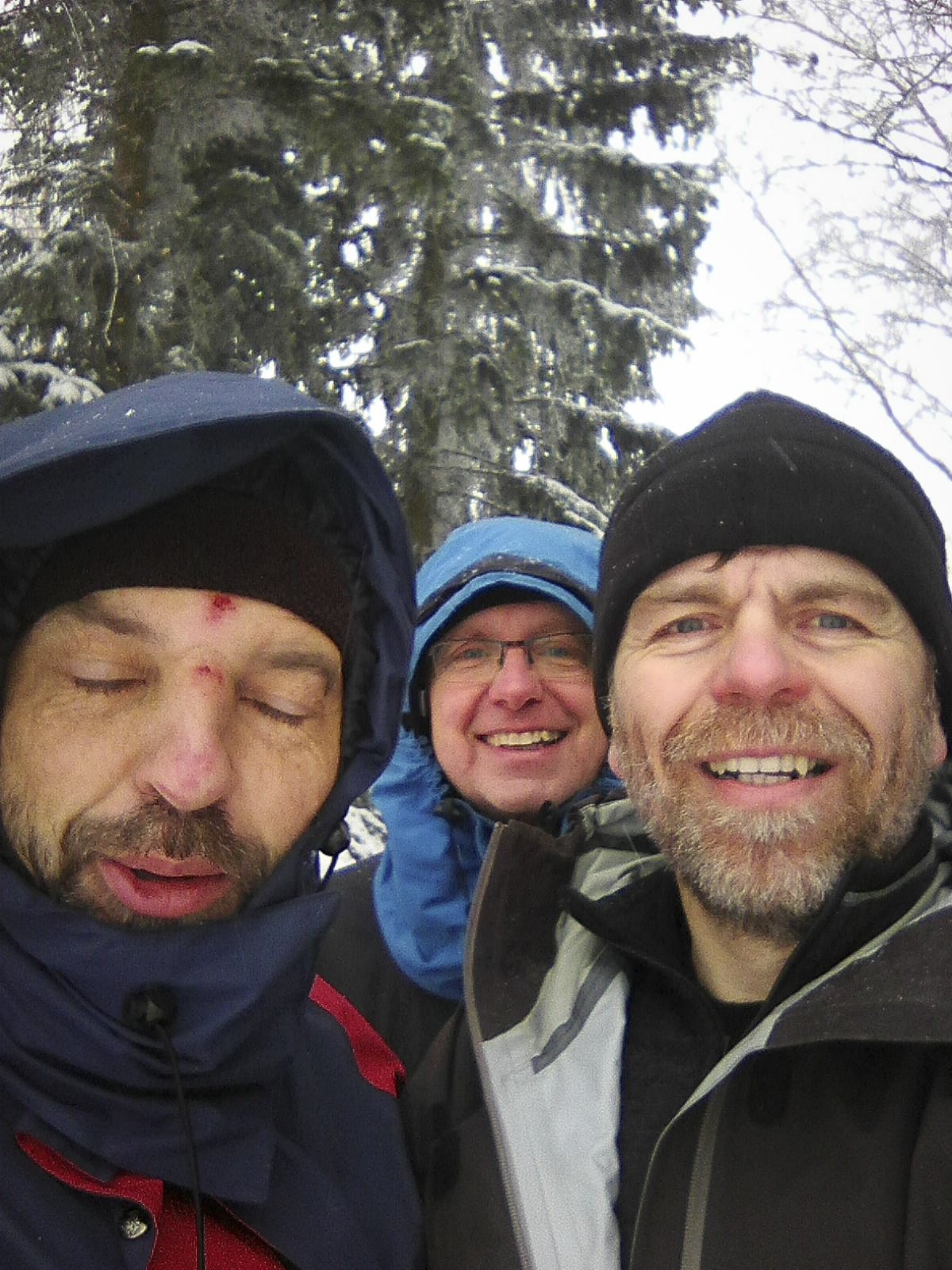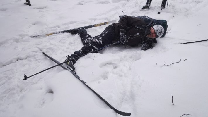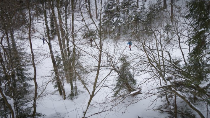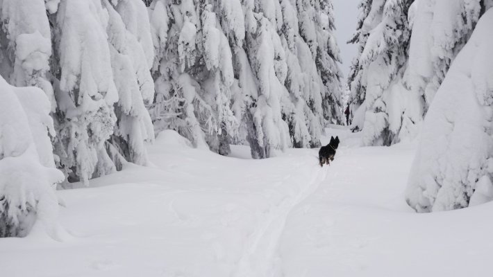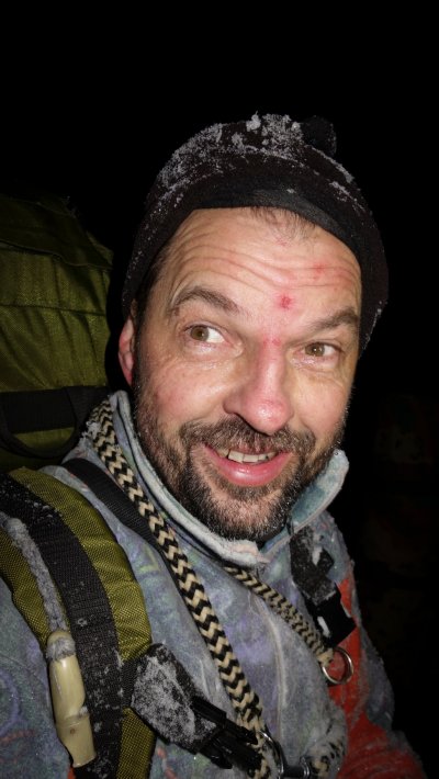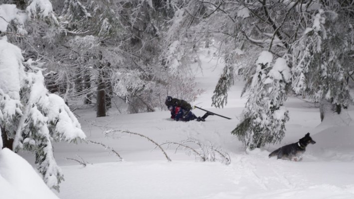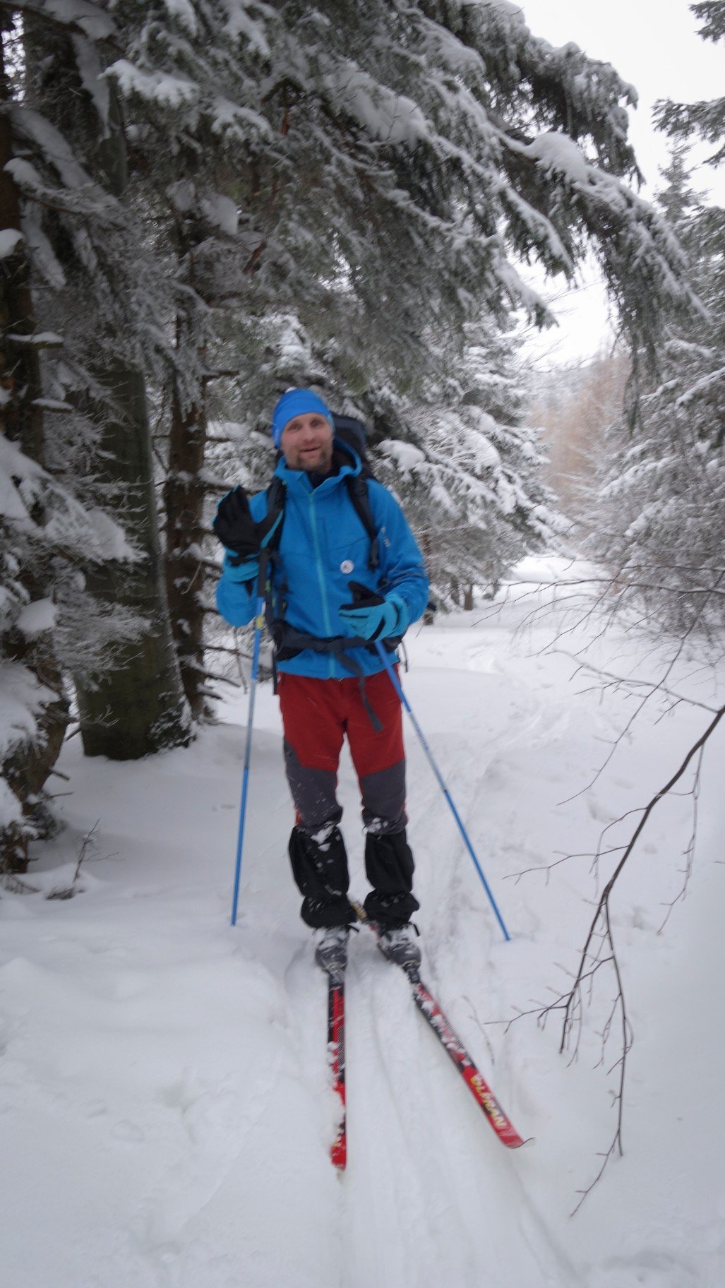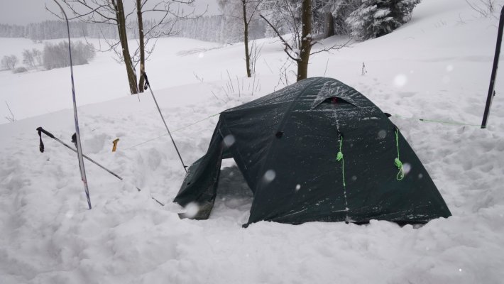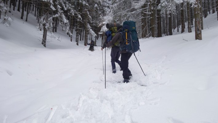 Sněhu je štědře naděleno a lyže nedočkavě nasazujeme pod lesem za Javorníkem. Skluznice se chtivě noří do prašanu, ten však nemá žádný sněhový podklad a tak sem tam zadrhávájí o štěrk a kamení. To nás přece nezastaví, jsme neohrožení vládci nočních hor. Tu se cesta láme směrem dolů a po chvilce zbytečného manévrování letím vpřed, zatímco lyže zarputile stojí zapíchlá o kámen. Nevím kde je nahoře a kde dole. Všude je tma jak v hrobě a světlo v dáli mě k sobě láká, chci jít k němu. Nejde to, na krku mi leží batoh. Natahuji ruku a beru světlo do ní, třepotá se jak motýl a je mi povědomé. Vypadá jak kus mé čelovky, co mi ji z hlavy urazil kámen, na kterém ležím. Musím rychle vstát, jinak tu zůstanu na věky. Už tu jsou ostatní a baví se tím, že žiju, případně jak vypadám. Pumelice do hlavy byla pořádná, takže se jen sleduji, zdali nepřijdou závratě či nevolnost, to bych musel zpět do Taverny. Procházíme Račím údolím a vylézáme nad Červený Důl. Znovu nasazujeme lyže, repete dopadá dobře. Podél Vilémovic přibývá sněhu ke kolenům a trochu přifoukává. Na Hraničkách jsme až v jednu po půlnoci. Lopata na Fousově báglu mi připadla zbytečná, teď jsme štastní, že ji máme. Cajka se točí do klubíčka na karimatku a před zhasnutím se ptám Standy, jak vypadám poté, co jsem si odtrhl přilepenou čepici. "Jo, máš to dobrý", a všímám si, že má brýle již pověšené u stropu stanu.