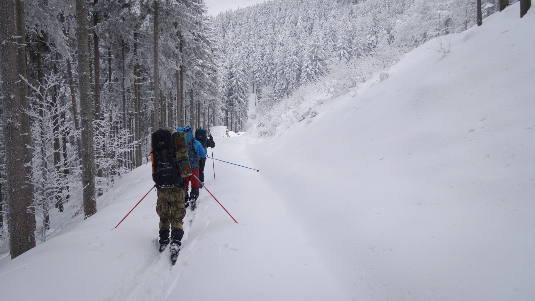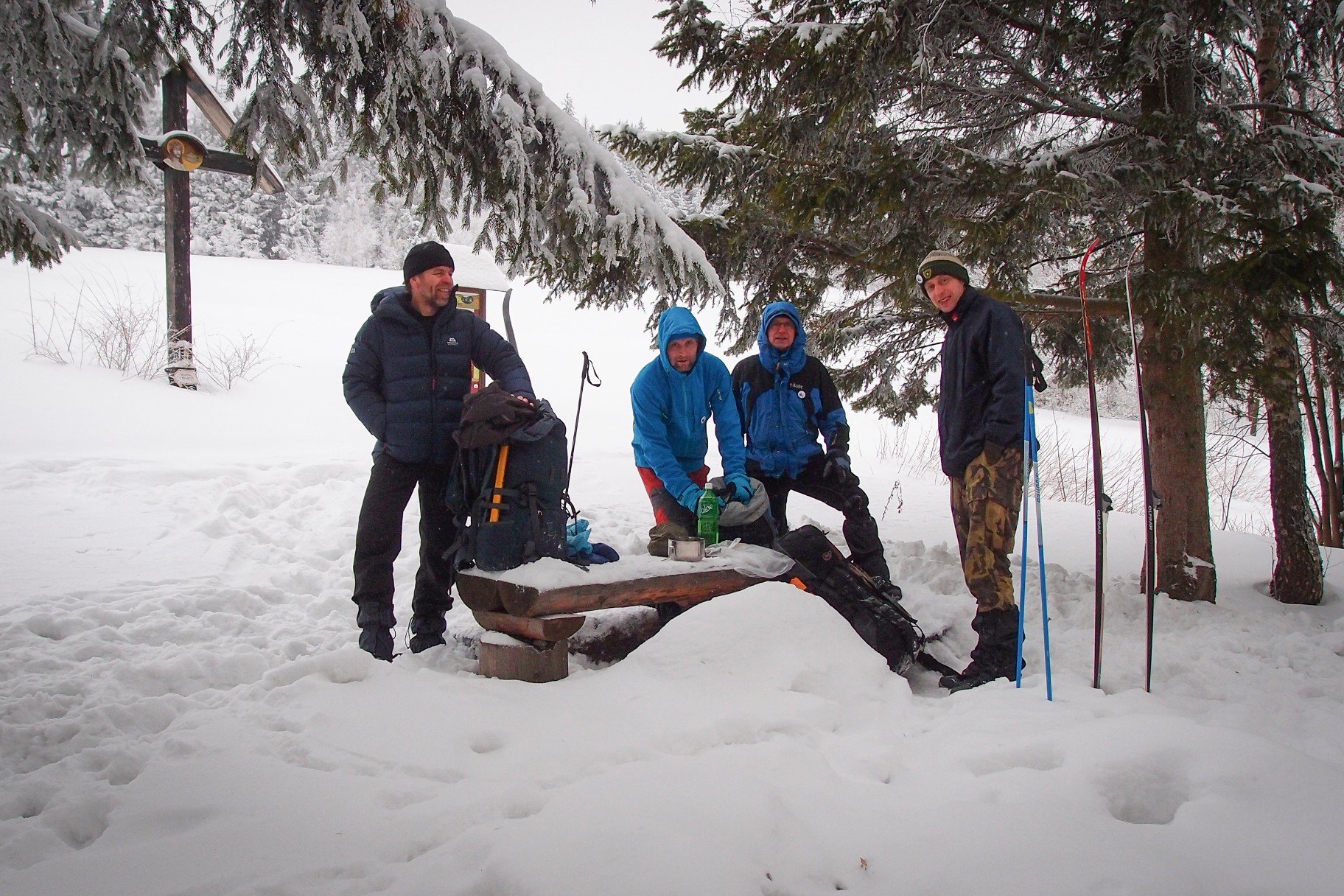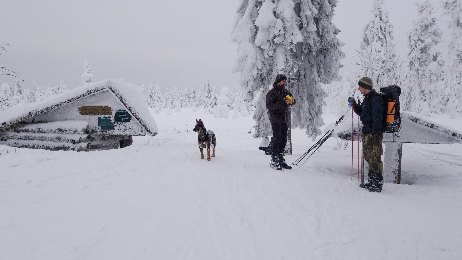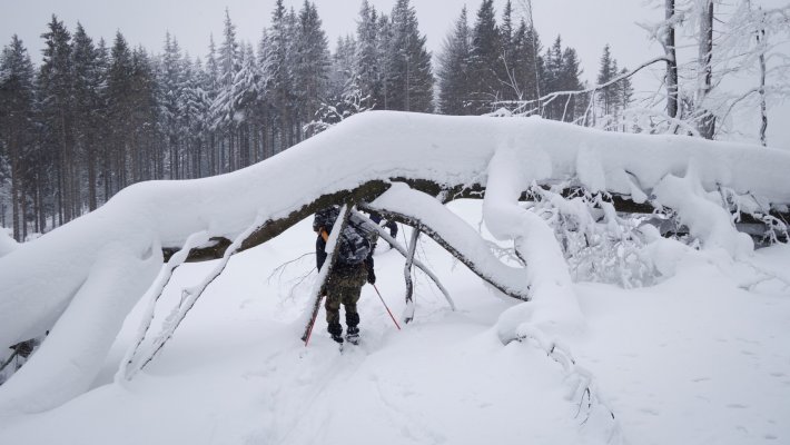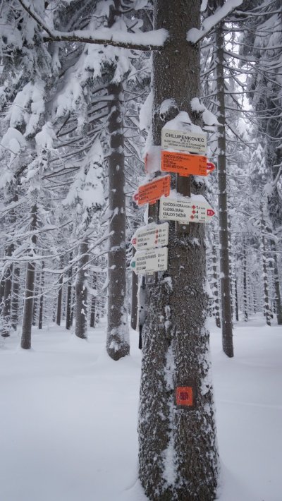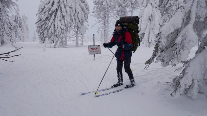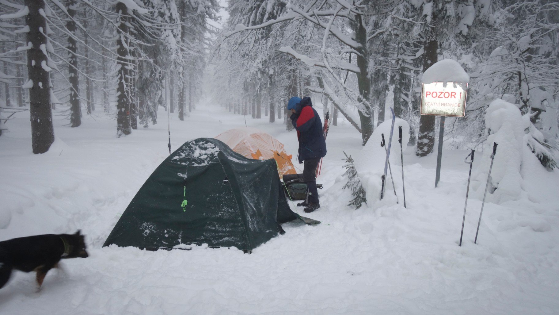 "No ty vypadáš", vítá mě Standa do rána, když si nasadil brýle. Oranžový stan na nás nevybíravě povykuje a zdržuje, aniž by se rozdělil o nějakou dobrotu. Střídáme se v prošlapávání stopy až pod lesní chatu. Tady už musí bojovat s krpálem každý po svém. Charlie naznačuje, kdo bude nezničitelným králem výstupů. Posilnění u chaty je nutností. Na Špičáku jsme přesně v poledne, máme zpoždění. Hřeben je pokrytý prašanem, to je záruka bezpečných pádů. Ze Špičáku jeden tygr, z Břidličného dva. Výstup na Kovadlinu je nekonečný a v dnešku pro mě nejhorší. Návějemi stromečkem, někdy bokem. Zbývá nám polsedních pět kilometrů na Smrk. Dolů musíme lyže sundat. Boříme se po kolena nebo po stehna, jak kdy. Těch pět kiláků nám zabírá dvě a půl hodiny. Smrk nás vítá ve čtyři odpoledne. Měknu a souhlasím s návštěvou Paprsku. Již od včerejška všichni bručí, že bez hospody se nedá přežít a co je tohle za život. Vlévá nám to do žil nový život, pivo, kofolu, čak, čočkovku, praděda a povidlový knedlík. K čemu sakra táhnu tolik žrádla, když navštěvujeme úplně všechny hospody po cestě? "Pánové, tahle je poslední tento víkend, máte vyčerpáno". Tábor rozbíjíme na Chlupenkovci někde mezi Medvědí boudou a Kladskou bránou, přímo na stopě. Noc je klidná a prochumelená, někdo prý chrápal.