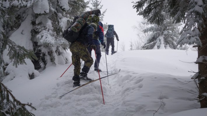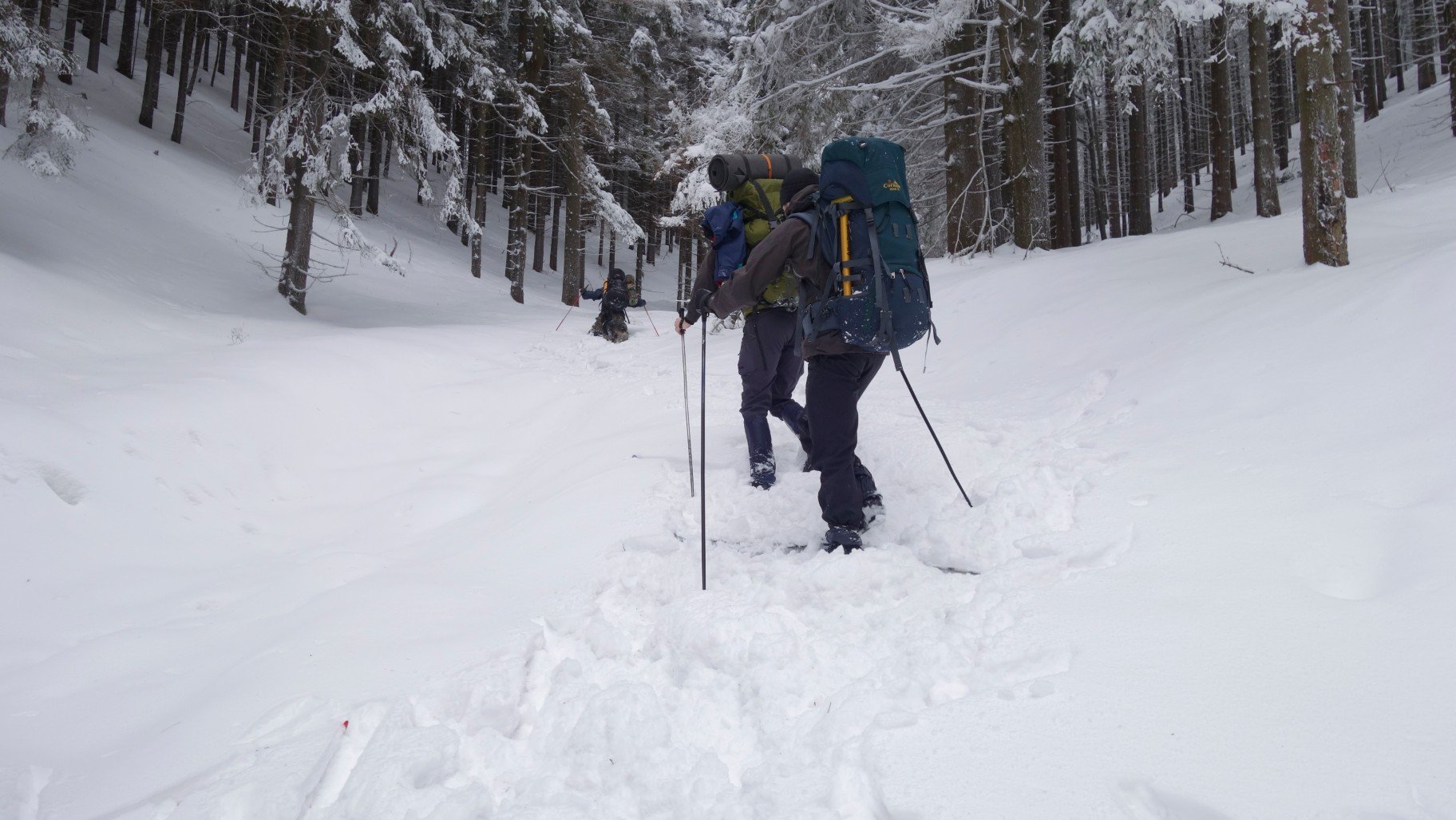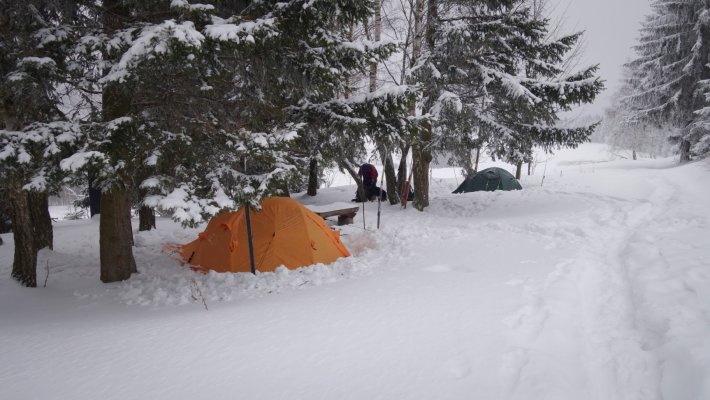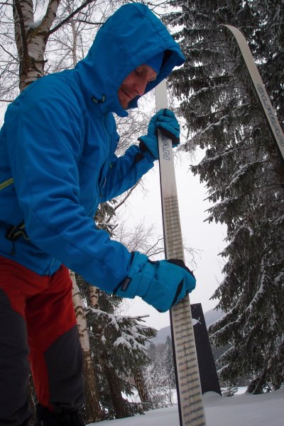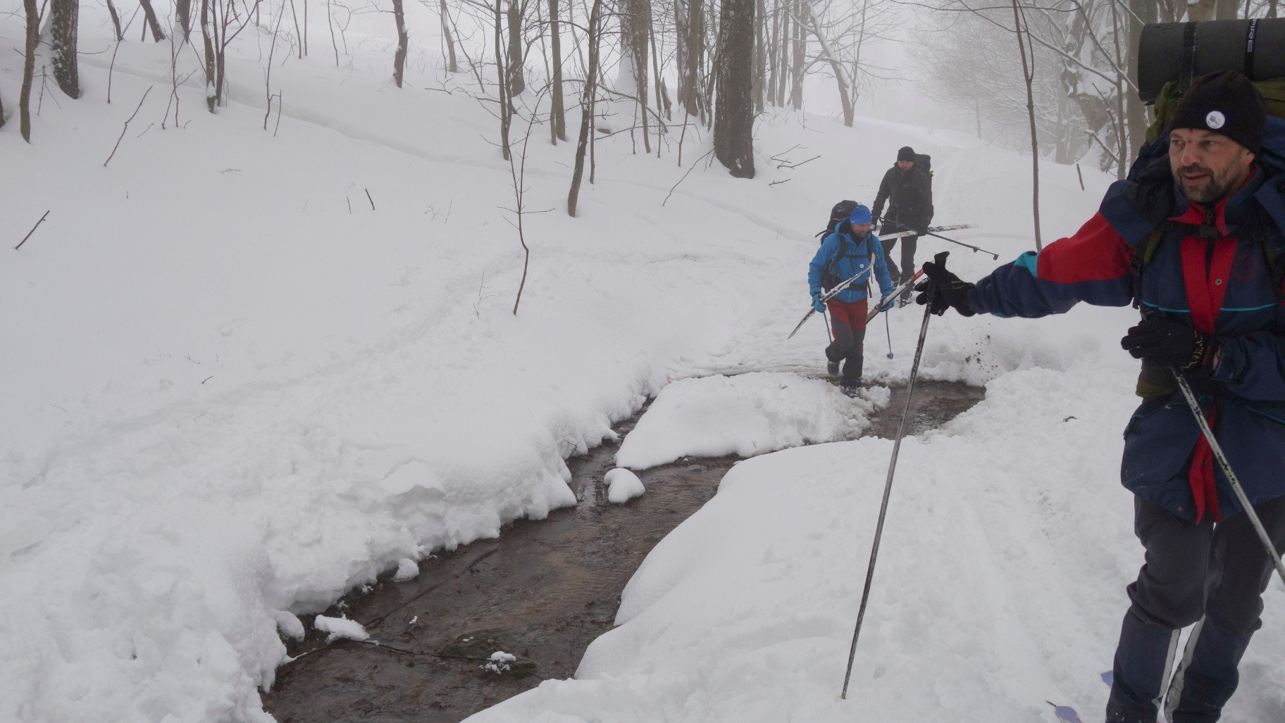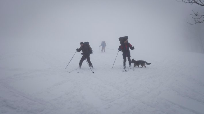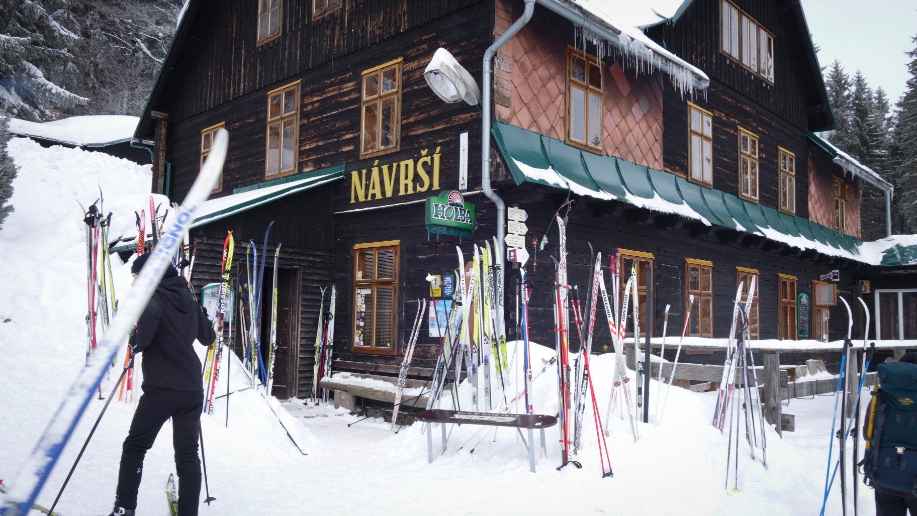 "No ty vypadáš", vítá mě Standa do rána, když si nasadil brýle. Oranžový stan na nás nevybíravě povykuje a zdržuje, aniž by se rozdělil o nějakou dobrotu. Střídáme se v prošlapávání stopy až pod lesní chatu. Tady už musí bojovat s krpálem každý po svém. Charlie naznačuje, kdo bude nezničitelným králem výstupů. Posilnění u chaty je nutností. Na Špičáku jsme přesně v poledne, máme zpoždění. Hřeben je pokrytý prašanem, to je záruka bezpečných pádů. Ze Špičáku jeden tygr, z Břidličného dva. Výstup na Kovadlinu je nekonečný a v dnešku pro mě nejhorší. Návějemi stromečkem, někdy bokem. Zbývá nám polsedních pět kilometrů na Smrk. Dolů musíme lyže sundat. Boříme se po kolena nebo po stehna, jak kdy. Těch pět kiláků nám zabírá dvě a půl hodiny. Smrk nás vítá ve čtyři odpoledne. Měknu a souhlasím s návštěvou Paprsku. Již od včerejška všichni bručí, že bez hospody se nedá přežít a co je tohle za život. Vlévá nám to do žil nový život, pivo, kofolu, čak, čočkovku, praděda a povidlový knedlík. K čemu sakra táhnu tolik žrádla, když navštěvujeme úplně všechny hospody po cestě? "Pánové, tahle je poslední tento víkend, máte vyčerpáno". Tábor rozbíjíme na Chlupenkovci někde mezi Medvědí boudou a Kladskou bránou, přímo na stopě. Noc je klidná a prochumelená, někdo prý chrápal.