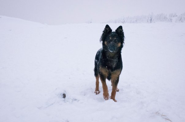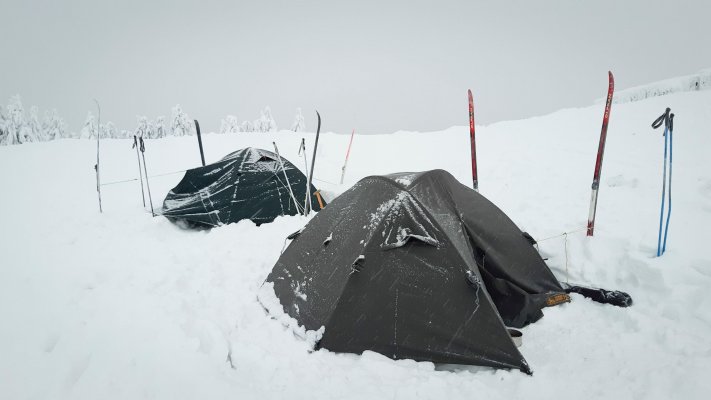 Ze sedla k vrcholu, přesněji řečeno ke slonovi je to již jen kousek do kopce, kde se příjemně rozehřejeme pře stavěním ložnic. Trochu pofukuje, takže Fous s Charliem si stan přivazují přímo ke slonovi, Pavel se Zipem si vyhrabávají lopatou závětří a stejné řešení volíme i já s Hankou poté, co nám stan z volného prostranství mírně poodlétával. Jakmile nám stojí apartmany, jdeme hodovat. Je čas těsně posvátkový, takže jednak jsme navyklí na vyšší potravinový příjem a jednak domácí spižírny disponují zásobami lepšími než obvykle. Uzené, klobásy, sýry a utopenci, medovina, rum kolují až do vyprázdnění misek, jen to vánoční cukroví chybí. Jen co nás objalo teplo ve spacácích, propadáme se do hlubin ve výšinách, bedlivě střeženi Cajkou schoulenou v mých nohách.