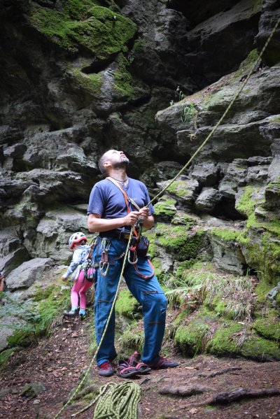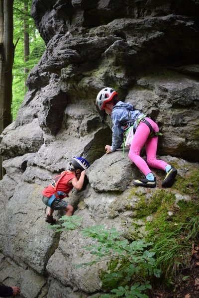 Přes dvacet dětí a stejně tolik dospělců se nechalo zlákat vidinou dvoudenního dobrodružství. Základnou se nám stal kemp v Ludvíkově u Karlovy Studánky, takže místní skály jsme měli jen pár minut chůze od noclehu. Martýrie přijezdu zvládli všichni, i když třeba Dománkovi na ně dlouho nezapomenou. Někdo si ustlal v chatce, někdo dojel karavanem, někdo zvolil stan. Fous na večerním shromáždění nastínil zítřejší program a všichni se tak mohli těšit na skalní lezení. Snad jen malý Vojta měl starosti, zda tam budou k mání také jahody.