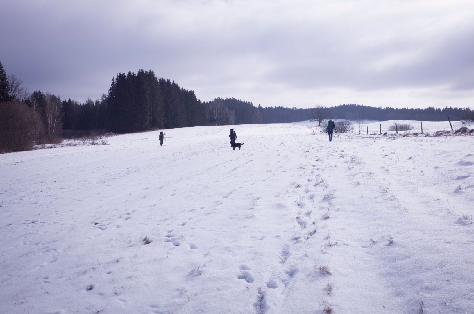 Jirku jsme zastihli ještě teplého a Budějic jsme dosáhli s luxusní rezervou, abychom zaparkovali a koupili jízdenky. Paní za okýnkem se nás sice pokouší nahlodat posměškem: "Kam s těmi lyžemi?" A když sebevědomě popíšeme, že z Dolního Dvořiště do Nových Hradů, odvětí: "To nejde", ale lístky vydá. Musíme totiž na expres, kde v prvním vagóně sedí Hanka se Semčou, směřující k jihu z Prahy. Ani ne za hodinu vysedáme v Rybníce, poslední české zastávce před rakouskou hranicí. Asi padesát metrů od nádraží určuji směr našeho postupu, a protože je úplně mimo, ujímá se navigace po zbytek víkendu Jirka a jeho telefon chytrý jak mraky. Po dvou kilometrech opouštíme příhraniční kasína, zubárny a láskyplné kluby a vítají nás čerstvým prašanem pokryté louky. Na obzoru sledujeme kopečky a odhadujeme, které budeme přecházet. Postupujeme převážně po cyklostezkách a od Rakouska, které je blíže než na dohled nás dělí jen hraniční Malše. V jednom okamžiku se k řece přiblížíme natolik, že některým v pobřežních mokřinách natekla do bot, to když se nám trochu ztratila cesta a dále nás vedla jen intuice a Jirka. Postupně si předáváme zapřaženou Semču, abychom Hance zmírnili pocit provinění, že se nechá celou cestu táhnout. Po čase ji však vždy rádi odevzdáváme zpět po jejích pokusech strhnout nás na lyžích, co se lehko zasekávají o kameny pod sněhem, k zemi. Některé ty pokusy jsou i úspěšné.