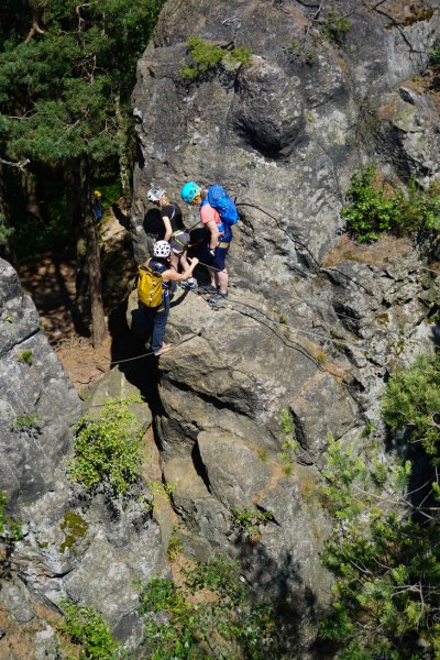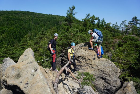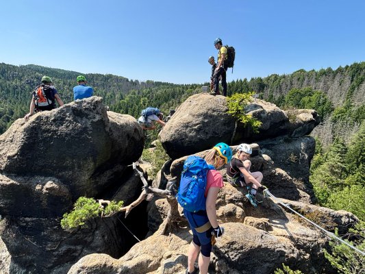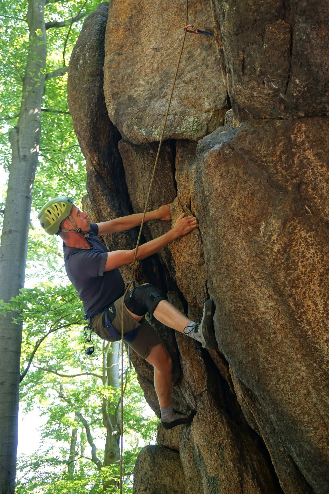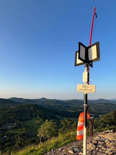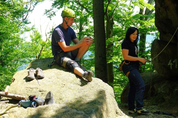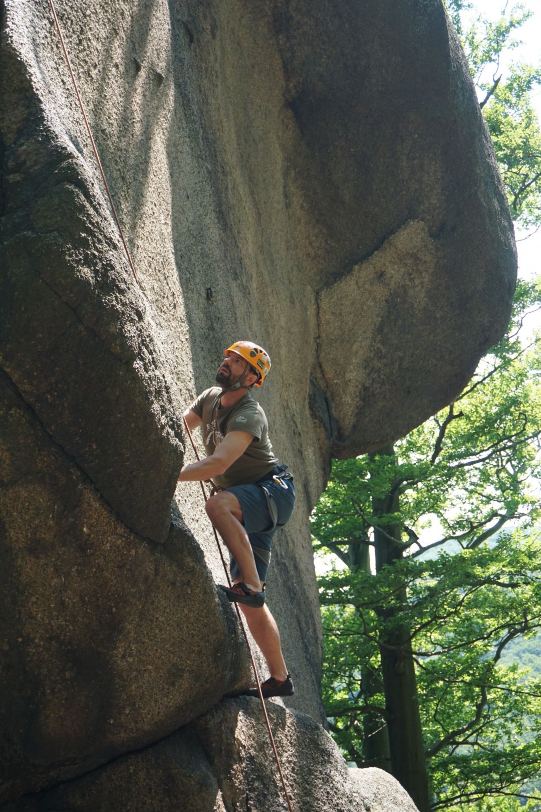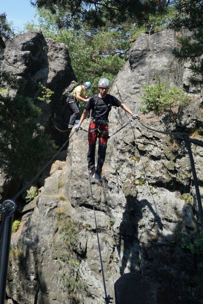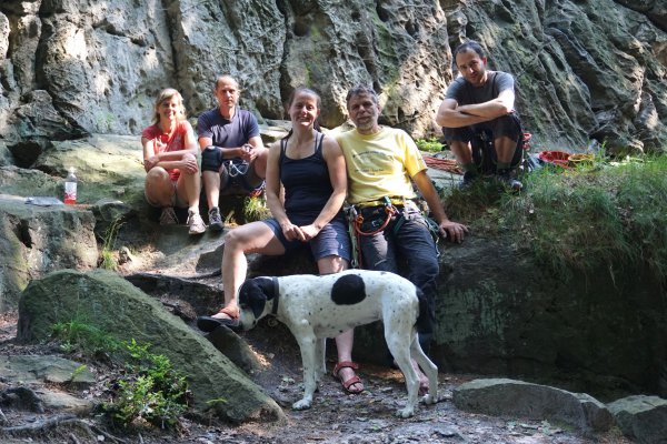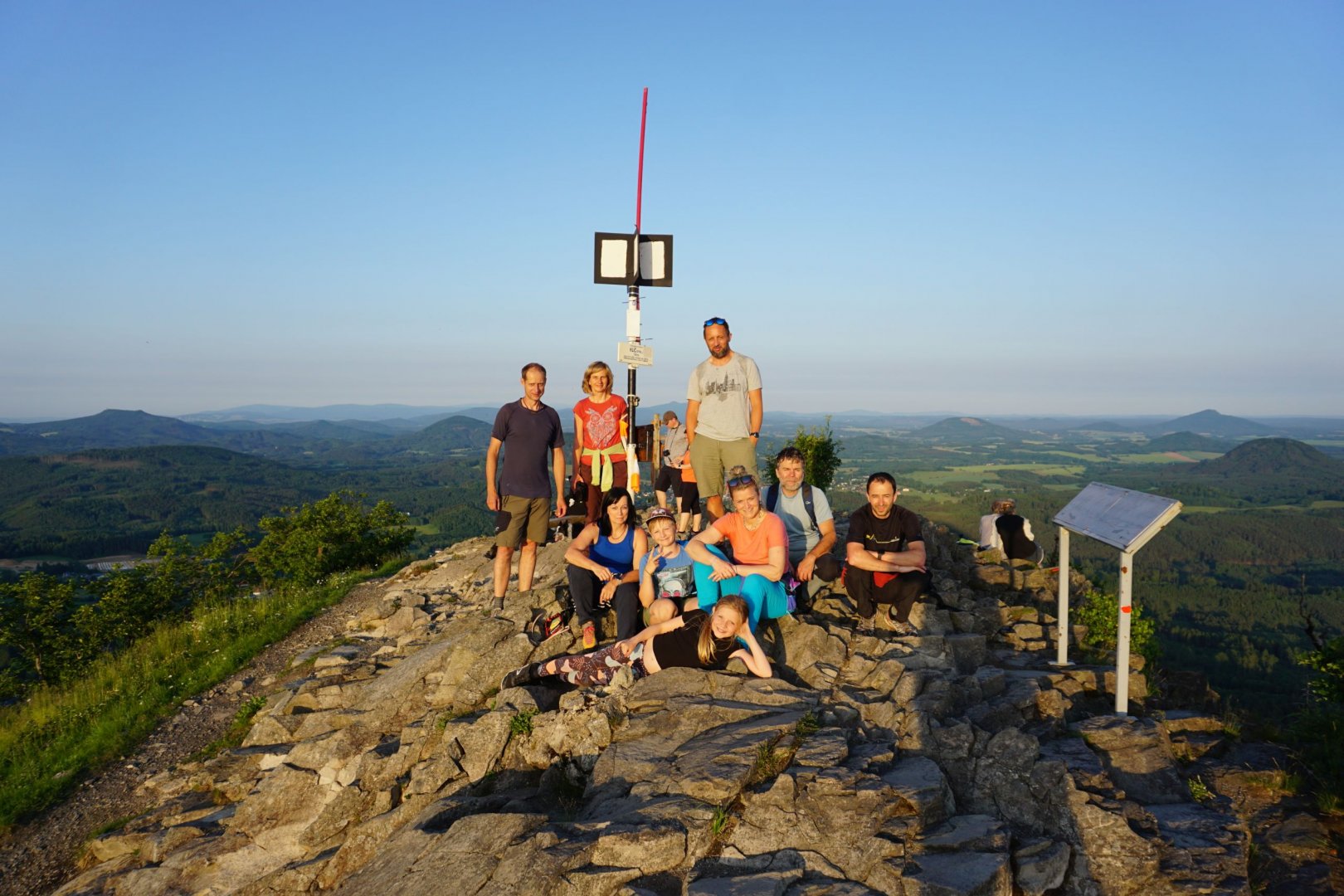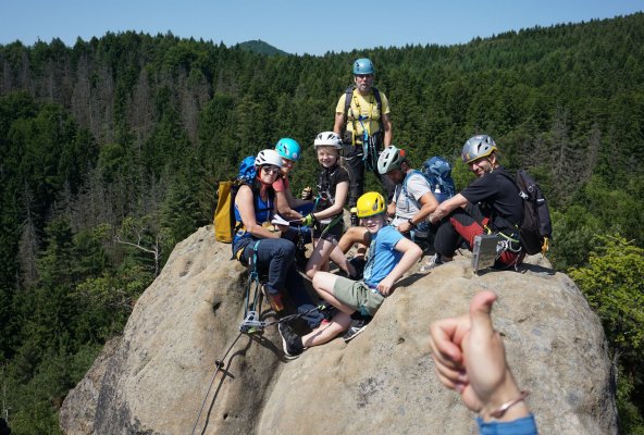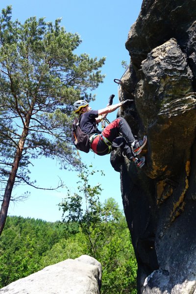 Je sobota a ráno opět začínám procházkou okolo opevnění. Po snídani vyrážíme směr ferrata Zadrátovaná jeptiška v Německu. Parkujeme v Dolní Světlé a cestou obhlížíme věže Falkenstein a Krkavčí kameny na hranici. Dvouhodinovou ferratu si všichni náležitě užíváme a cestou zpět se zastavujeme u Pomníku obráncům hranic z roku 1938 na česko-německé hranici. V restauraci U Nás dáváme zasloužený oběd a jedeme na chatu. Na večer je v plánu západ slunce na Klíči, ale ještě máme čas a tak jdeme lézt. Cestou na Klíč slyším z povzdálí dětský křik a začínám být poněkud neklidný. Kopec Klíč (760 m) je čtvrtý nejvyšší vrchol Lužických hor a je to výrazný znělcový kužel. Klíč je magické místo, kam se chodí na východy a západy slunce, magický je ale jen do chvíle, než ho zaplní stovka dětí z nedalekého tábora. Abychom vydrželi do západu, dali jsme si ořechovku, kterou nám nechal na chatě Stelda (díky ti). Děti nakonec odešly a my jsme si užili západ slunce v klidu, jaký jsme očekávali. Po návratu na chatu rozděláváme oheň a Petra balí vynikající Hermelíny do alobalu. Sedíme u ohně unavení, ale spokojení. Je neděle brzo ráno a s Fousem vyrážím na poslední lezení na Smrtku, za chvilku přichází ještě Charli a dáváme si ještě pár cest. Zanedlouho přicházejí další z chaty a lezení pokračuje dál. Já s Fousem opouštíme skupinu a jdeme balit. Spolu s ostatníma uklízíme chatu a loučíme se. Petru láká Popova vyhlídka, tak ještě malá dvouapůlhodinová procházka a jedeme domů. Cestou povinná zastávka v Hořicích pro trubičky a večer jsem doma. Výlet hodnotím jako velice zdařilý, děkuji všem za hezkou atmosféru a kam příští rok?