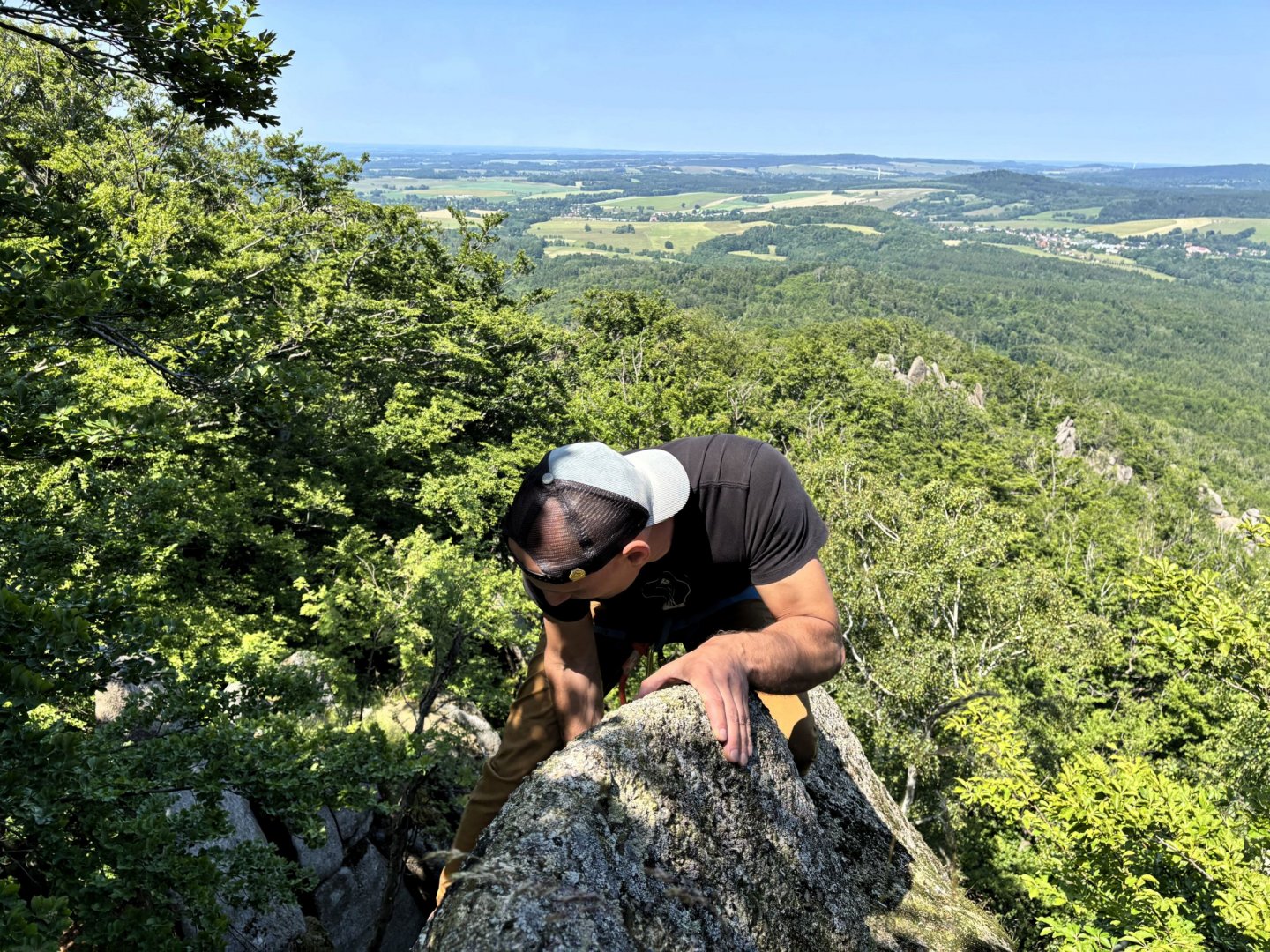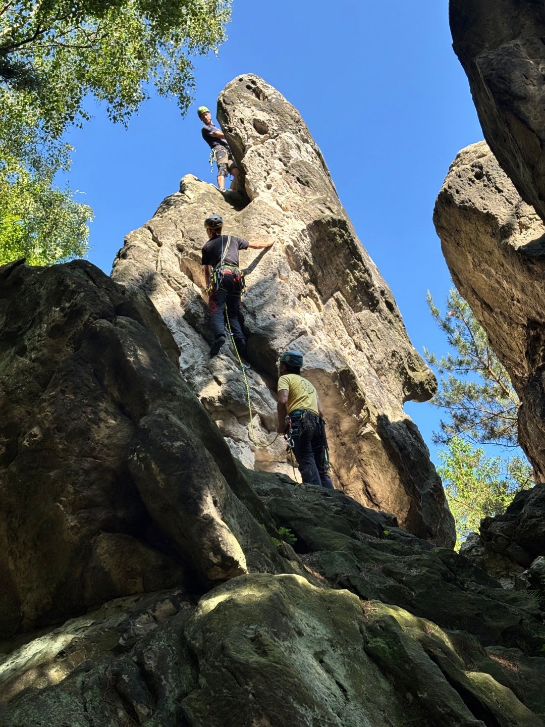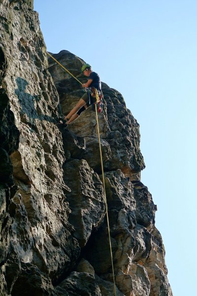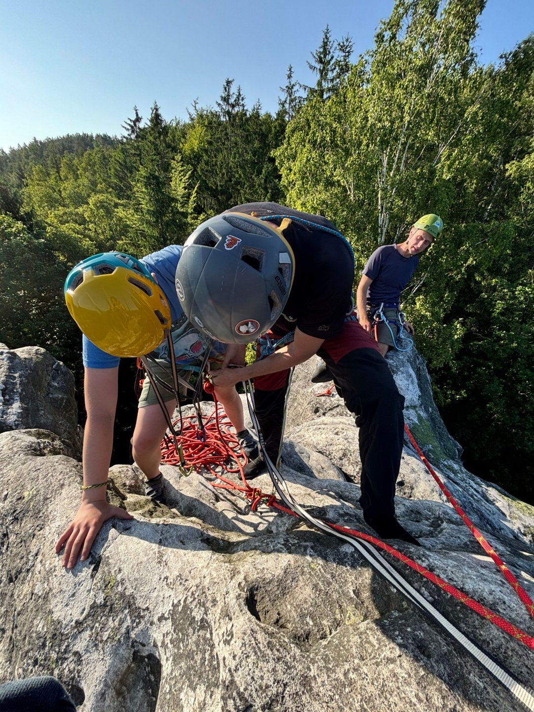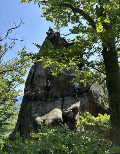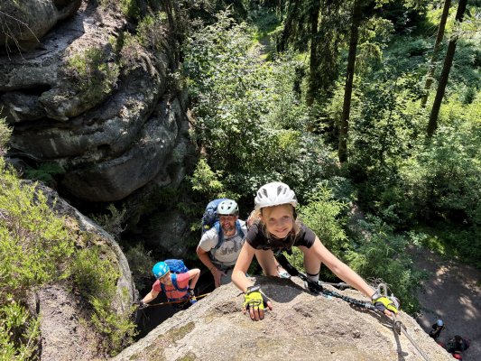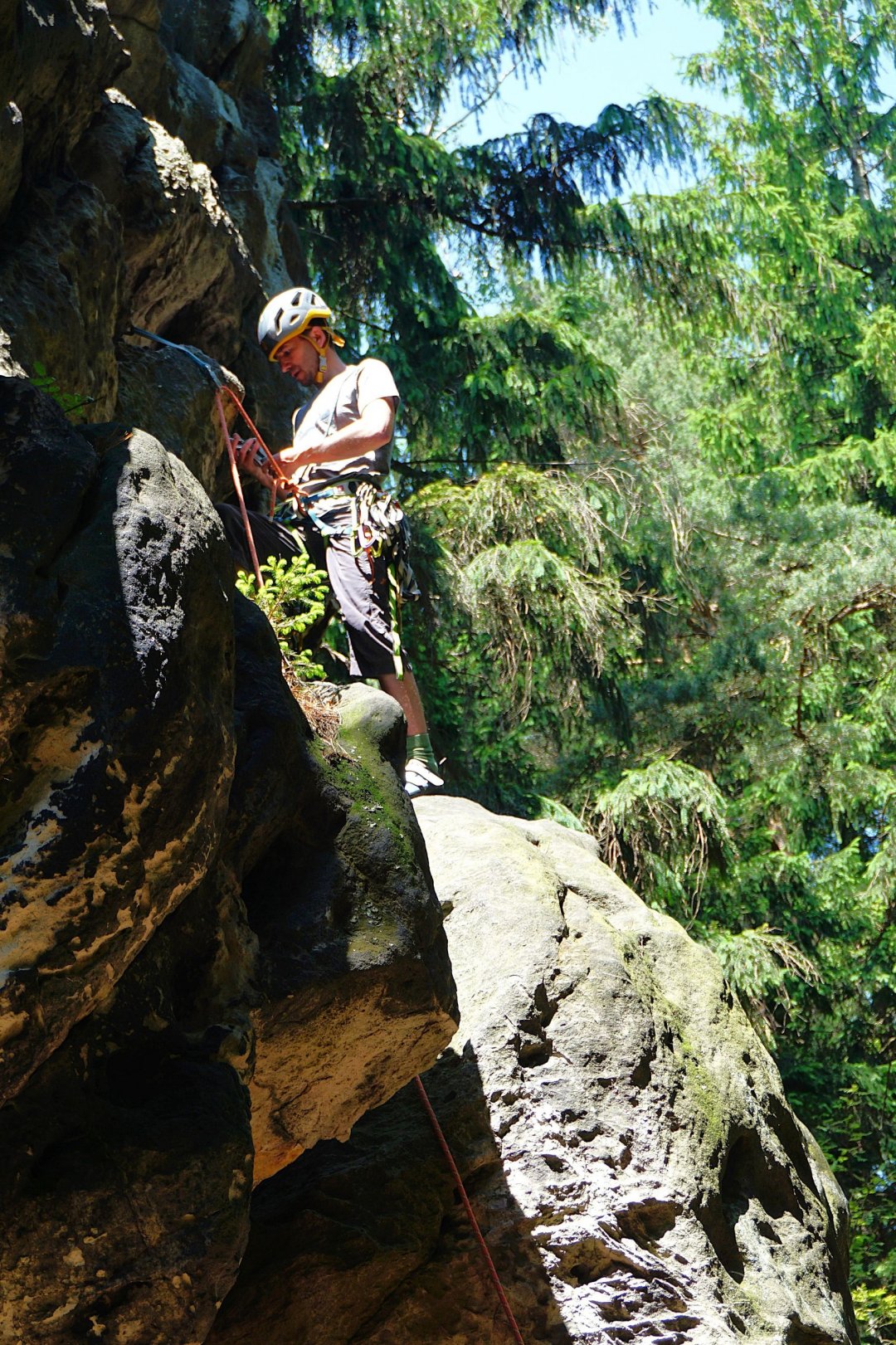 Je sobota a ráno opět začínám procházkou okolo opevnění. Po snídani vyrážíme směr ferrata Zadrátovaná jeptiška v Německu. Parkujeme v Dolní Světlé a cestou obhlížíme věže Falkenstein a Krkavčí kameny na hranici. Dvouhodinovou ferratu si všichni náležitě užíváme a cestou zpět se zastavujeme u Pomníku obráncům hranic z roku 1938 na česko-německé hranici. V restauraci U Nás dáváme zasloužený oběd a jedeme na chatu. Na večer je v plánu západ slunce na Klíči, ale ještě máme čas a tak jdeme lézt. Cestou na Klíč slyším z povzdálí dětský křik a začínám být poněkud neklidný. Kopec Klíč (760 m) je čtvrtý nejvyšší vrchol Lužických hor a je to výrazný znělcový kužel. Klíč je magické místo, kam se chodí na východy a západy slunce, magický je ale jen do chvíle, než ho zaplní stovka dětí z nedalekého tábora. Abychom vydrželi do západu, dali jsme si ořechovku, kterou nám nechal na chatě Stelda (díky ti). Děti nakonec odešly a my jsme si užili západ slunce v klidu, jaký jsme očekávali. Po návratu na chatu rozděláváme oheň a Petra balí vynikající Hermelíny do alobalu. Sedíme u ohně unavení, ale spokojení. Je neděle brzo ráno a s Fousem vyrážím na poslední lezení na Smrtku, za chvilku přichází ještě Charli a dáváme si ještě pár cest. Zanedlouho přicházejí další z chaty a lezení pokračuje dál. Já s Fousem opouštíme skupinu a jdeme balit. Spolu s ostatníma uklízíme chatu a loučíme se. Petru láká Popova vyhlídka, tak ještě malá dvouapůlhodinová procházka a jedeme domů. Cestou povinná zastávka v Hořicích pro trubičky a večer jsem doma. Výlet hodnotím jako velice zdařilý, děkuji všem za hezkou atmosféru a kam příští rok?
