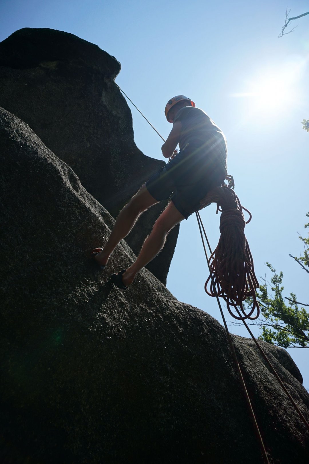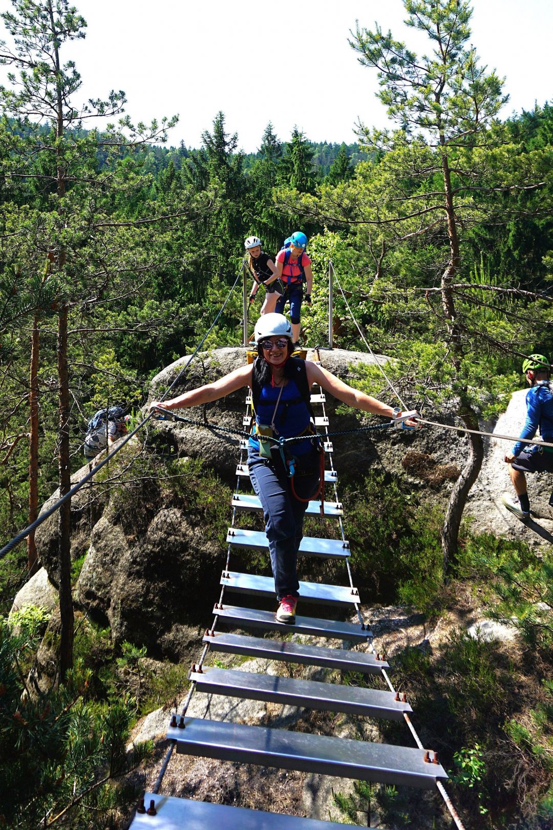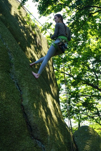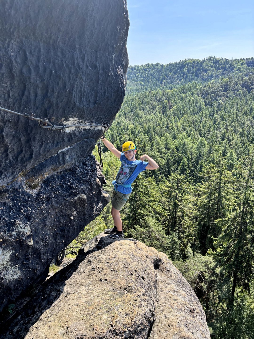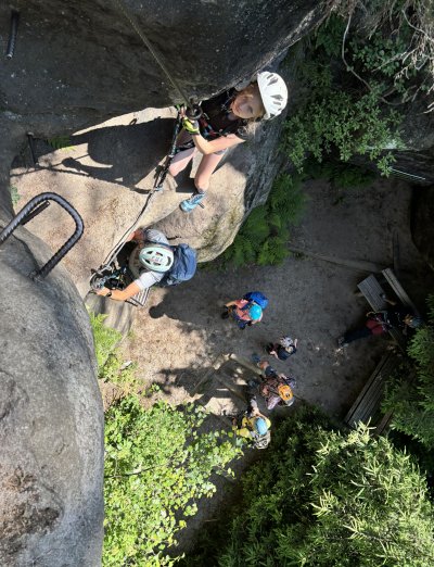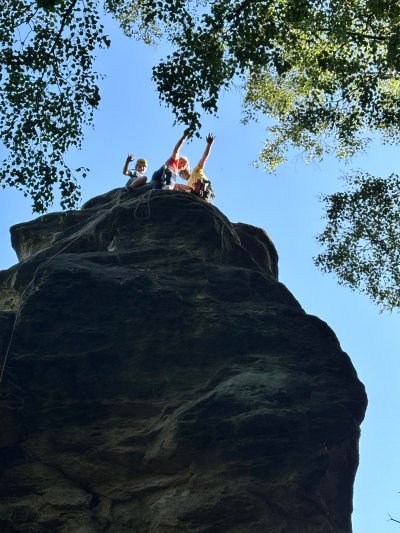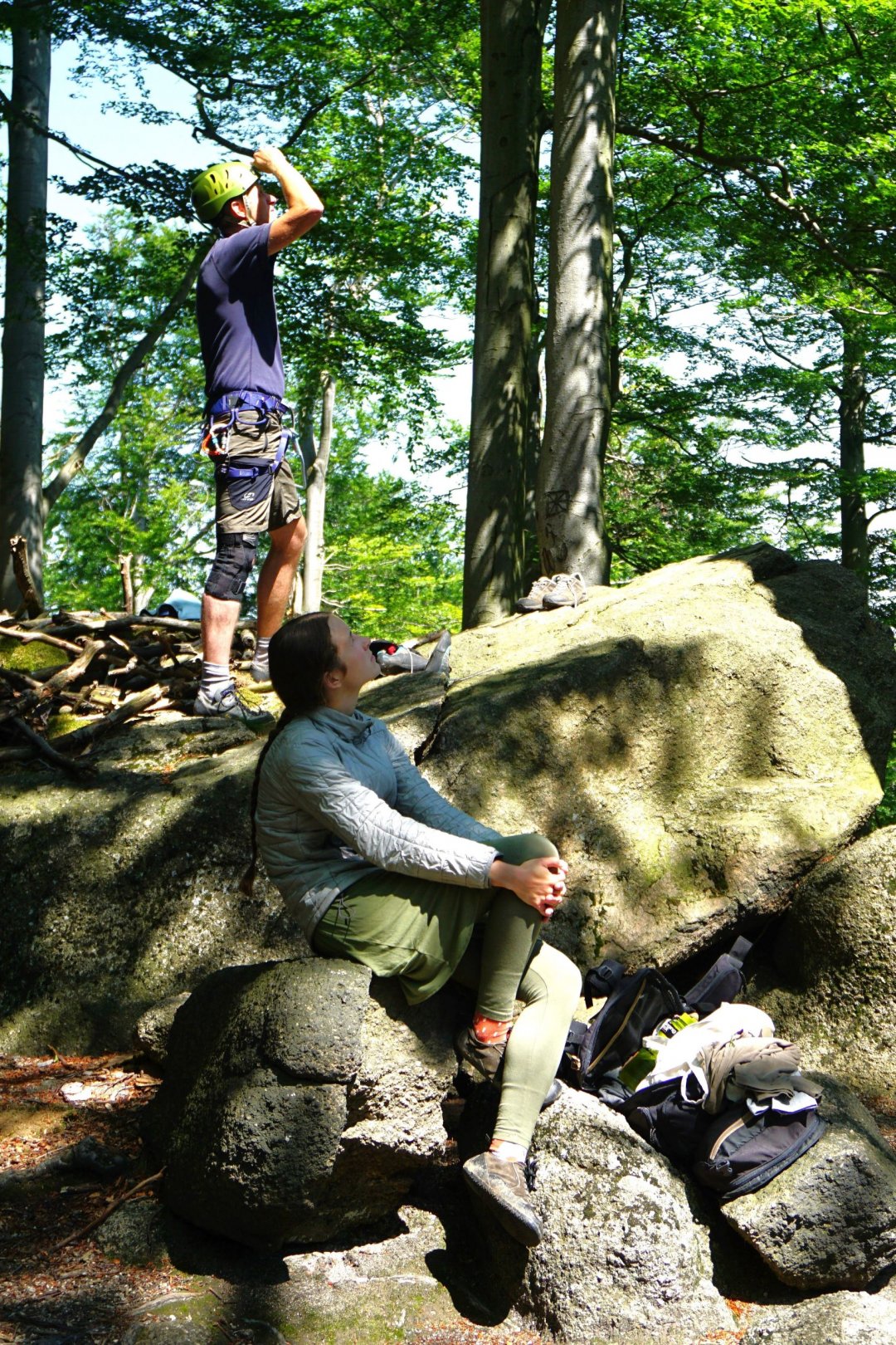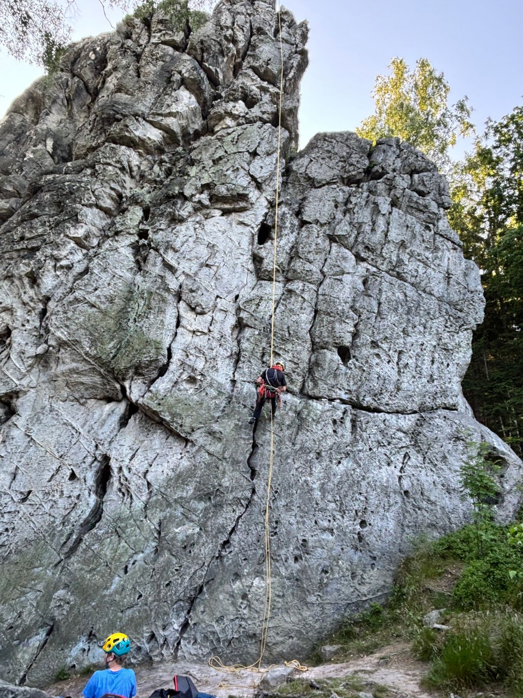 Je sobota a ráno opět začínám procházkou okolo opevnění. Po snídani vyrážíme směr ferrata Zadrátovaná jeptiška v Německu. Parkujeme v Dolní Světlé a cestou obhlížíme věže Falkenstein a Krkavčí kameny na hranici. Dvouhodinovou ferratu si všichni náležitě užíváme a cestou zpět se zastavujeme u Pomníku obráncům hranic z roku 1938 na česko-německé hranici. V restauraci U Nás dáváme zasloužený oběd a jedeme na chatu. Na večer je v plánu západ slunce na Klíči, ale ještě máme čas a tak jdeme lézt. Cestou na Klíč slyším z povzdálí dětský křik a začínám být poněkud neklidný. Kopec Klíč (760 m) je čtvrtý nejvyšší vrchol Lužických hor a je to výrazný znělcový kužel. Klíč je magické místo, kam se chodí na východy a západy slunce, magický je ale jen do chvíle, než ho zaplní stovka dětí z nedalekého tábora. Abychom vydrželi do západu, dali jsme si ořechovku, kterou nám nechal na chatě Stelda (díky ti). Děti nakonec odešly a my jsme si užili západ slunce v klidu, jaký jsme očekávali. Po návratu na chatu rozděláváme oheň a Petra balí vynikající Hermelíny do alobalu. Sedíme u ohně unavení, ale spokojení. Je neděle brzo ráno a s Fousem vyrážím na poslední lezení na Smrtku, za chvilku přichází ještě Charli a dáváme si ještě pár cest. Zanedlouho přicházejí další z chaty a lezení pokračuje dál. Já s Fousem opouštíme skupinu a jdeme balit. Spolu s ostatníma uklízíme chatu a loučíme se. Petru láká Popova vyhlídka, tak ještě malá dvouapůlhodinová procházka a jedeme domů. Cestou povinná zastávka v Hořicích pro trubičky a večer jsem doma. Výlet hodnotím jako velice zdařilý, děkuji všem za hezkou atmosféru a kam příští rok?