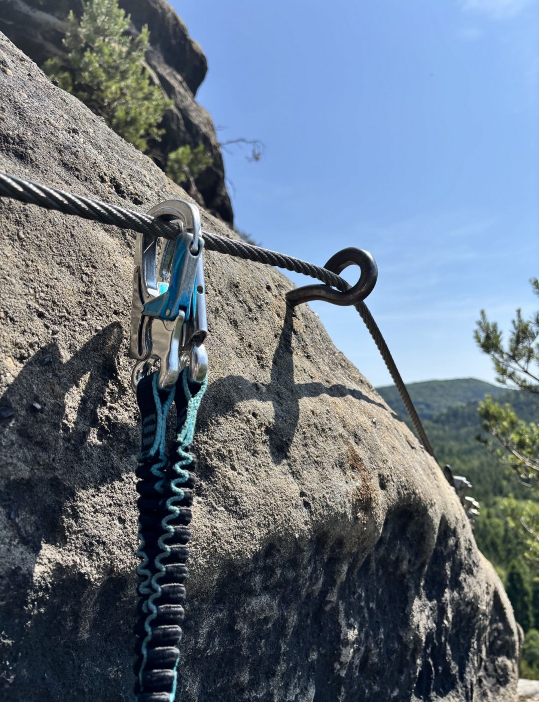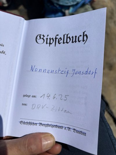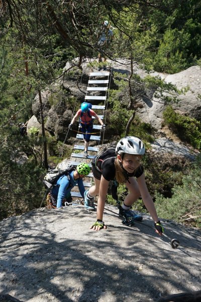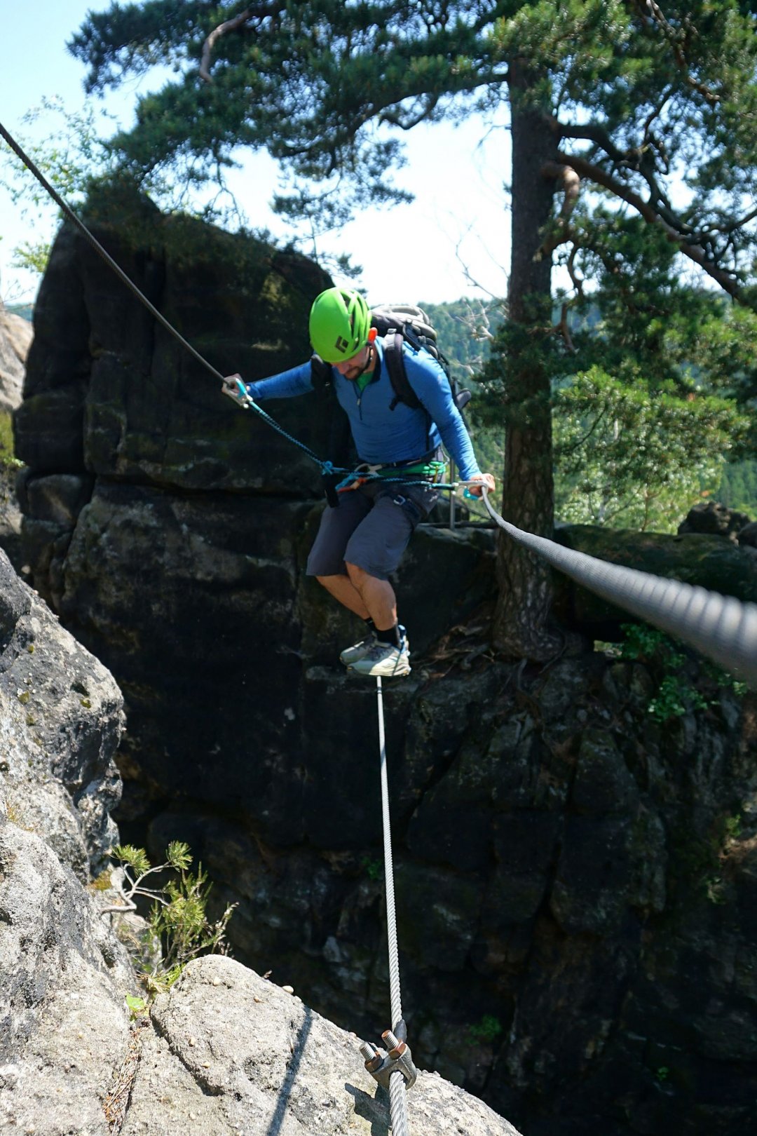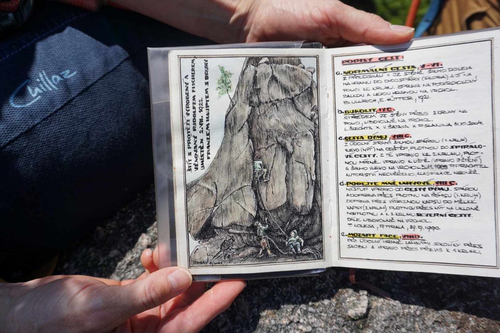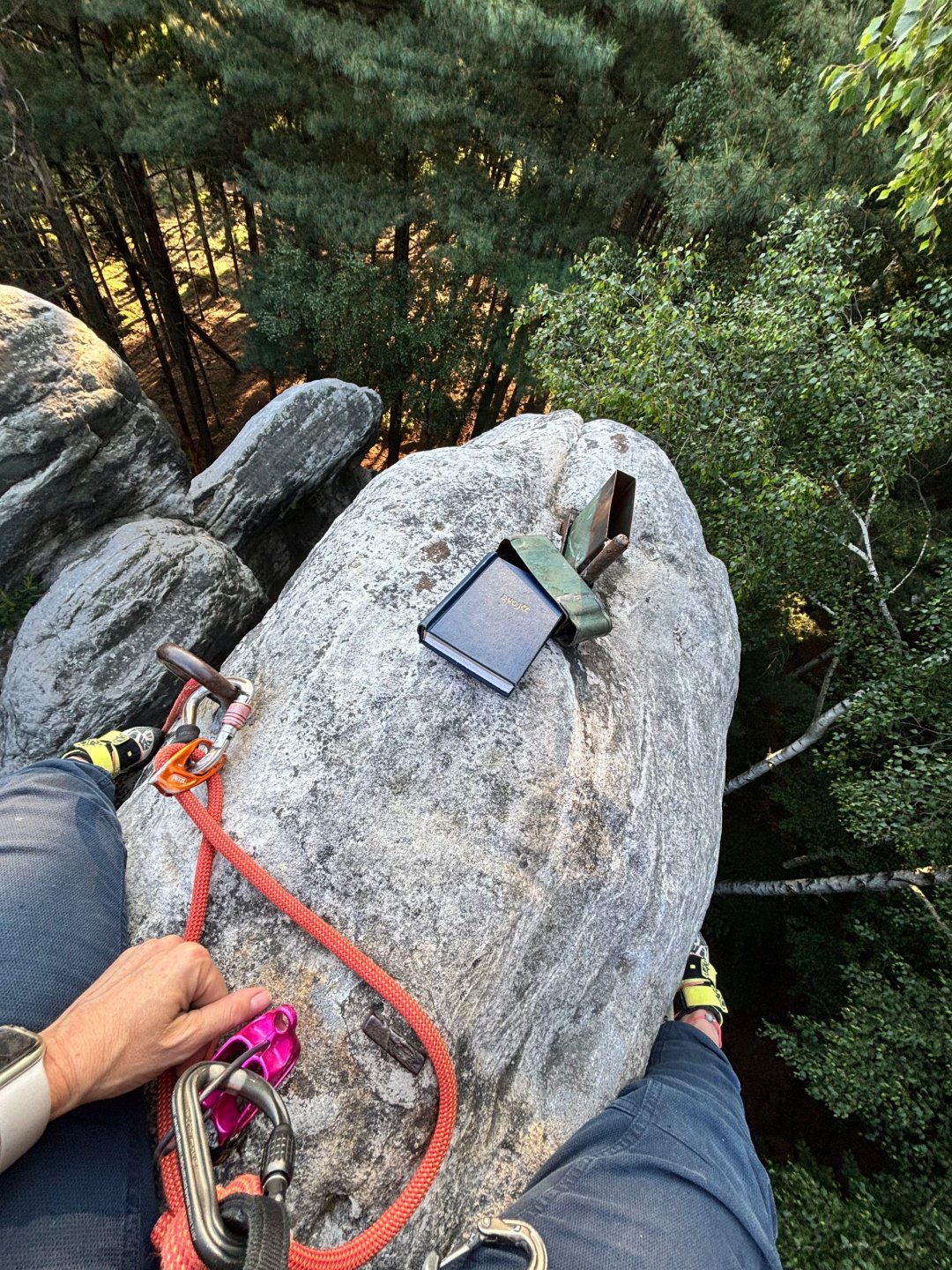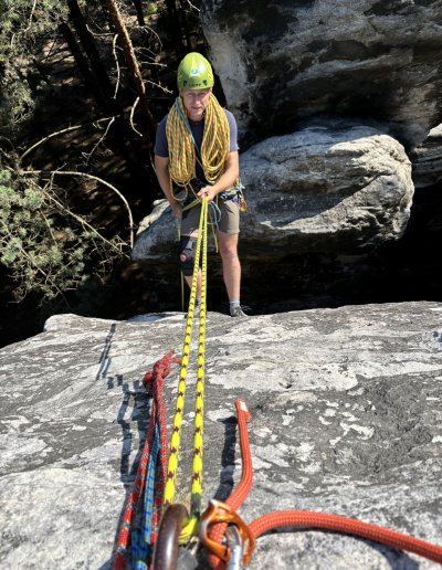 Je sobota a ráno opět začínám procházkou okolo opevnění. Po snídani vyrážíme směr ferrata Zadrátovaná jeptiška v Německu. Parkujeme v Dolní Světlé a cestou obhlížíme věže Falkenstein a Krkavčí kameny na hranici. Dvouhodinovou ferratu si všichni náležitě užíváme a cestou zpět se zastavujeme u Pomníku obráncům hranic z roku 1938 na česko-německé hranici. V restauraci U Nás dáváme zasloužený oběd a jedeme na chatu. Na večer je v plánu západ slunce na Klíči, ale ještě máme čas a tak jdeme lézt. Cestou na Klíč slyším z povzdálí dětský křik a začínám být poněkud neklidný. Kopec Klíč (760 m) je čtvrtý nejvyšší vrchol Lužických hor a je to výrazný znělcový kužel. Klíč je magické místo, kam se chodí na východy a západy slunce, magický je ale jen do chvíle, než ho zaplní stovka dětí z nedalekého tábora. Abychom vydrželi do západu, dali jsme si ořechovku, kterou nám nechal na chatě Stelda (díky ti). Děti nakonec odešly a my jsme si užili západ slunce v klidu, jaký jsme očekávali. Po návratu na chatu rozděláváme oheň a Petra balí vynikající Hermelíny do alobalu. Sedíme u ohně unavení, ale spokojení. Je neděle brzo ráno a s Fousem vyrážím na poslední lezení na Smrtku, za chvilku přichází ještě Charli a dáváme si ještě pár cest. Zanedlouho přicházejí další z chaty a lezení pokračuje dál. Já s Fousem opouštíme skupinu a jdeme balit. Spolu s ostatníma uklízíme chatu a loučíme se. Petru láká Popova vyhlídka, tak ještě malá dvouapůlhodinová procházka a jedeme domů. Cestou povinná zastávka v Hořicích pro trubičky a večer jsem doma. Výlet hodnotím jako velice zdařilý, děkuji všem za hezkou atmosféru a kam příští rok?