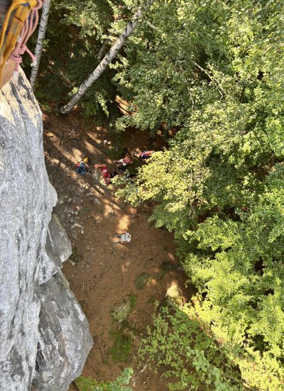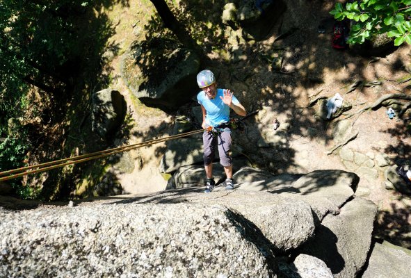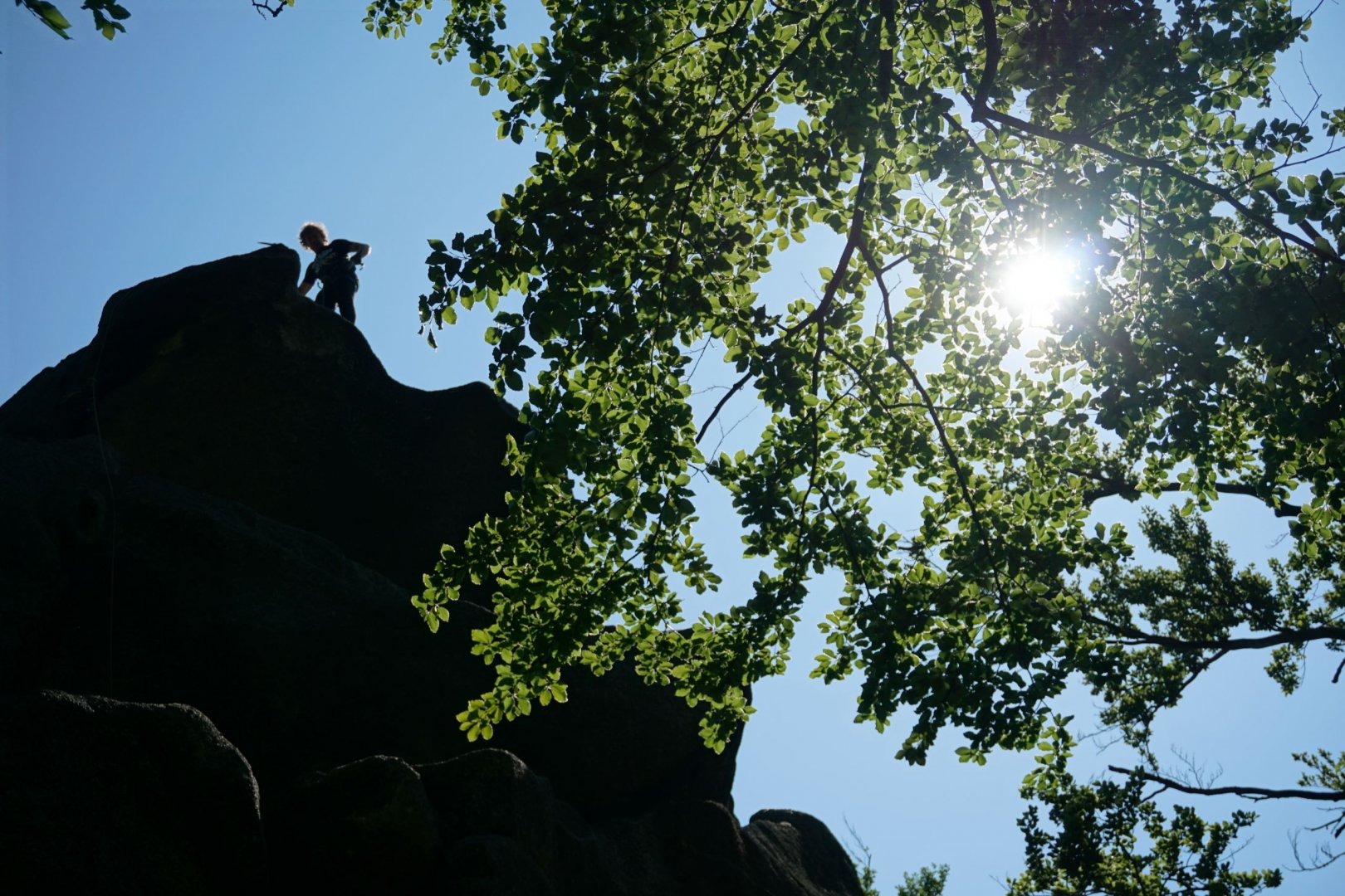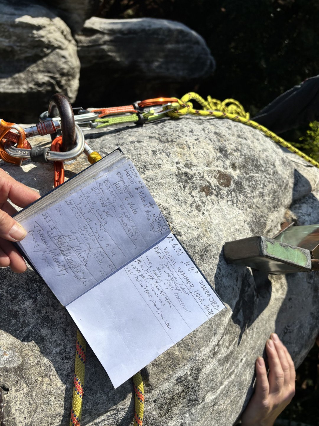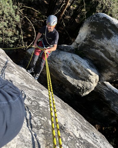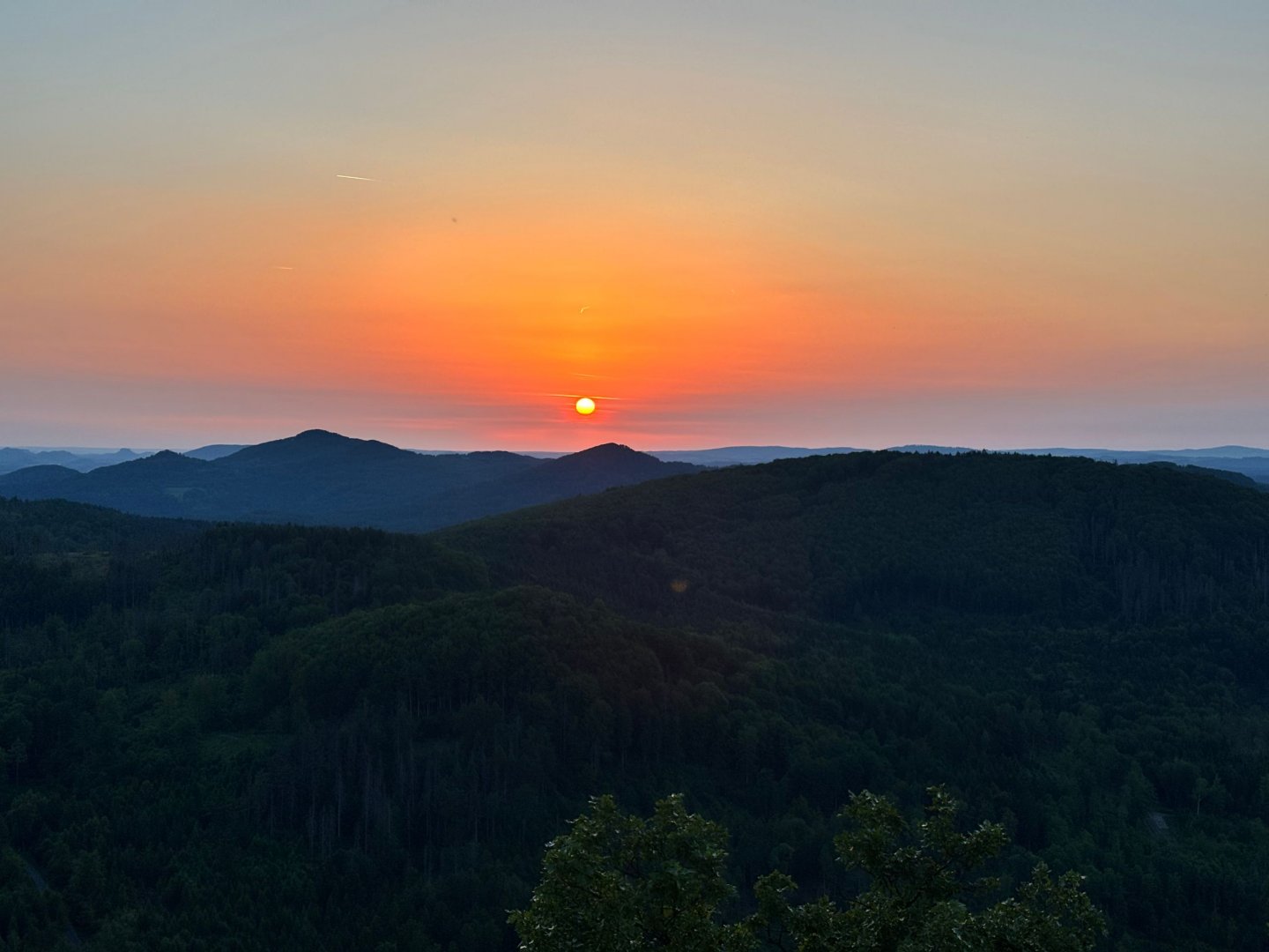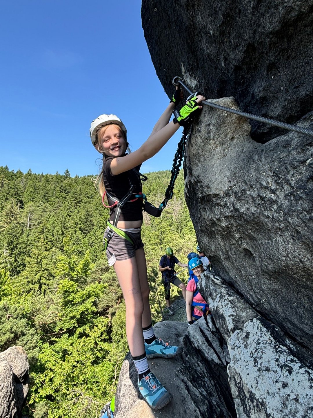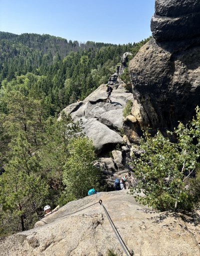 Je sobota a ráno opět začínám procházkou okolo opevnění. Po snídani vyrážíme směr ferrata Zadrátovaná jeptiška v Německu. Parkujeme v Dolní Světlé a cestou obhlížíme věže Falkenstein a Krkavčí kameny na hranici. Dvouhodinovou ferratu si všichni náležitě užíváme a cestou zpět se zastavujeme u Pomníku obráncům hranic z roku 1938 na česko-německé hranici. V restauraci U Nás dáváme zasloužený oběd a jedeme na chatu. Na večer je v plánu západ slunce na Klíči, ale ještě máme čas a tak jdeme lézt. Cestou na Klíč slyším z povzdálí dětský křik a začínám být poněkud neklidný. Kopec Klíč (760 m) je čtvrtý nejvyšší vrchol Lužických hor a je to výrazný znělcový kužel. Klíč je magické místo, kam se chodí na východy a západy slunce, magický je ale jen do chvíle, než ho zaplní stovka dětí z nedalekého tábora. Abychom vydrželi do západu, dali jsme si ořechovku, kterou nám nechal na chatě Stelda (díky ti). Děti nakonec odešly a my jsme si užili západ slunce v klidu, jaký jsme očekávali. Po návratu na chatu rozděláváme oheň a Petra balí vynikající Hermelíny do alobalu. Sedíme u ohně unavení, ale spokojení. Je neděle brzo ráno a s Fousem vyrážím na poslední lezení na Smrtku, za chvilku přichází ještě Charli a dáváme si ještě pár cest. Zanedlouho přicházejí další z chaty a lezení pokračuje dál. Já s Fousem opouštíme skupinu a jdeme balit. Spolu s ostatníma uklízíme chatu a loučíme se. Petru láká Popova vyhlídka, tak ještě malá dvouapůlhodinová procházka a jedeme domů. Cestou povinná zastávka v Hořicích pro trubičky a večer jsem doma. Výlet hodnotím jako velice zdařilý, děkuji všem za hezkou atmosféru a kam příští rok?