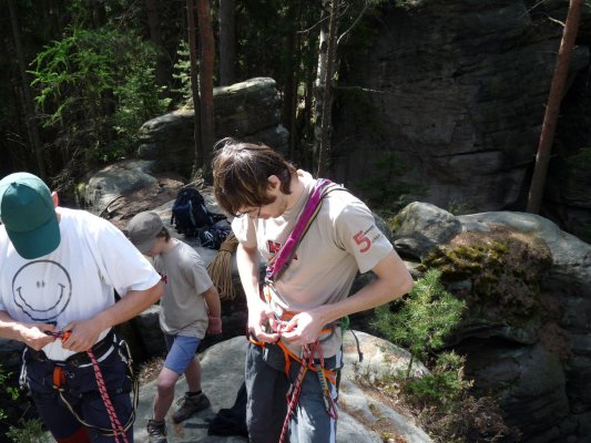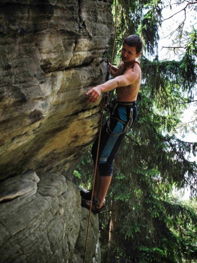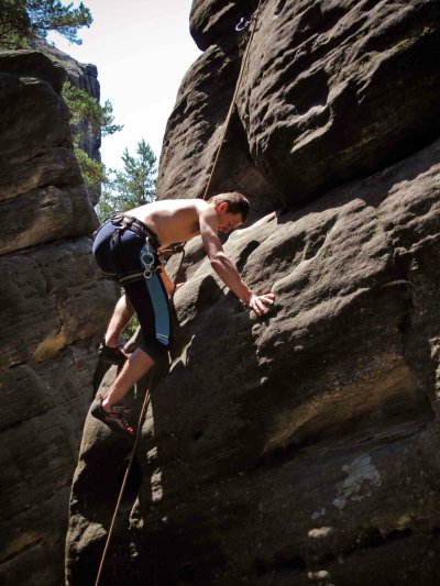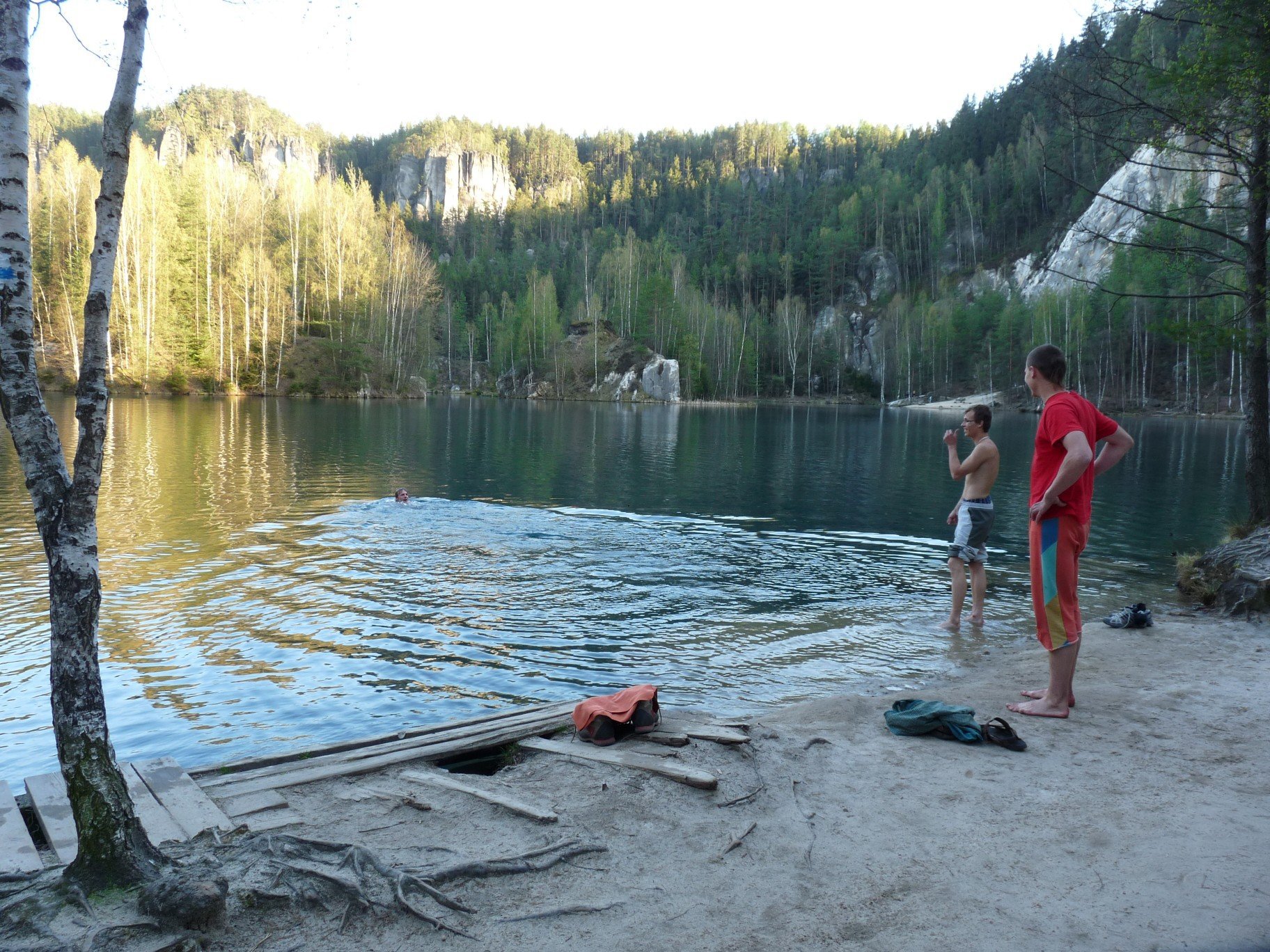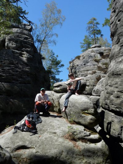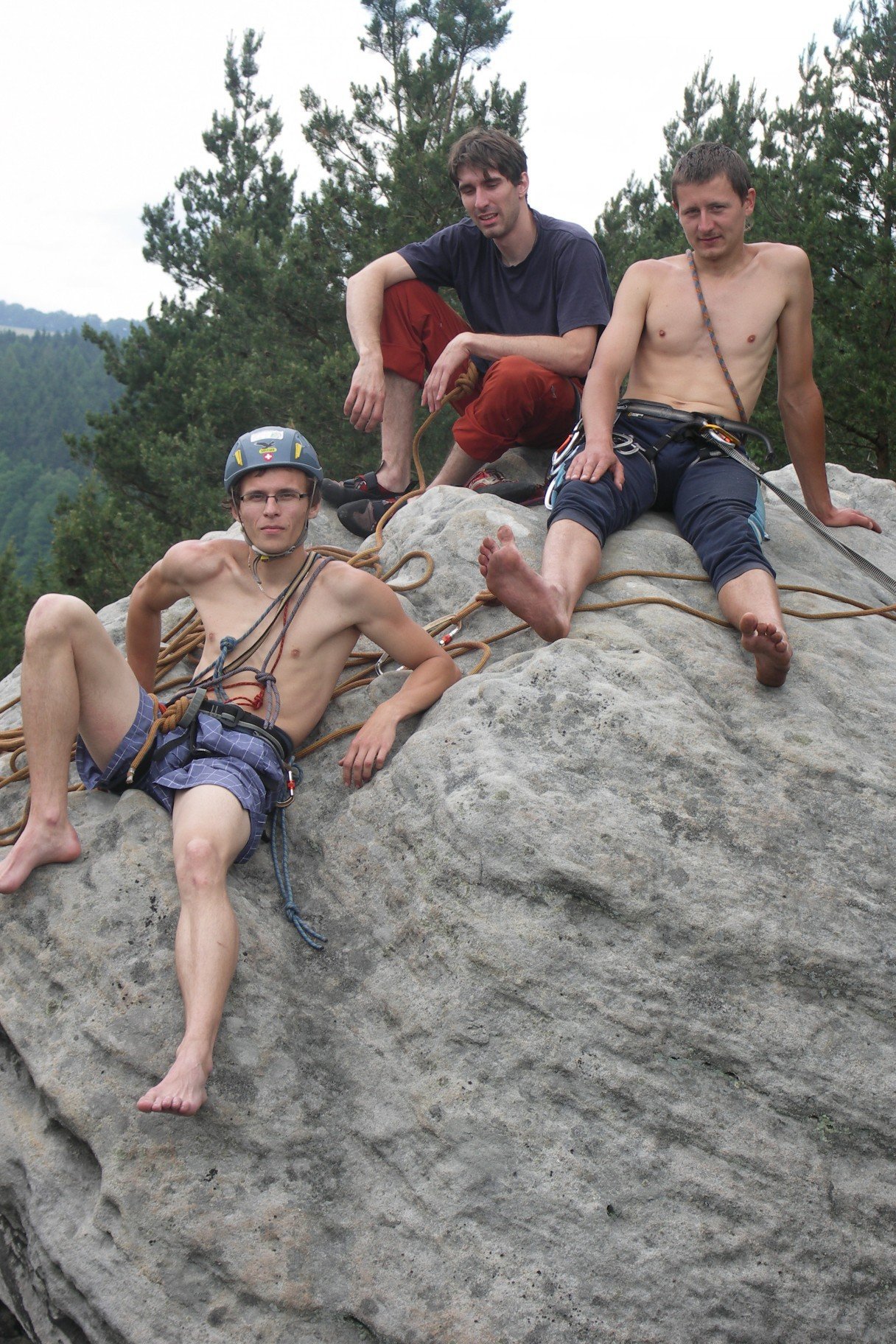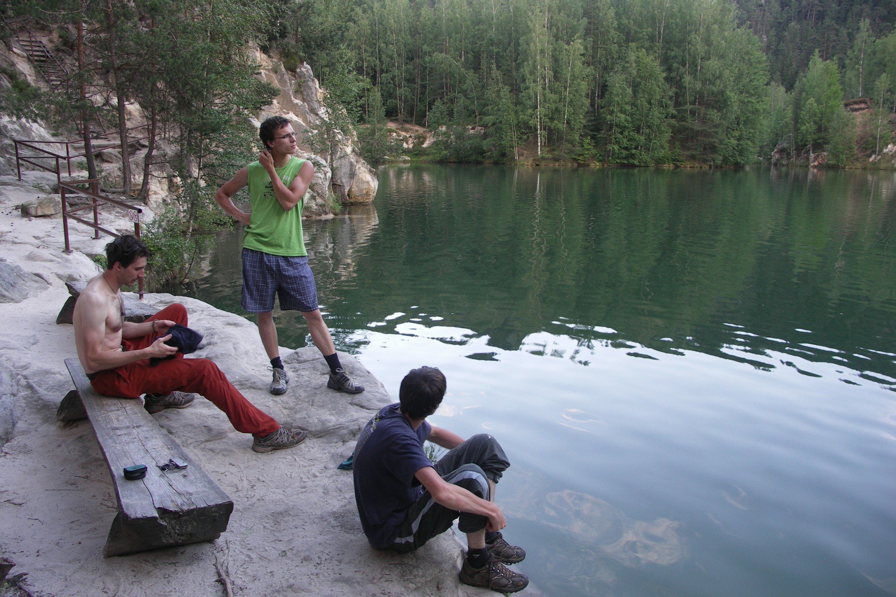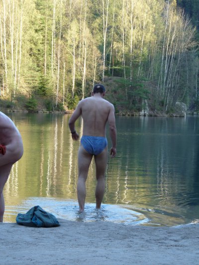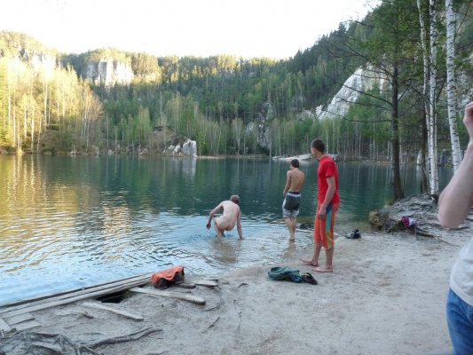 Stěhujeme se zase kousek dál. Na Pevnosti je dost lidí, tak jdeme až k Ústecké a nakonec lezeme nádhernou "Pašeráckou stezku" na Opičí. Ve výlezu je mokrá díra, takže opět trošku strachu a radost z jeho překonání. Tak už to bývá (teda když to dopadne dobře). Máme to tak akorát. Jdeme dolů k jezírku. Někteří chlapci se koupou, já si o jejich zdravím rozumu myslím svý, Danča si je fotí. Ostatně, dneska fotí převážně Danča, konečně budu taky na nějaké fotce, Díky.