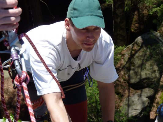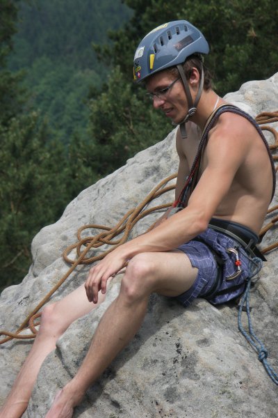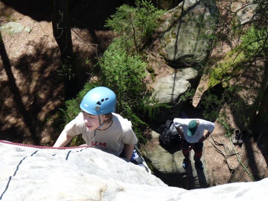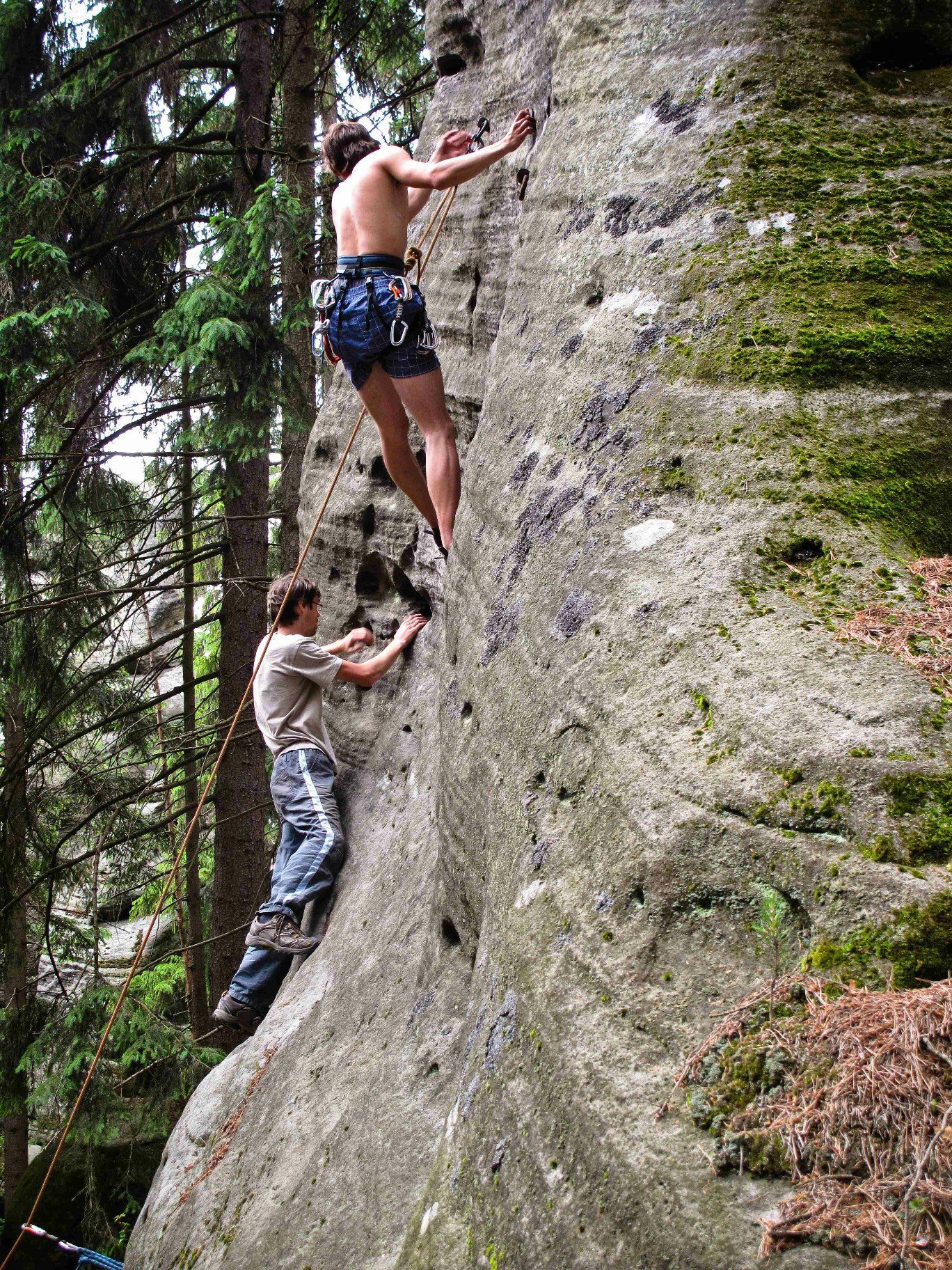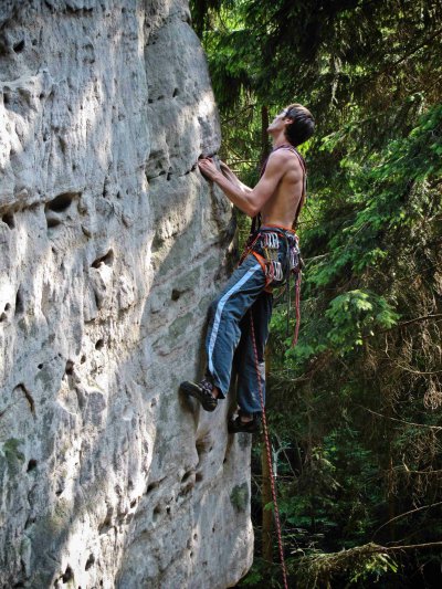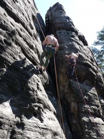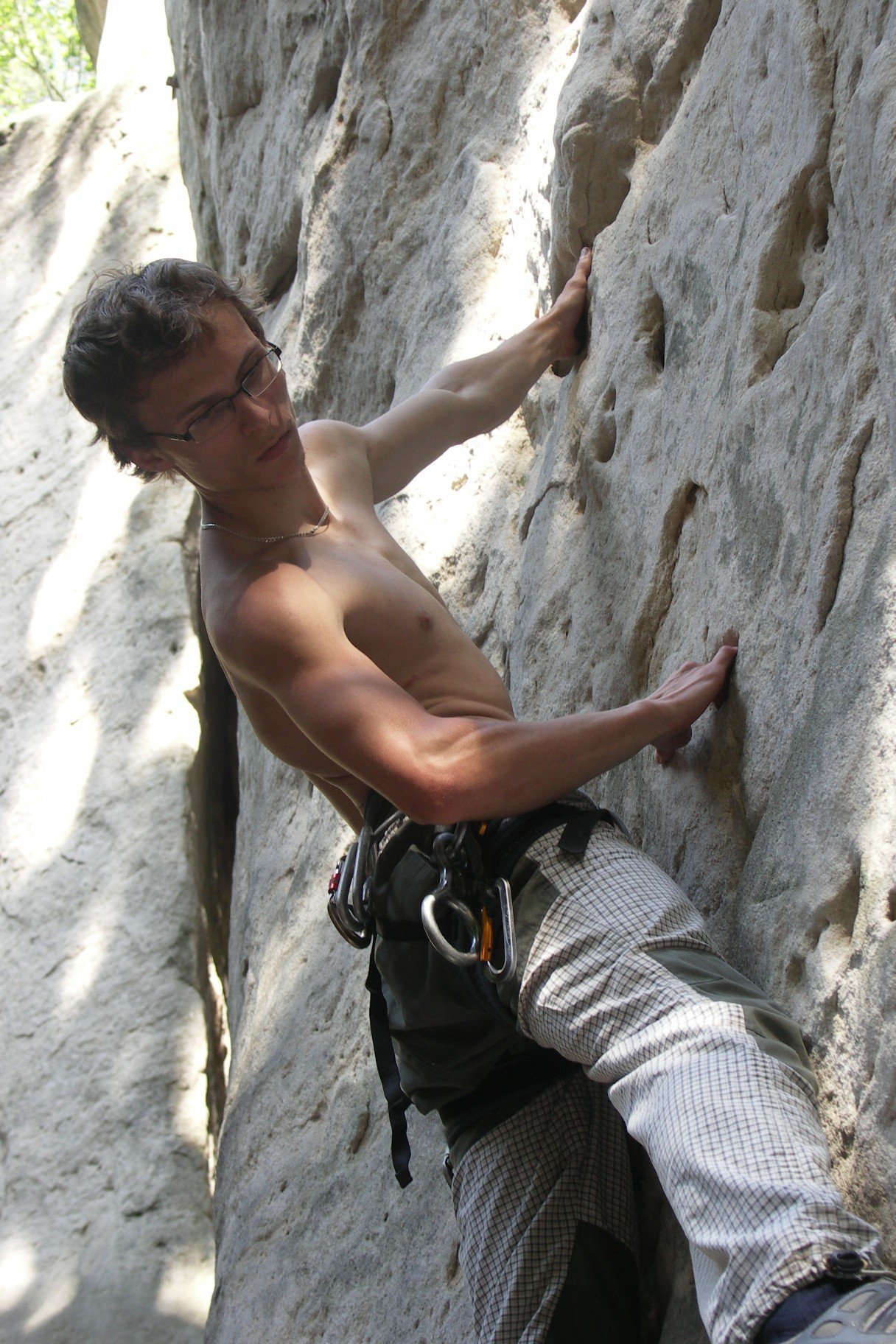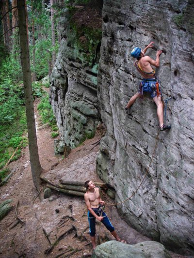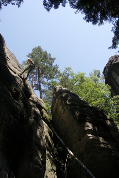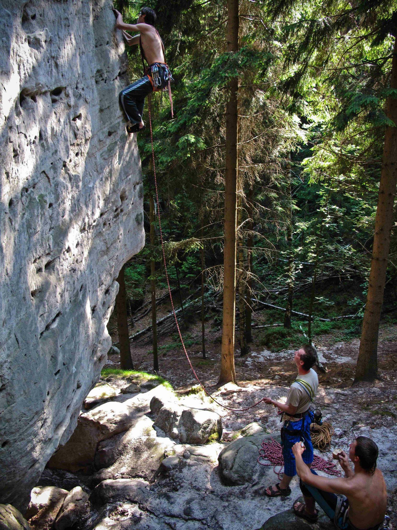 Stěhujeme se zase kousek dál. Na Pevnosti je dost lidí, tak jdeme až k Ústecké a nakonec lezeme nádhernou "Pašeráckou stezku" na Opičí. Ve výlezu je mokrá díra, takže opět trošku strachu a radost z jeho překonání. Tak už to bývá (teda když to dopadne dobře). Máme to tak akorát. Jdeme dolů k jezírku. Někteří chlapci se koupou, já si o jejich zdravím rozumu myslím svý, Danča si je fotí. Ostatně, dneska fotí převážně Danča, konečně budu taky na nějaké fotce, Díky.