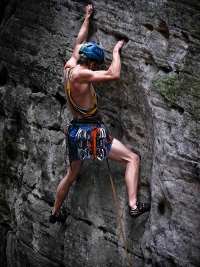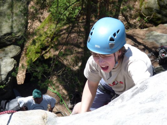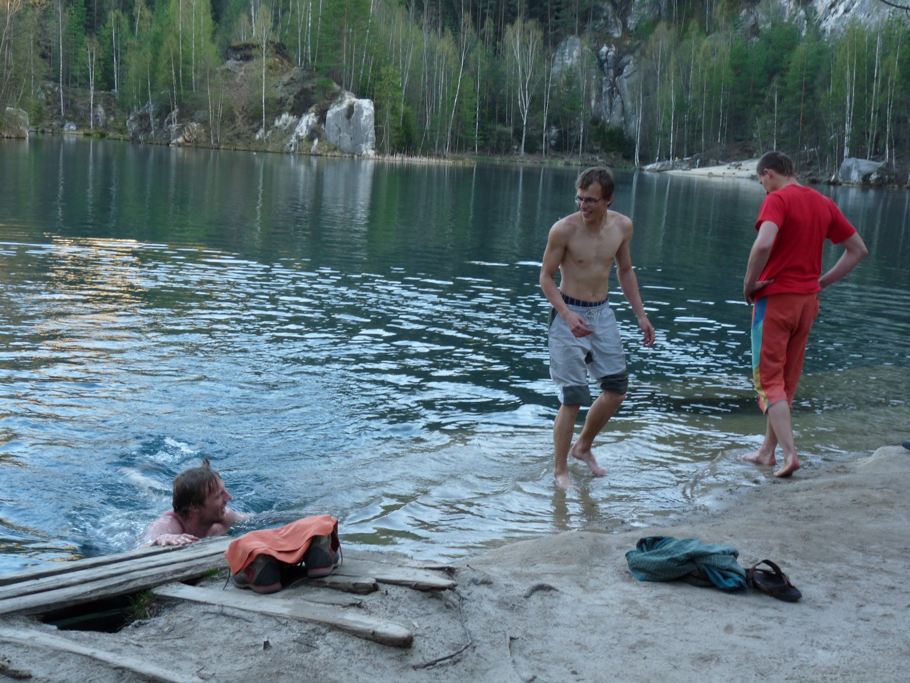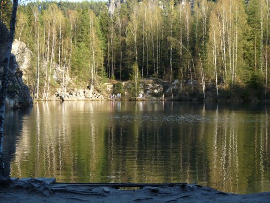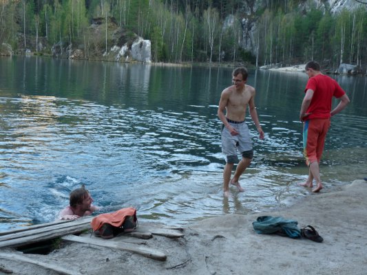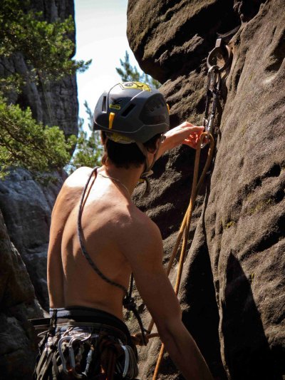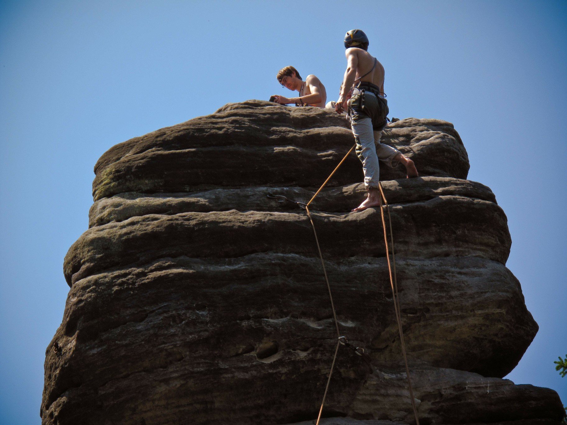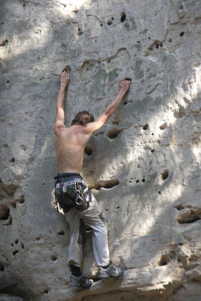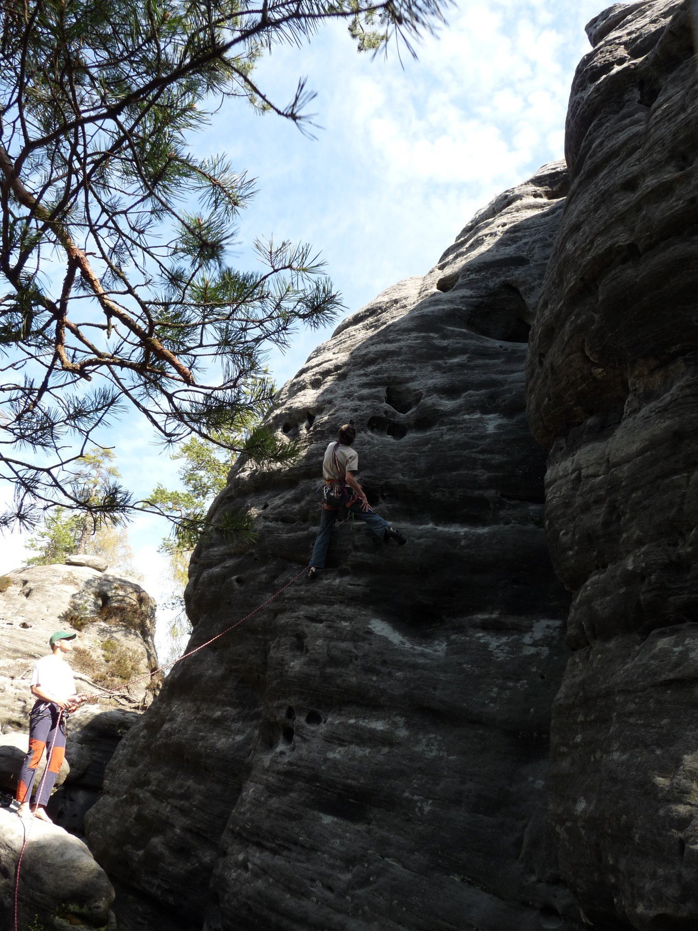 Stěhujeme se zase kousek dál. Na Pevnosti je dost lidí, tak jdeme až k Ústecké a nakonec lezeme nádhernou "Pašeráckou stezku" na Opičí. Ve výlezu je mokrá díra, takže opět trošku strachu a radost z jeho překonání. Tak už to bývá (teda když to dopadne dobře). Máme to tak akorát. Jdeme dolů k jezírku. Někteří chlapci se koupou, já si o jejich zdravím rozumu myslím svý, Danča si je fotí. Ostatně, dneska fotí převážně Danča, konečně budu taky na nějaké fotce, Díky.