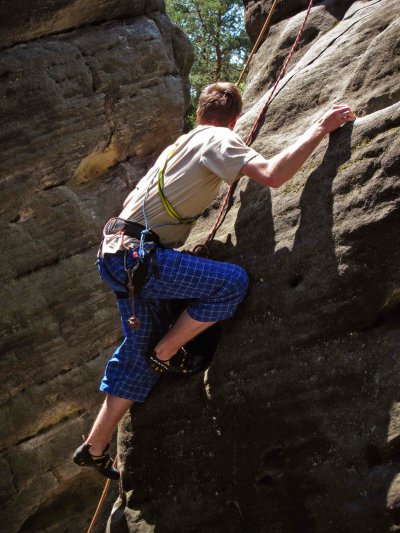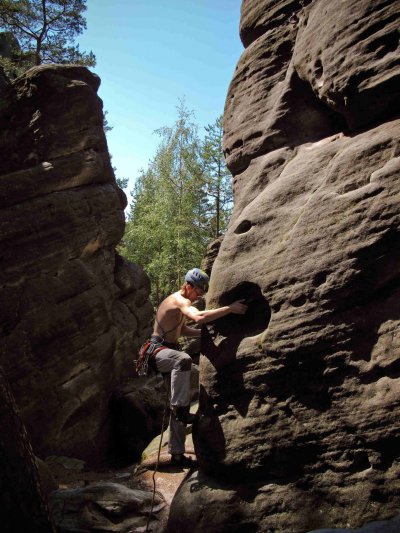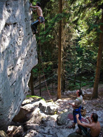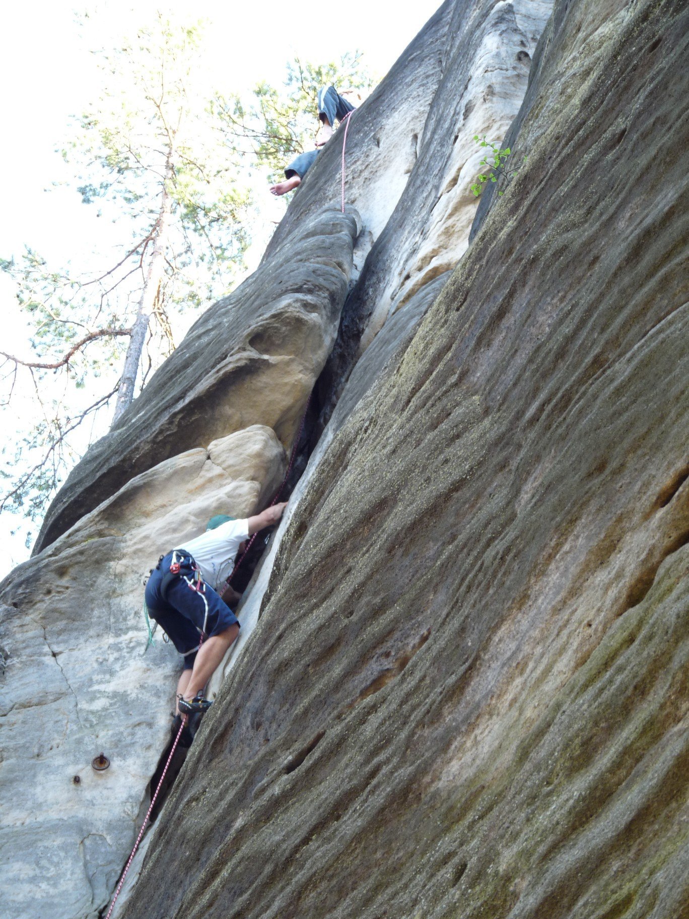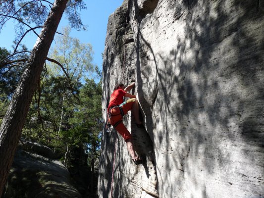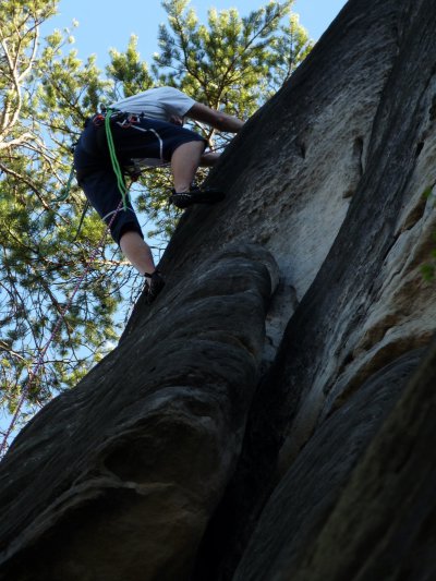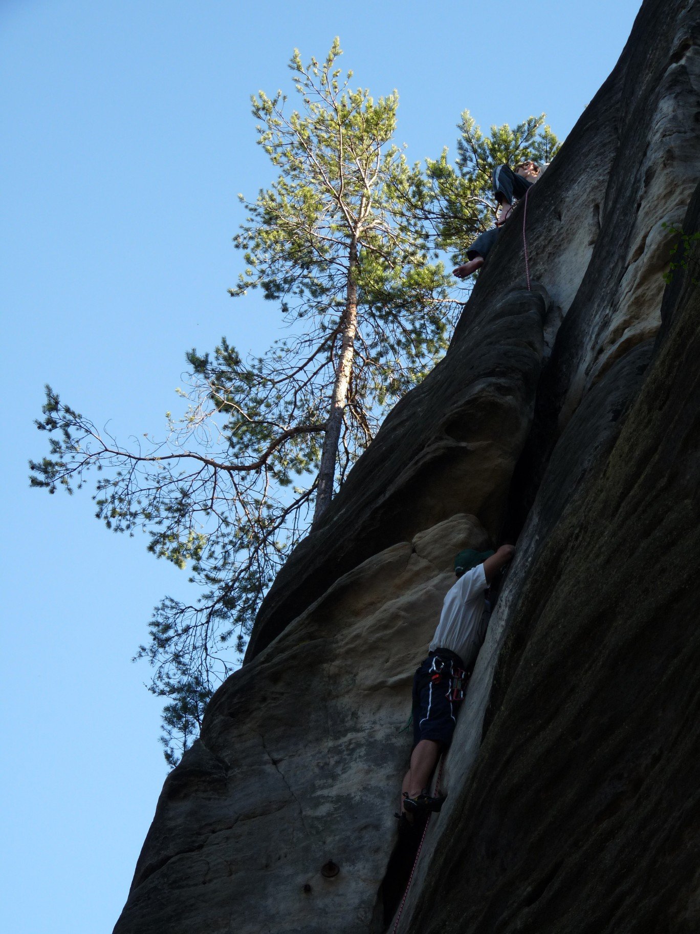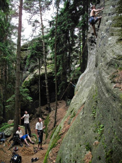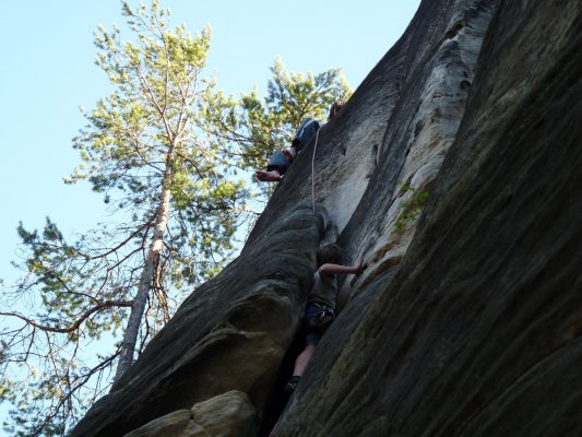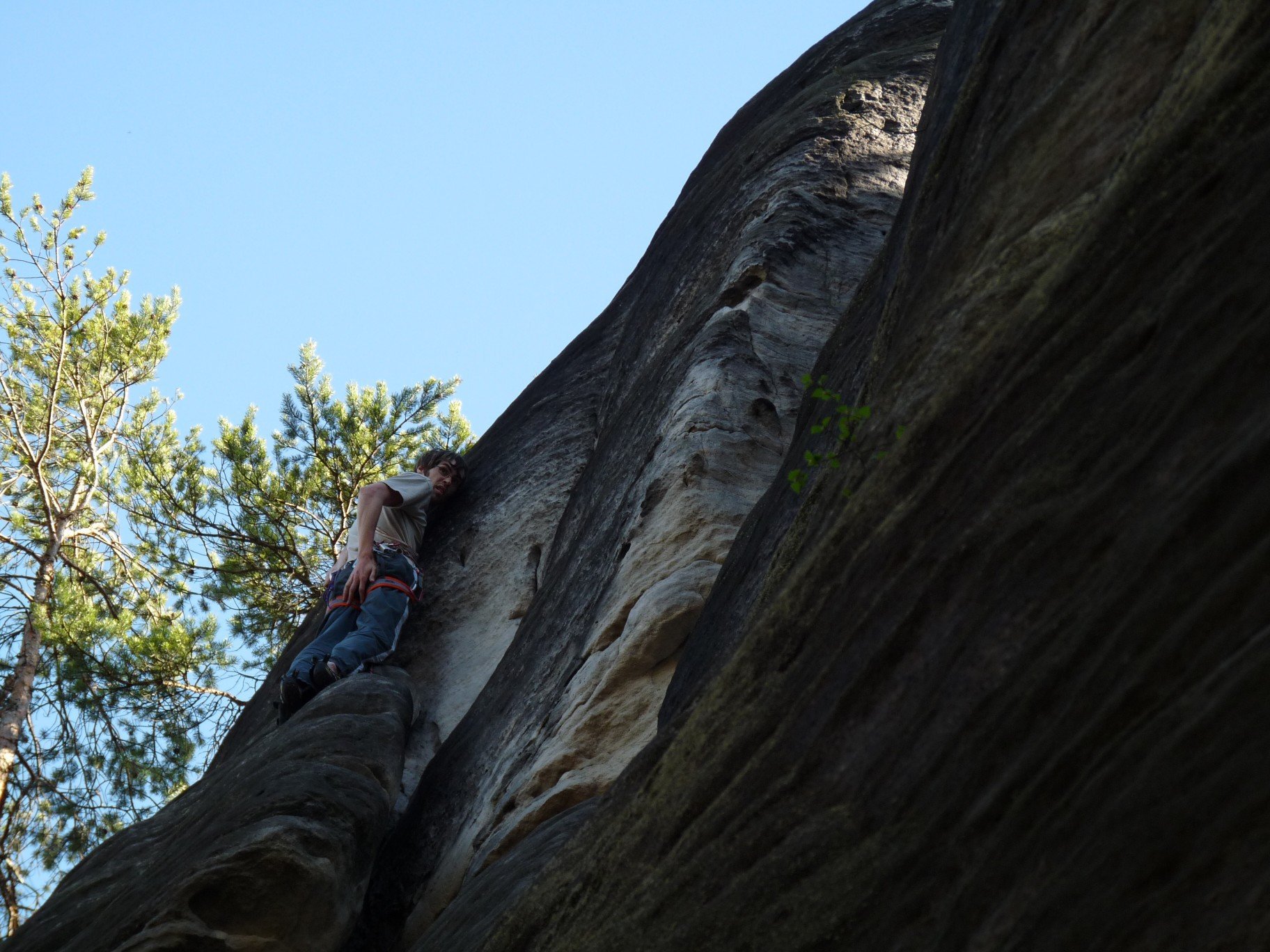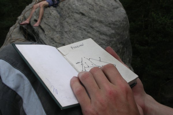 "Přes vřes a mraveniště" bude letos první. Znám ji dobře, lezl jsem ji mnohokrát. Ne vždycky se ale dařilo. Trošku morálu to přecijen chce. Dnes to ale jde. Po chvilce přešlapování, utírání zpocených rukou do kalhot (jsem přece klasik, hlavně po ránu) a hlubokým dechovým cvičení jsem nahoře a mám hroznou radost. Kdybych to uměl, udělám stojku. Michal, Danča i Zbýša jsou tu za chvilku taky. Jistí se sami, já si čtu v knížce. Moc toho tam ale není, je tu od loňskýho podzimu.
