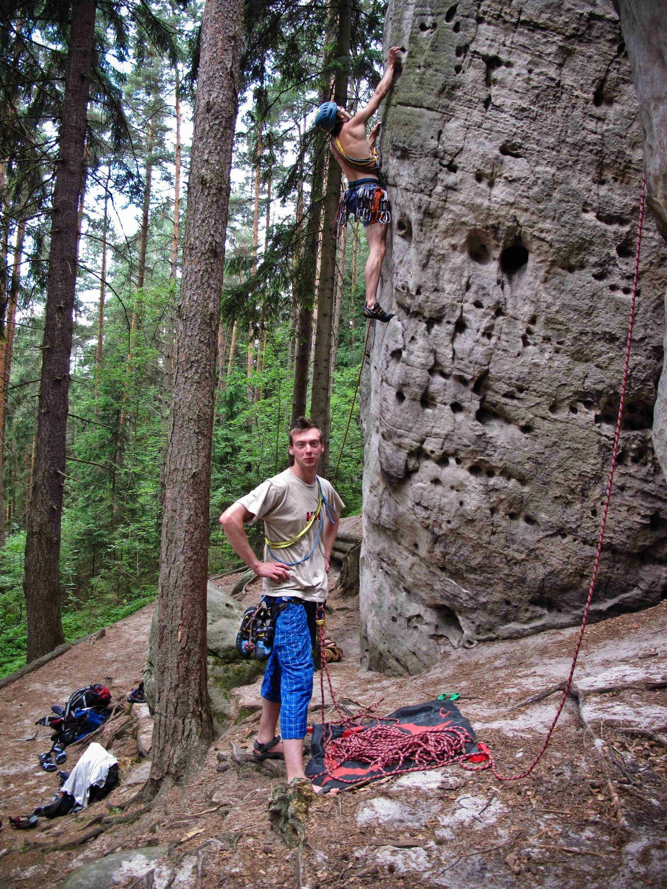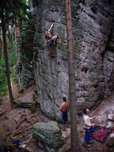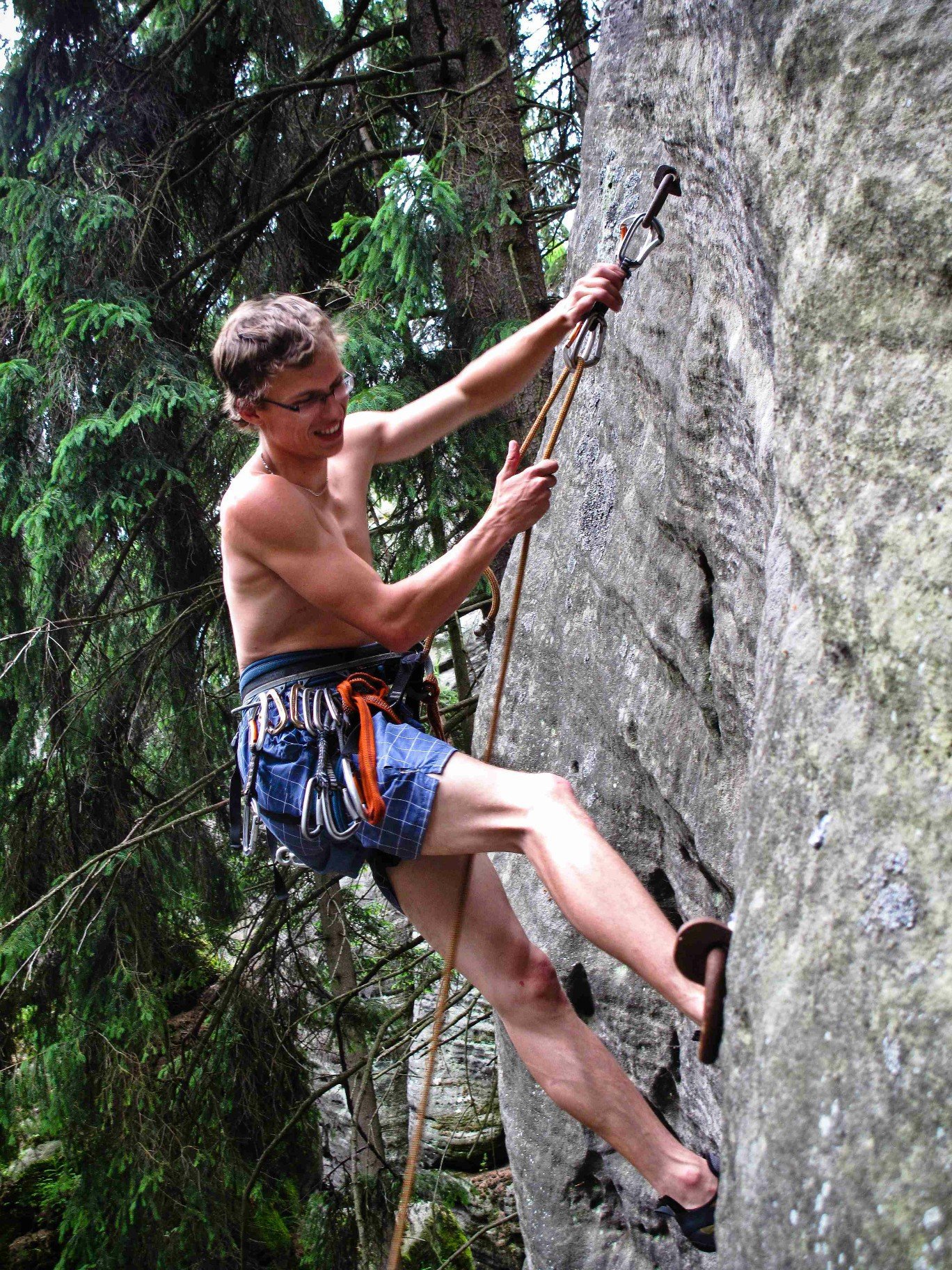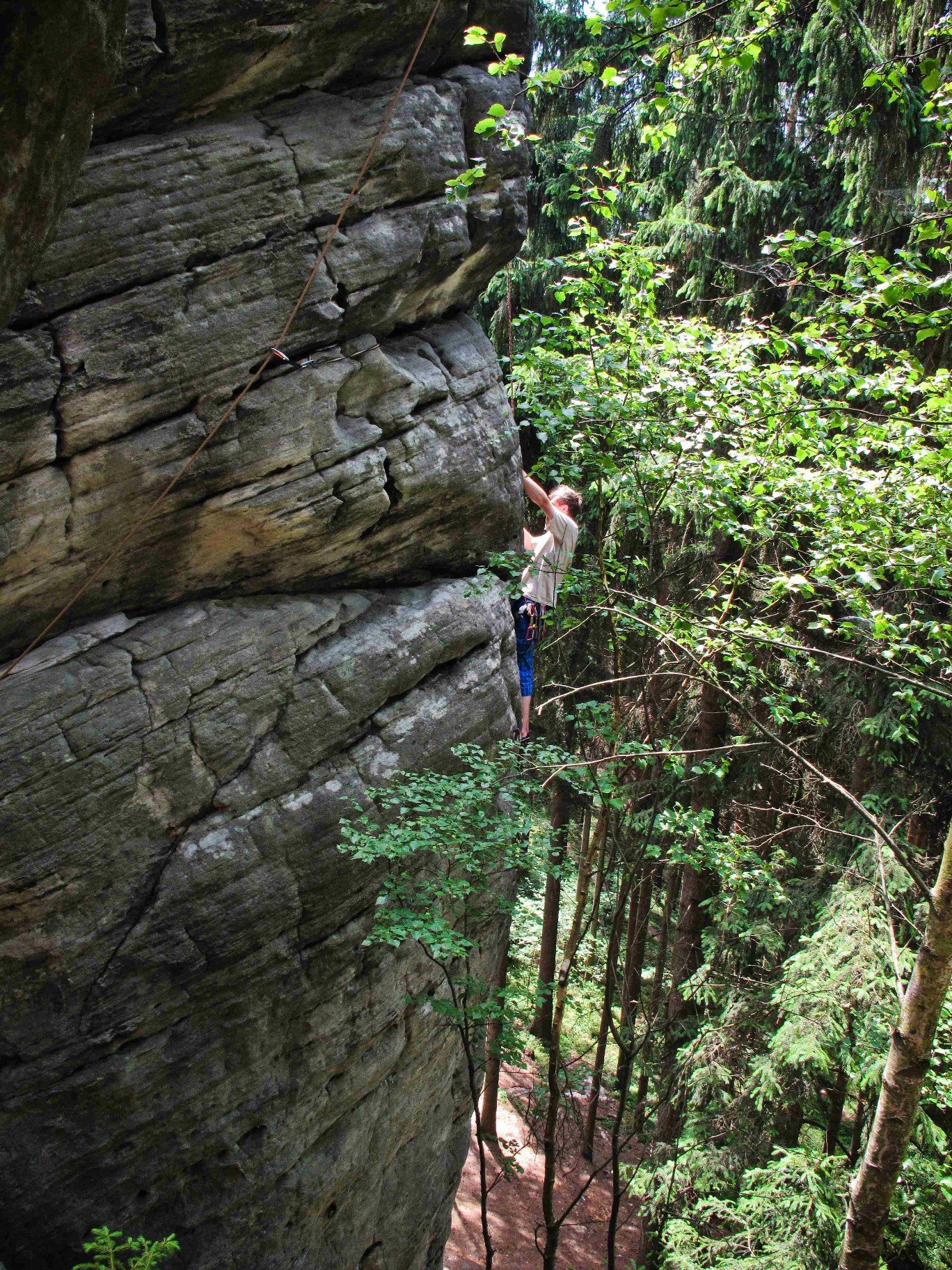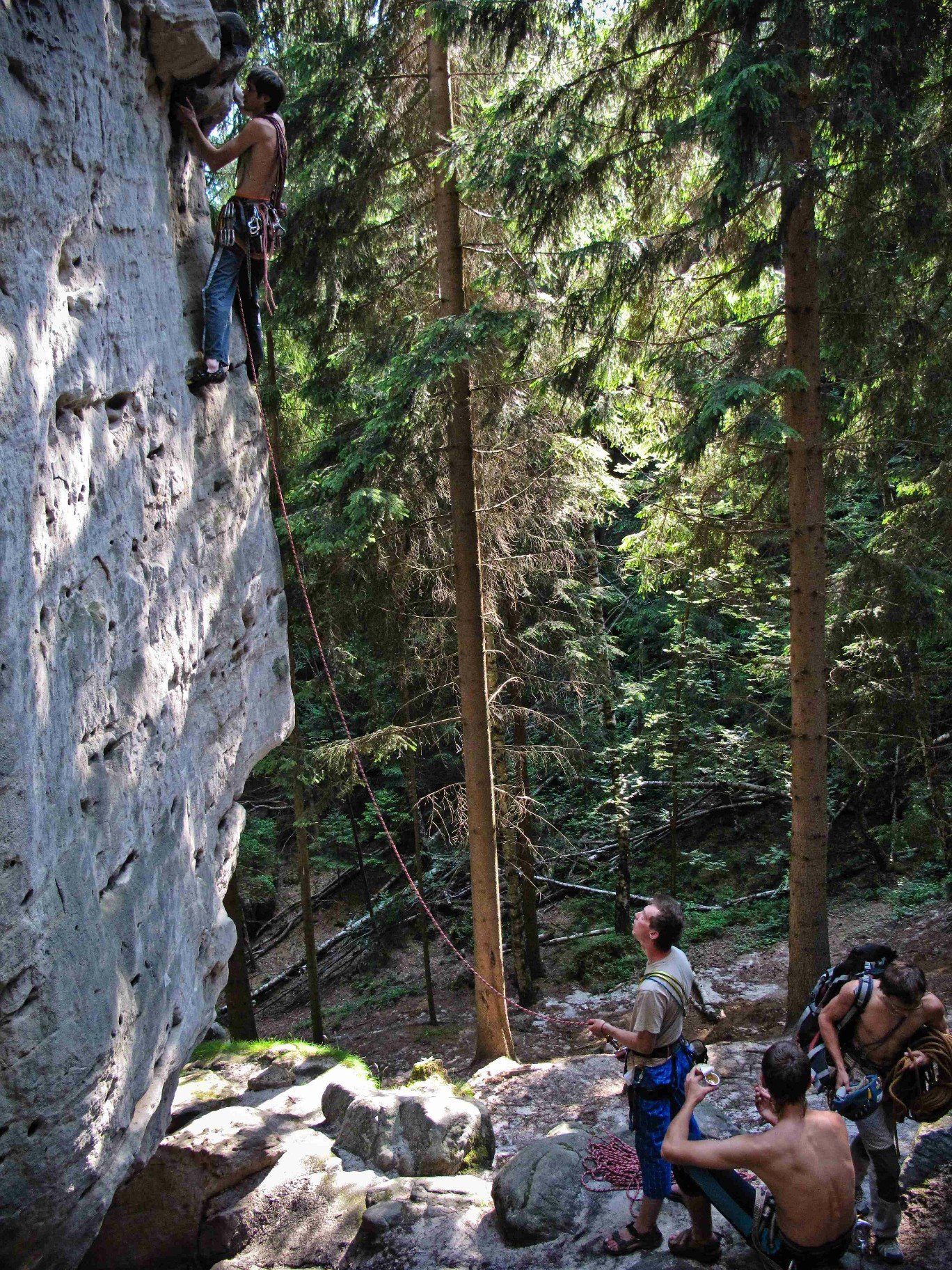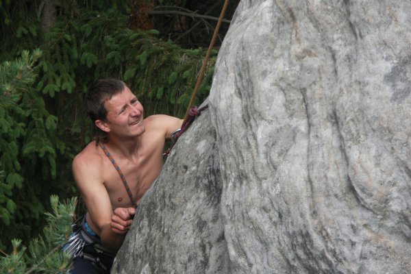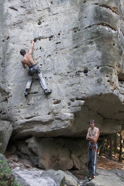 "Přes vřes a mraveniště" bude letos první. Znám ji dobře, lezl jsem ji mnohokrát. Ne vždycky se ale dařilo. Trošku morálu to přecijen chce. Dnes to ale jde. Po chvilce přešlapování, utírání zpocených rukou do kalhot (jsem přece klasik, hlavně po ránu) a hlubokým dechovým cvičení jsem nahoře a mám hroznou radost. Kdybych to uměl, udělám stojku. Michal, Danča i Zbýša jsou tu za chvilku taky. Jistí se sami, já si čtu v knížce. Moc toho tam ale není, je tu od loňskýho podzimu.