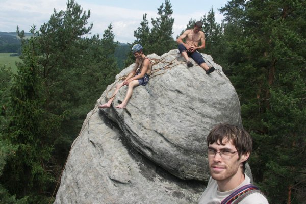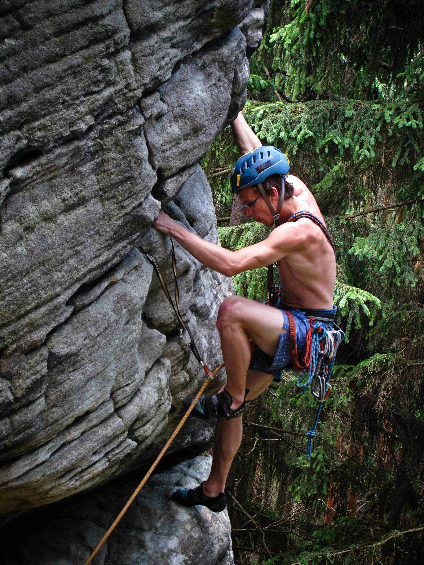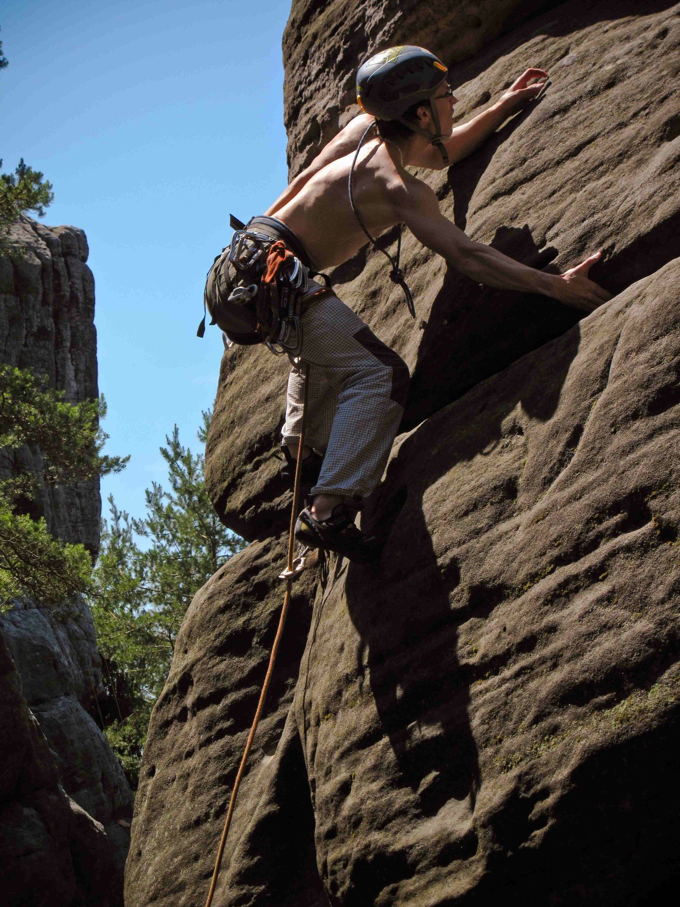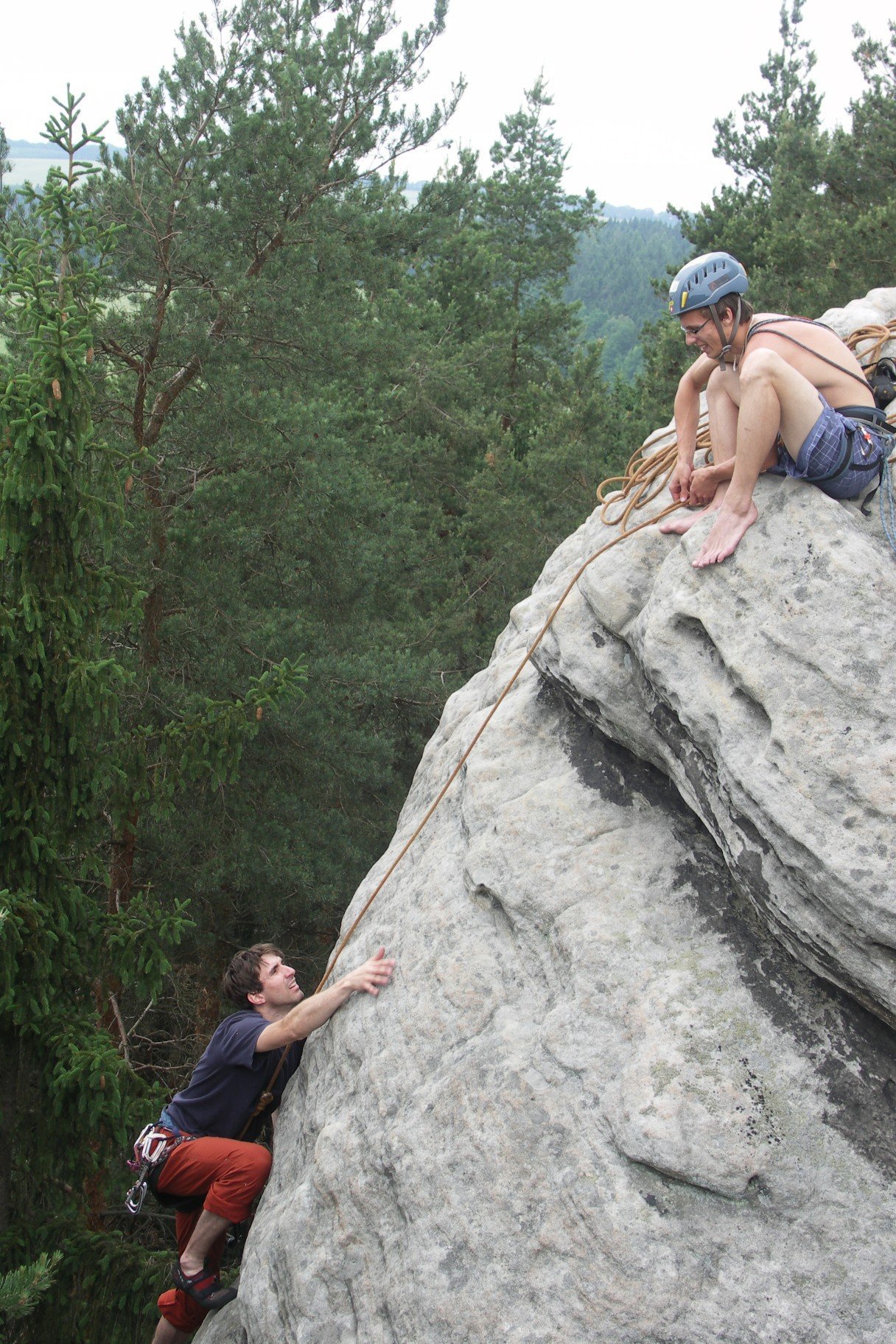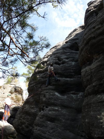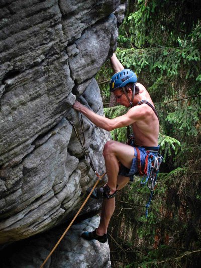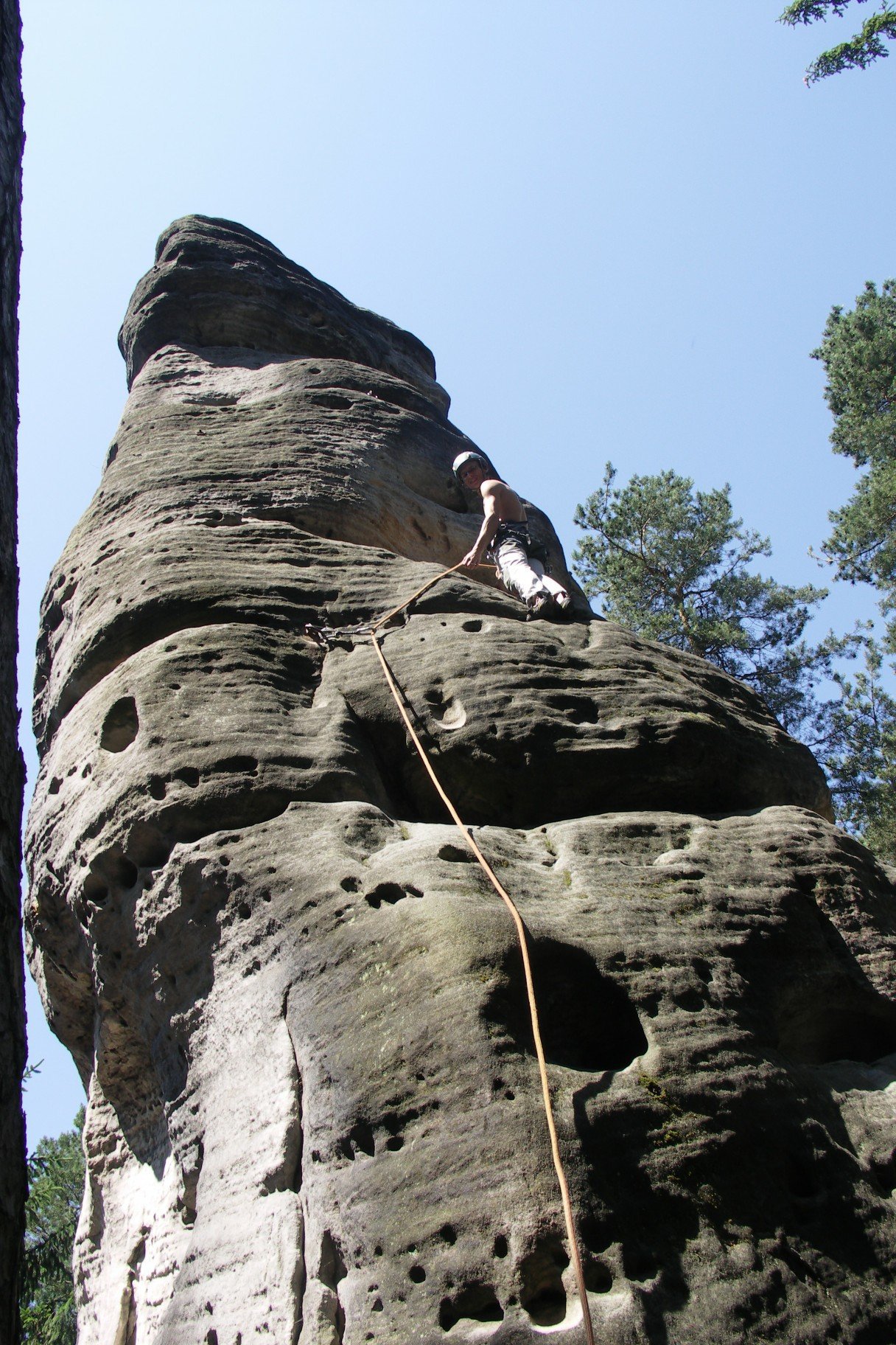 "Přes vřes a mraveniště" bude letos první. Znám ji dobře, lezl jsem ji mnohokrát. Ne vždycky se ale dařilo. Trošku morálu to přecijen chce. Dnes to ale jde. Po chvilce přešlapování, utírání zpocených rukou do kalhot (jsem přece klasik, hlavně po ránu) a hlubokým dechovým cvičení jsem nahoře a mám hroznou radost. Kdybych to uměl, udělám stojku. Michal, Danča i Zbýša jsou tu za chvilku taky. Jistí se sami, já si čtu v knížce. Moc toho tam ale není, je tu od loňskýho podzimu.