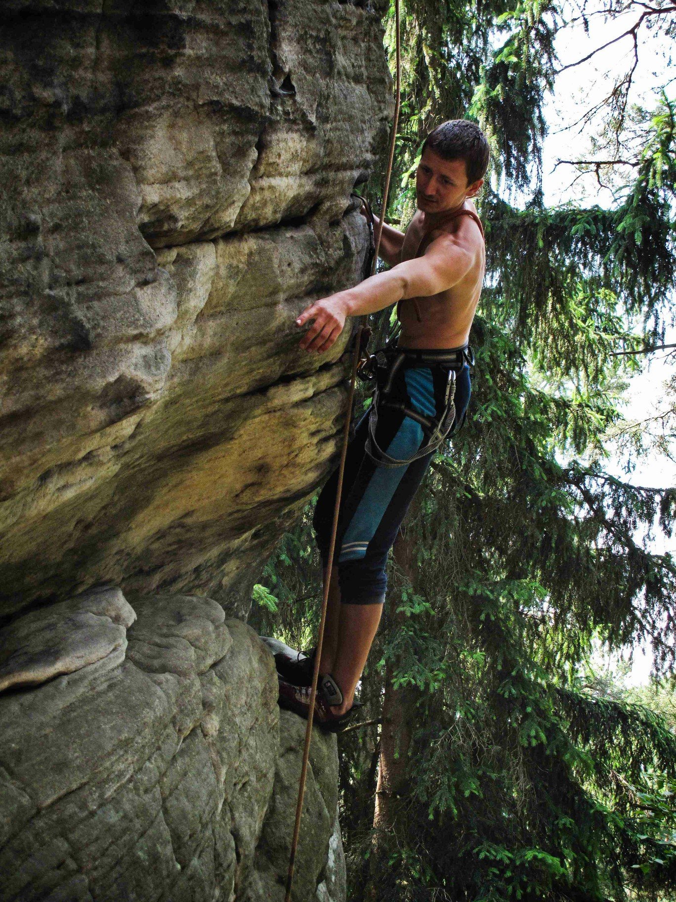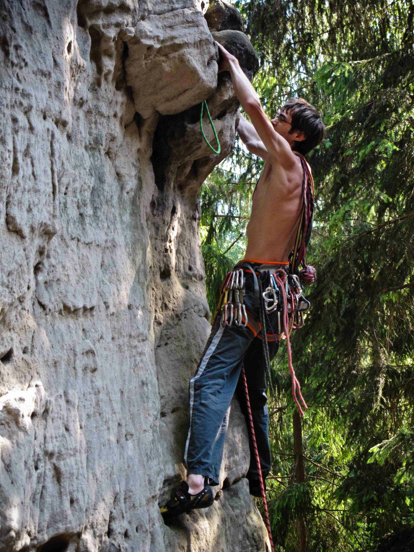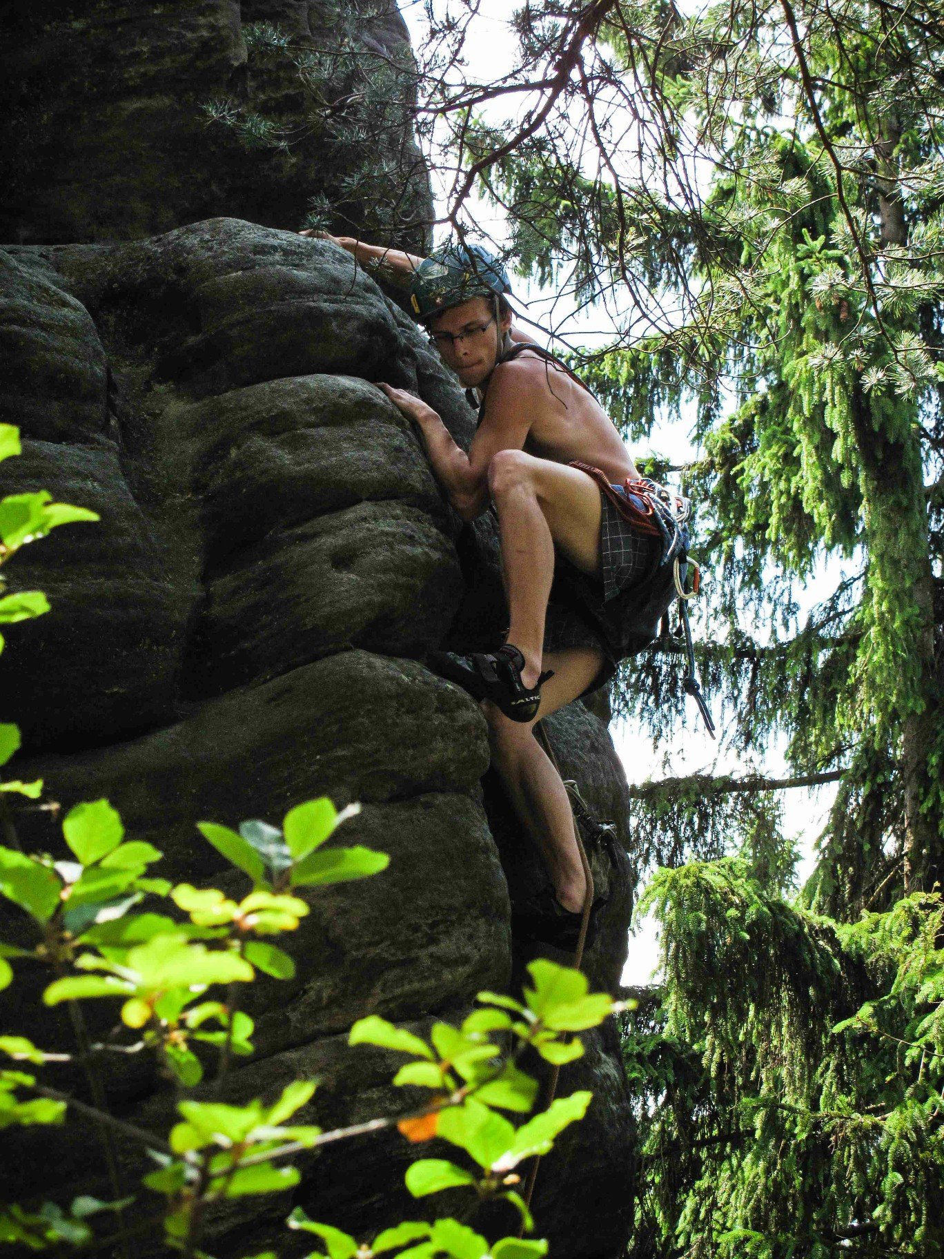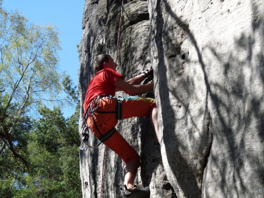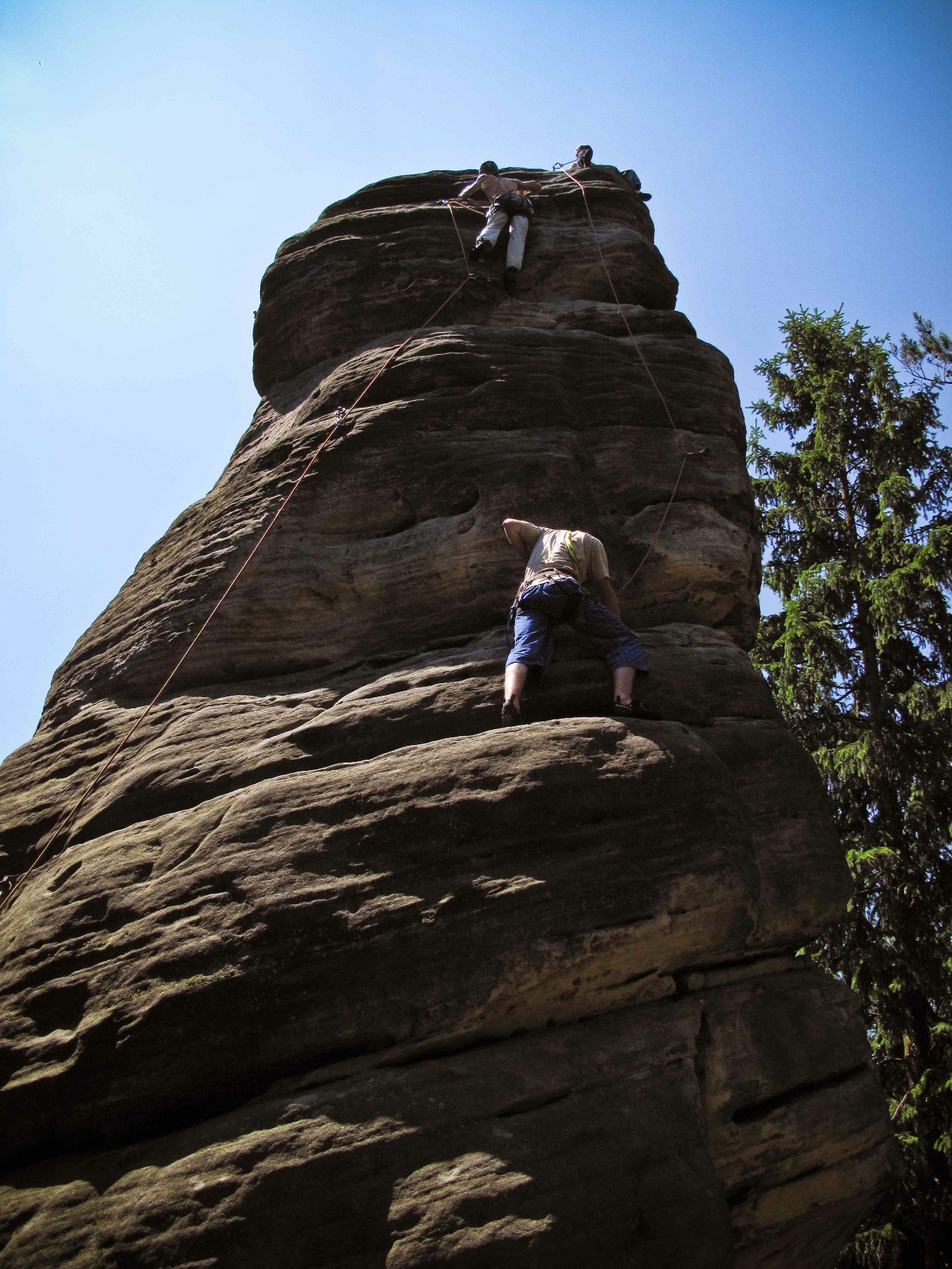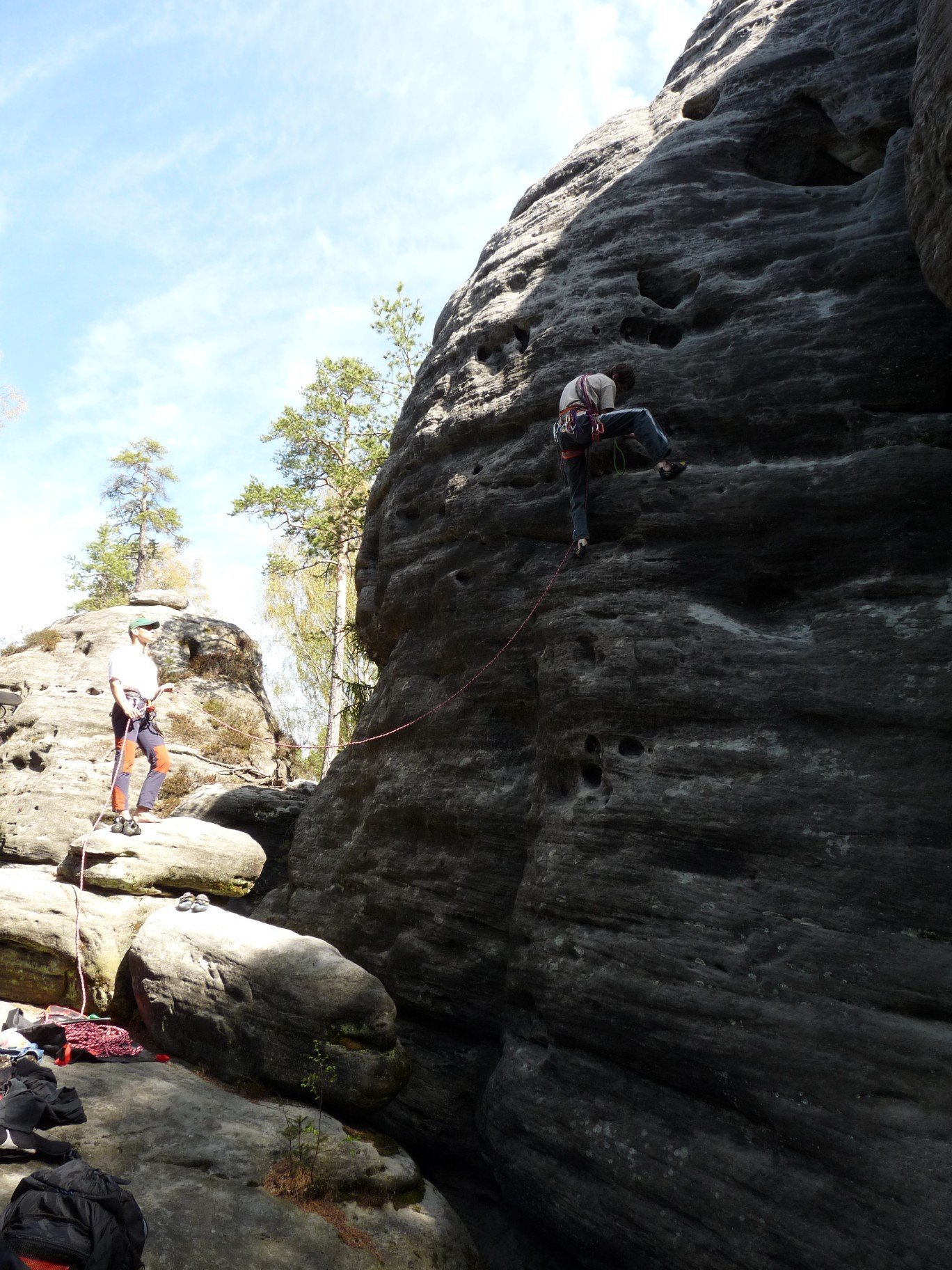 "Přes vřes a mraveniště" bude letos první. Znám ji dobře, lezl jsem ji mnohokrát. Ne vždycky se ale dařilo. Trošku morálu to přecijen chce. Dnes to ale jde. Po chvilce přešlapování, utírání zpocených rukou do kalhot (jsem přece klasik, hlavně po ránu) a hlubokým dechovým cvičení jsem nahoře a mám hroznou radost. Kdybych to uměl, udělám stojku. Michal, Danča i Zbýša jsou tu za chvilku taky. Jistí se sami, já si čtu v knížce. Moc toho tam ale není, je tu od loňskýho podzimu.