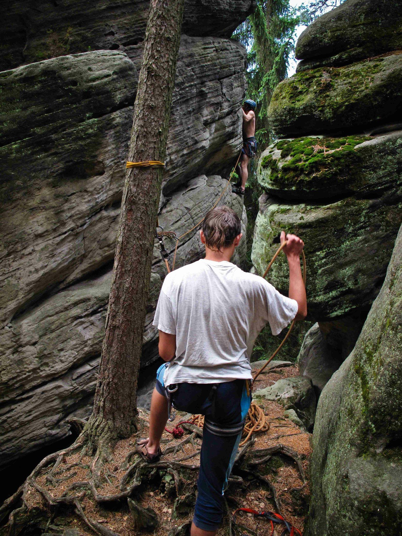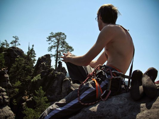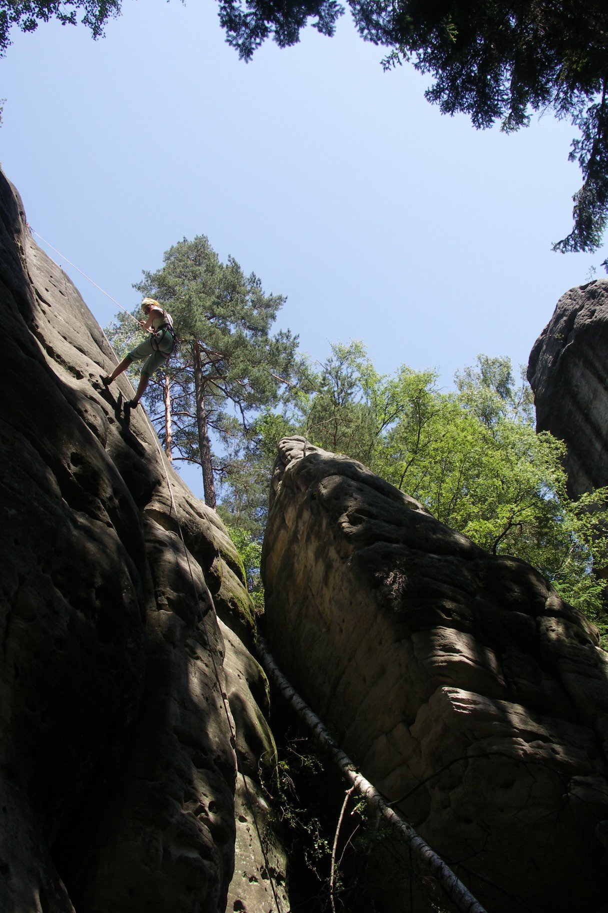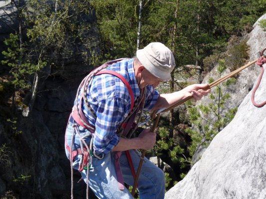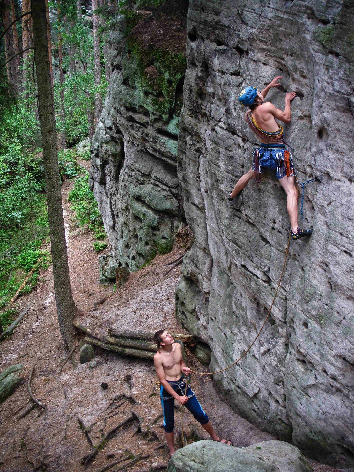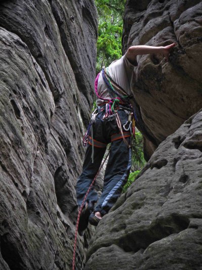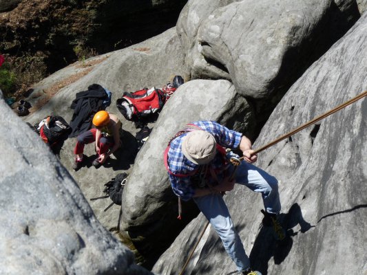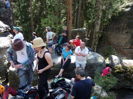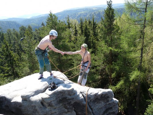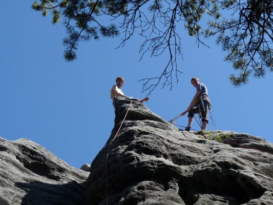 "Přes vřes a mraveniště" bude letos první. Znám ji dobře, lezl jsem ji mnohokrát. Ne vždycky se ale dařilo. Trošku morálu to přecijen chce. Dnes to ale jde. Po chvilce přešlapování, utírání zpocených rukou do kalhot (jsem přece klasik, hlavně po ránu) a hlubokým dechovým cvičení jsem nahoře a mám hroznou radost. Kdybych to uměl, udělám stojku. Michal, Danča i Zbýša jsou tu za chvilku taky. Jistí se sami, já si čtu v knížce. Moc toho tam ale není, je tu od loňskýho podzimu.