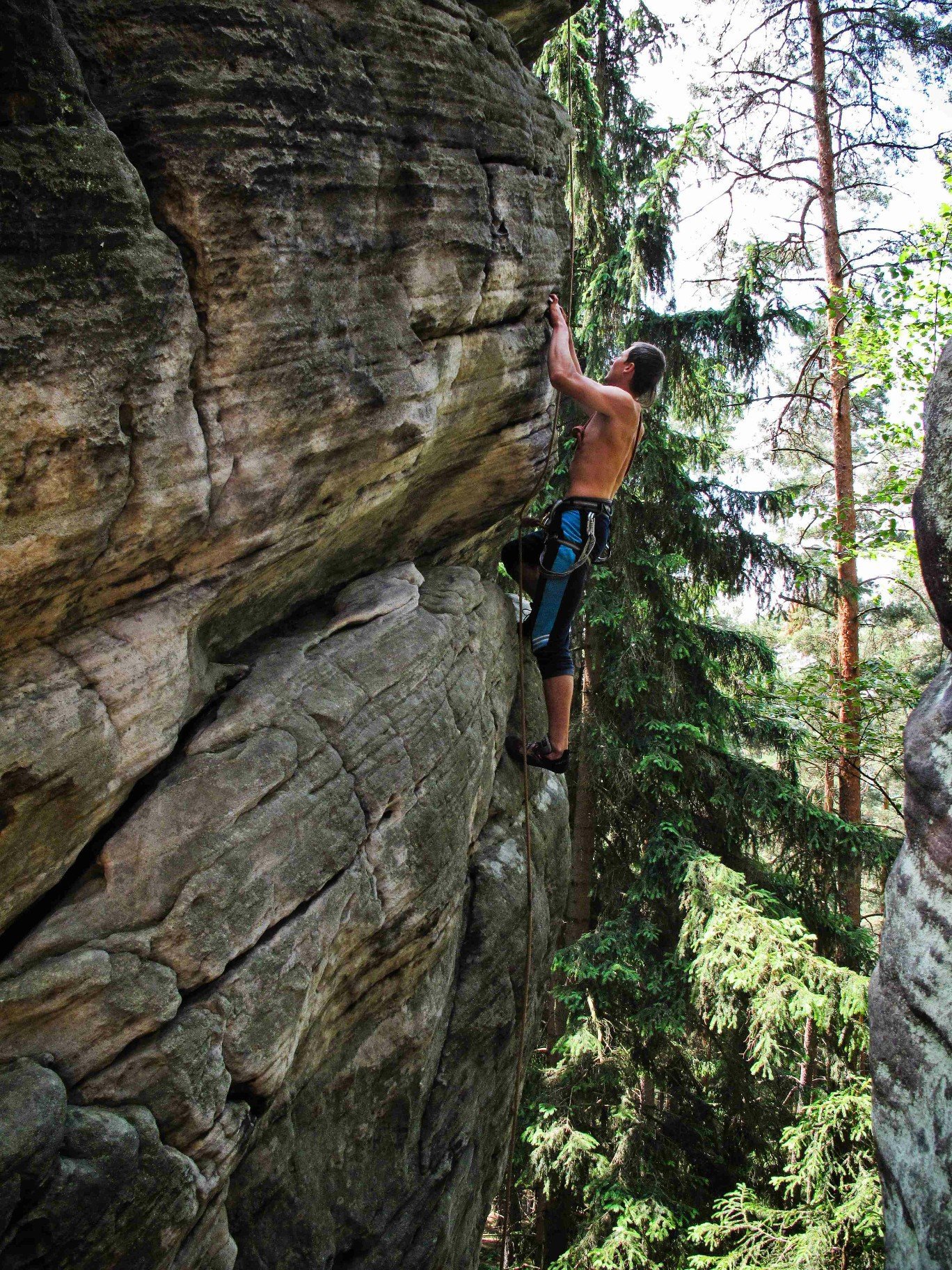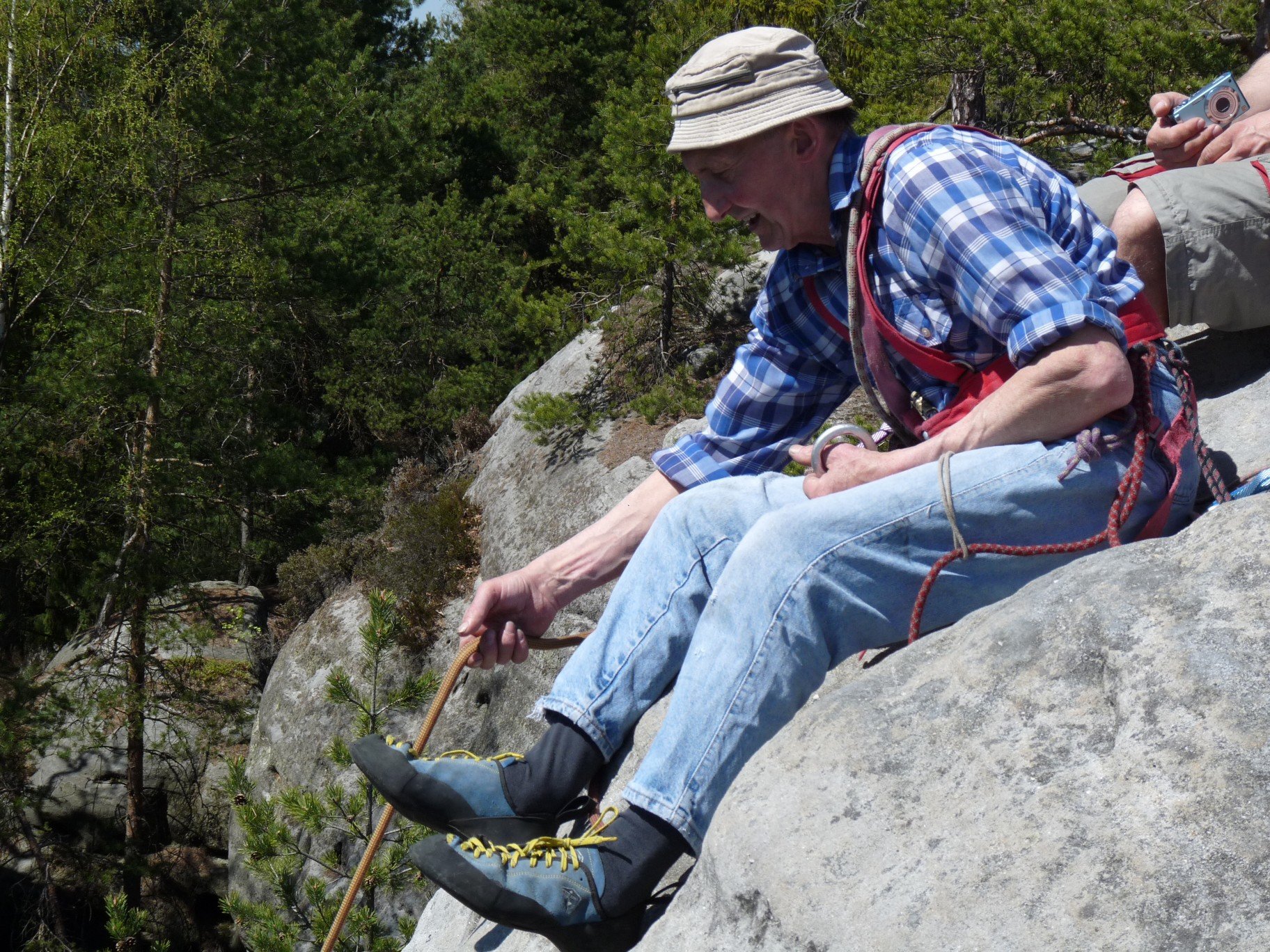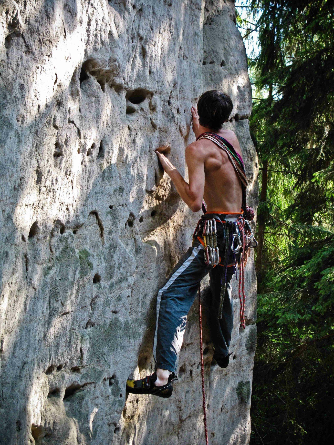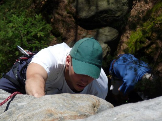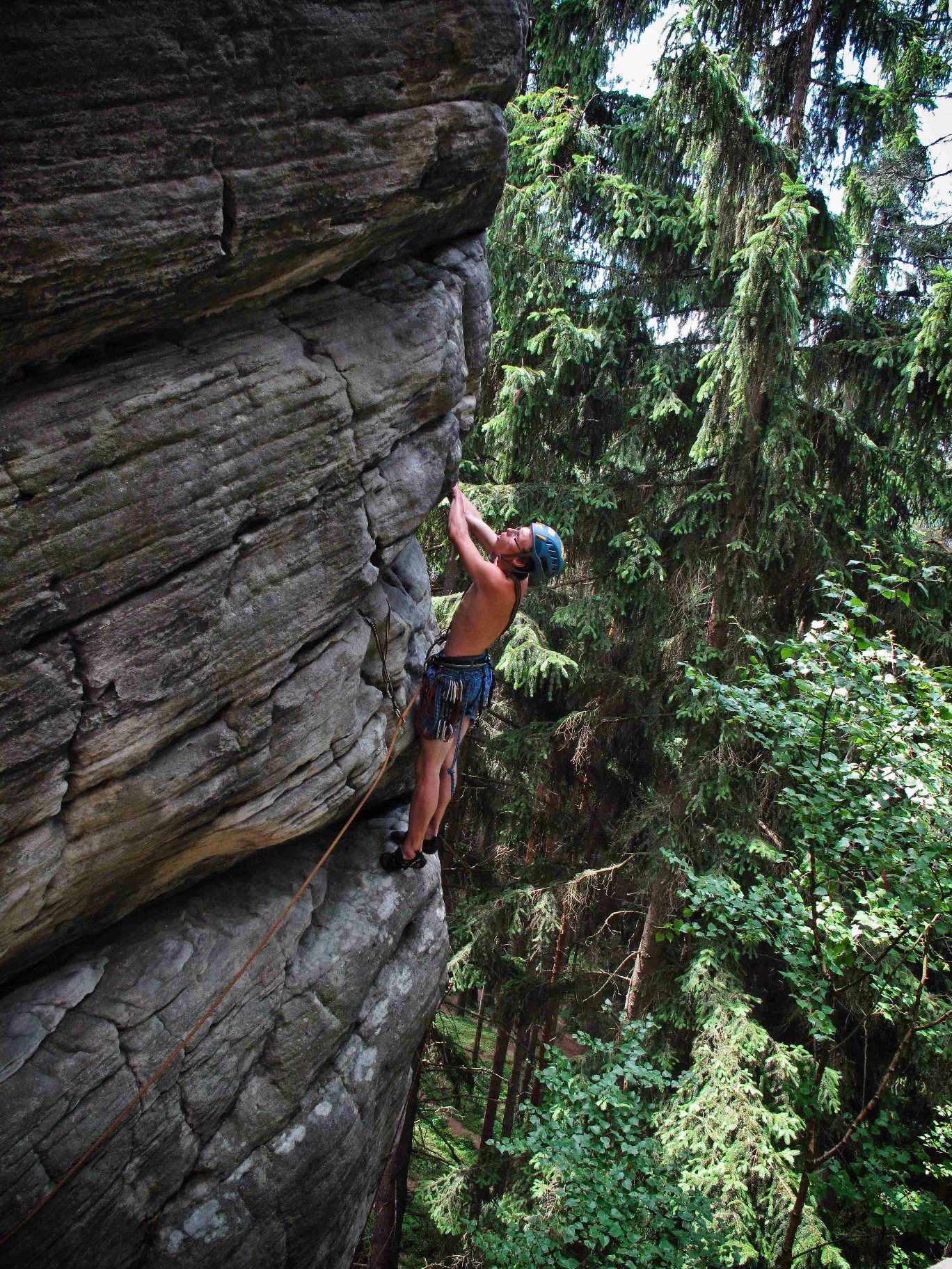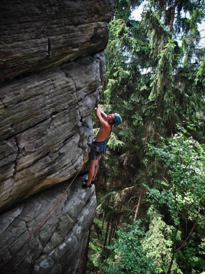 "Přes vřes a mraveniště" bude letos první. Znám ji dobře, lezl jsem ji mnohokrát. Ne vždycky se ale dařilo. Trošku morálu to přecijen chce. Dnes to ale jde. Po chvilce přešlapování, utírání zpocených rukou do kalhot (jsem přece klasik, hlavně po ránu) a hlubokým dechovým cvičení jsem nahoře a mám hroznou radost. Kdybych to uměl, udělám stojku. Michal, Danča i Zbýša jsou tu za chvilku taky. Jistí se sami, já si čtu v knížce. Moc toho tam ale není, je tu od loňskýho podzimu.