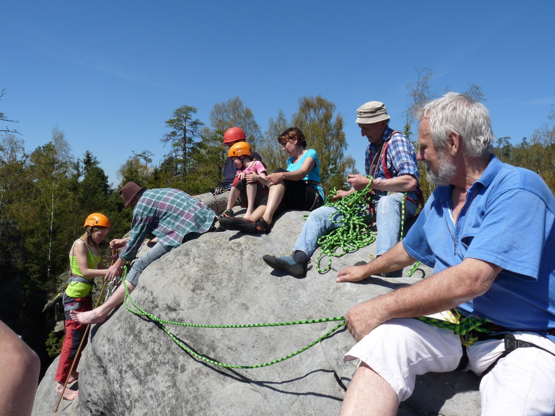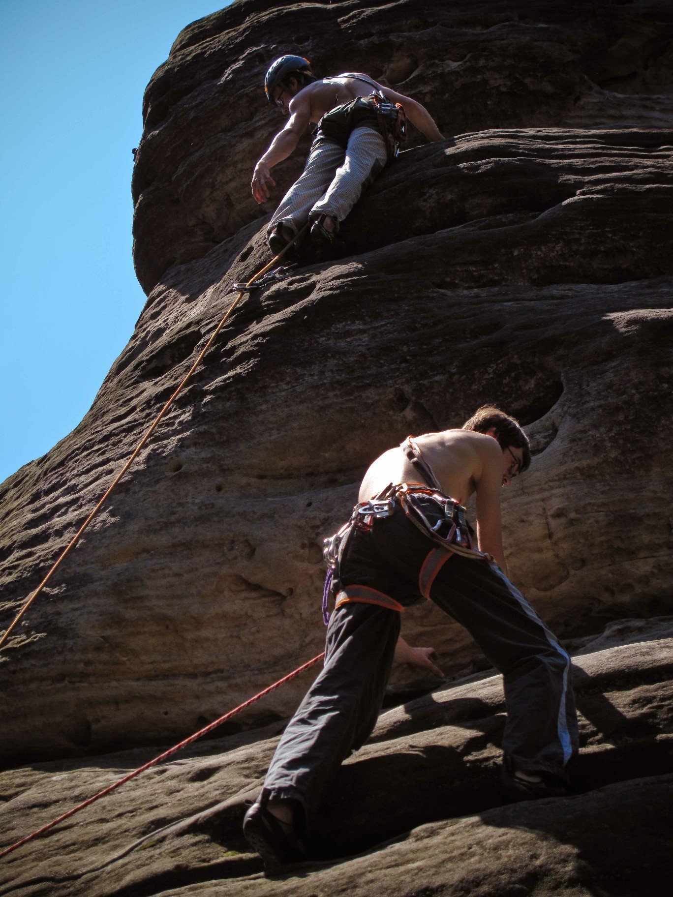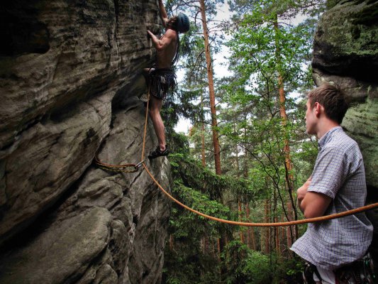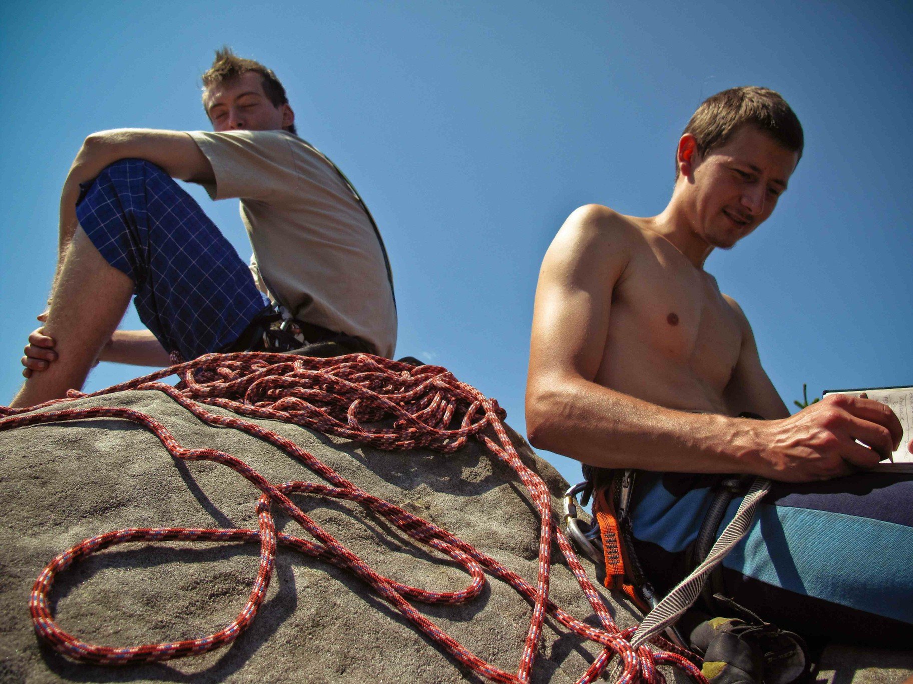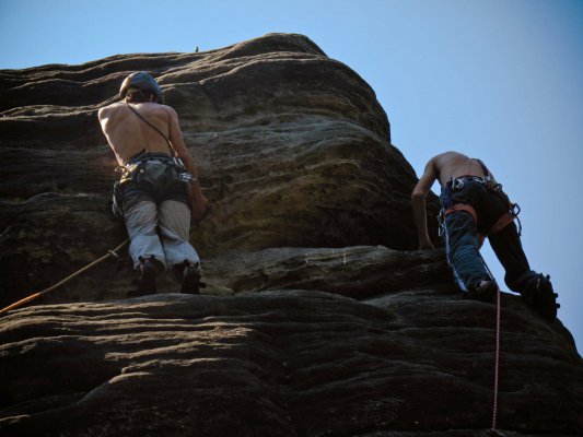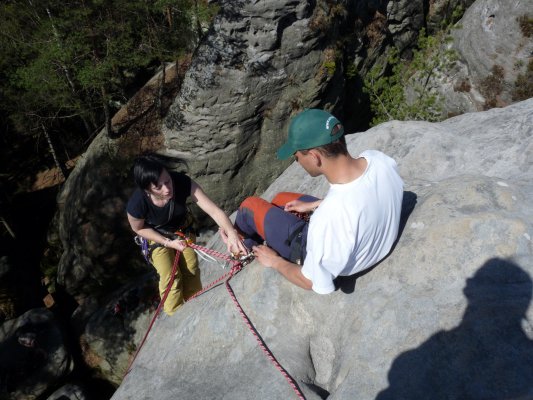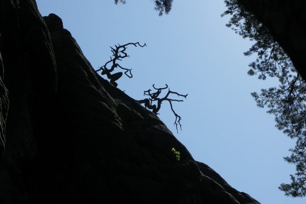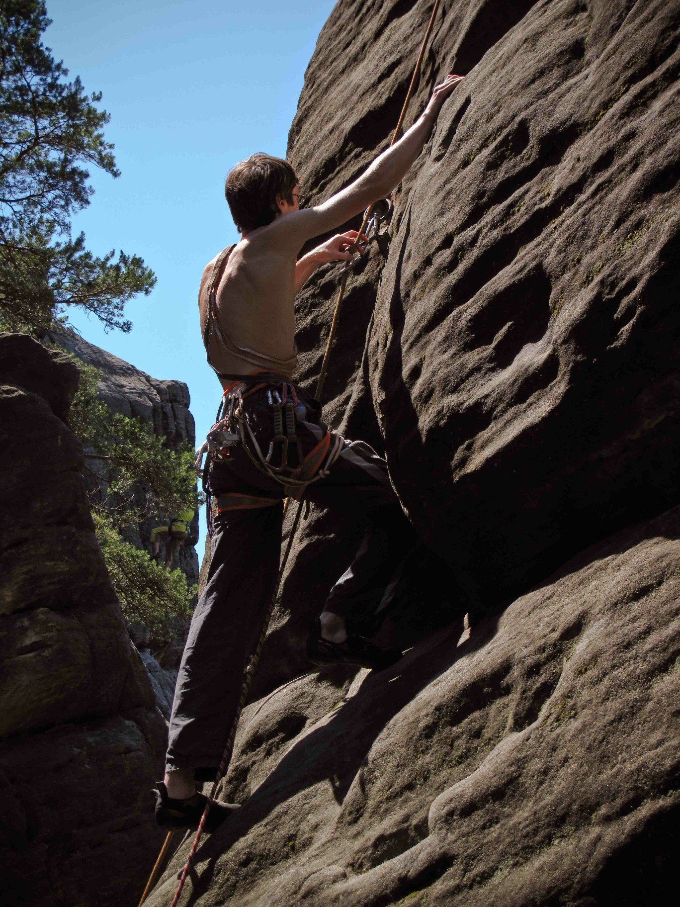 "Přes vřes a mraveniště" bude letos první. Znám ji dobře, lezl jsem ji mnohokrát. Ne vždycky se ale dařilo. Trošku morálu to přecijen chce. Dnes to ale jde. Po chvilce přešlapování, utírání zpocených rukou do kalhot (jsem přece klasik, hlavně po ránu) a hlubokým dechovým cvičení jsem nahoře a mám hroznou radost. Kdybych to uměl, udělám stojku. Michal, Danča i Zbýša jsou tu za chvilku taky. Jistí se sami, já si čtu v knížce. Moc toho tam ale není, je tu od loňskýho podzimu.