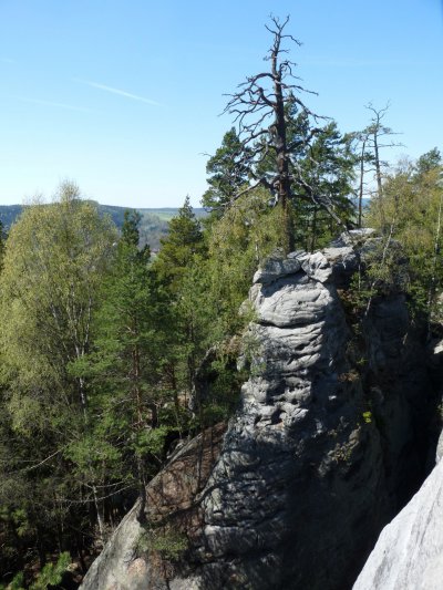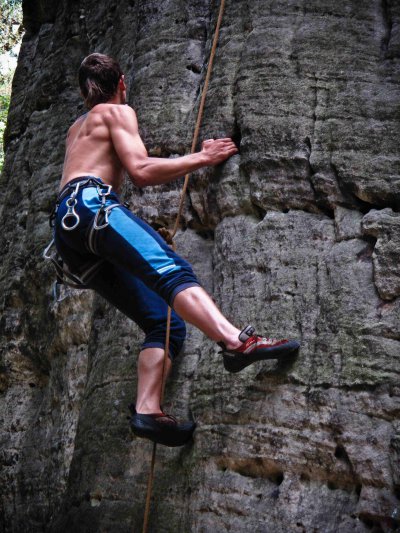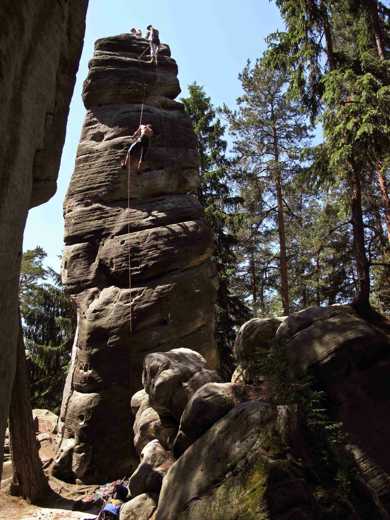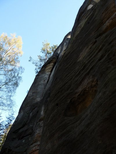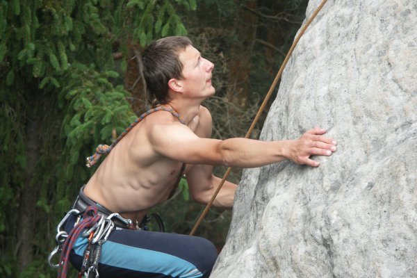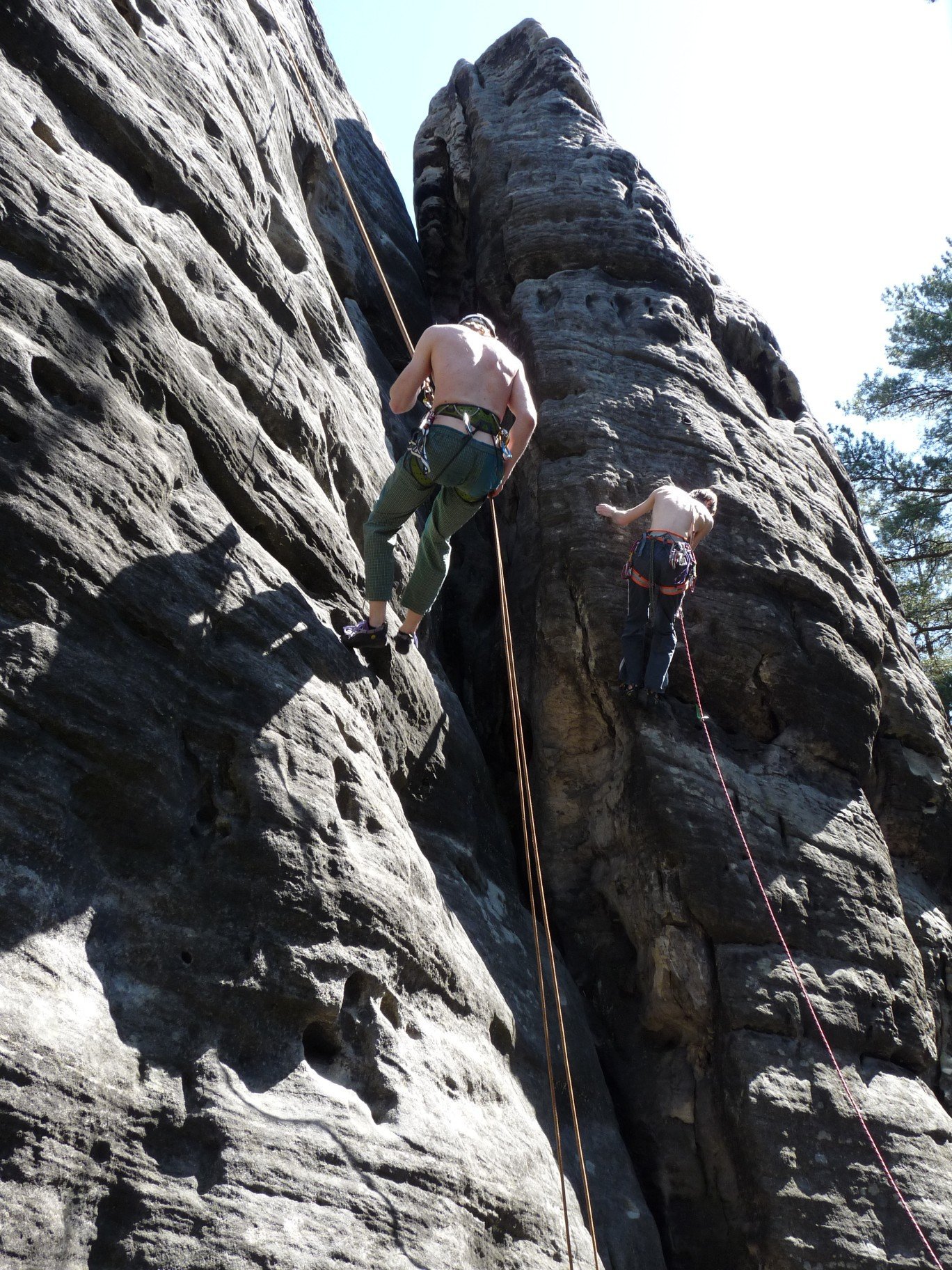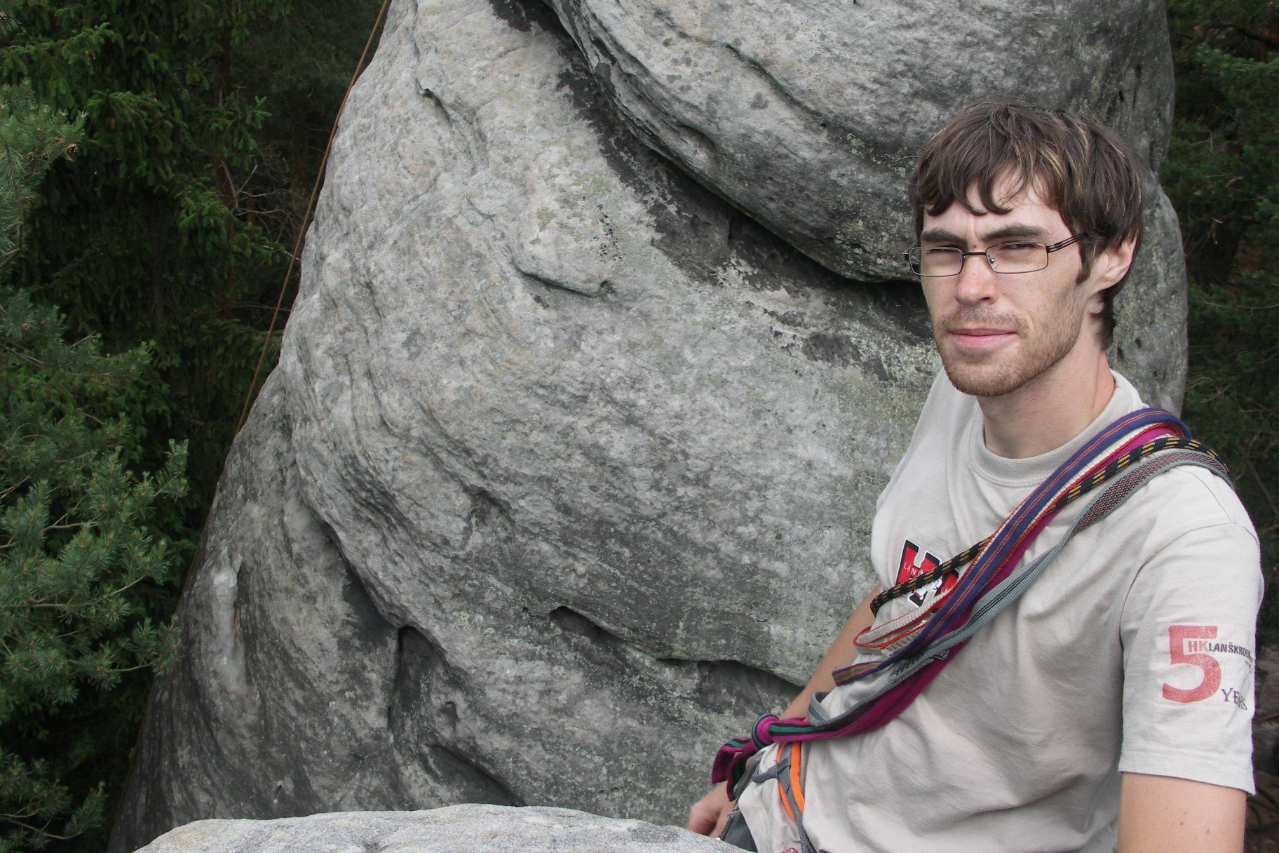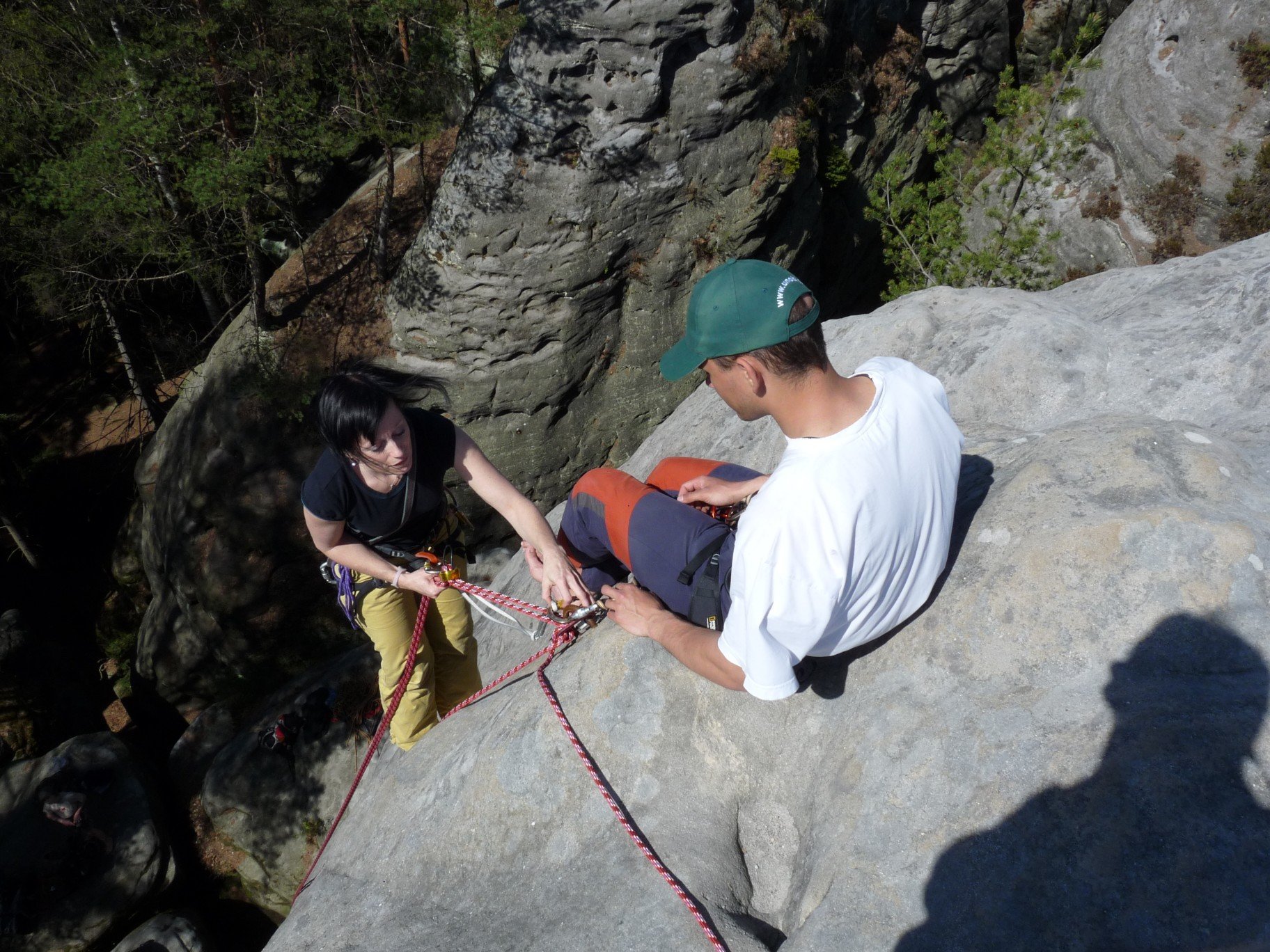 "Přes vřes a mraveniště" bude letos první. Znám ji dobře, lezl jsem ji mnohokrát. Ne vždycky se ale dařilo. Trošku morálu to přecijen chce. Dnes to ale jde. Po chvilce přešlapování, utírání zpocených rukou do kalhot (jsem přece klasik, hlavně po ránu) a hlubokým dechovým cvičení jsem nahoře a mám hroznou radost. Kdybych to uměl, udělám stojku. Michal, Danča i Zbýša jsou tu za chvilku taky. Jistí se sami, já si čtu v knížce. Moc toho tam ale není, je tu od loňskýho podzimu.