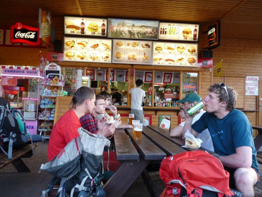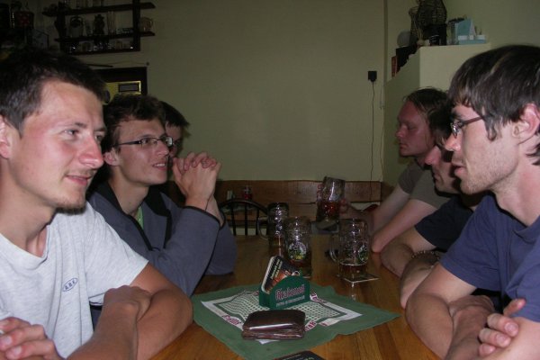 Přichází Marťa Pirkl se dvěma kamarádama. Přijeli vlakem a budou tu do zítřka. My dáváme ještě "Sudiválka" a "Bílé erby". Mezitím přichází i další lidi. Nakonec je tu docela těsno. Jsou tu i opravdoví klasici. Ve flanelové košili a "sedáku", co pamatuje už hodně výstupů si povídáme o Paklenici. A to se někdo bojí stáří...Škoda že už musí utíkat, jede jim vlak.
