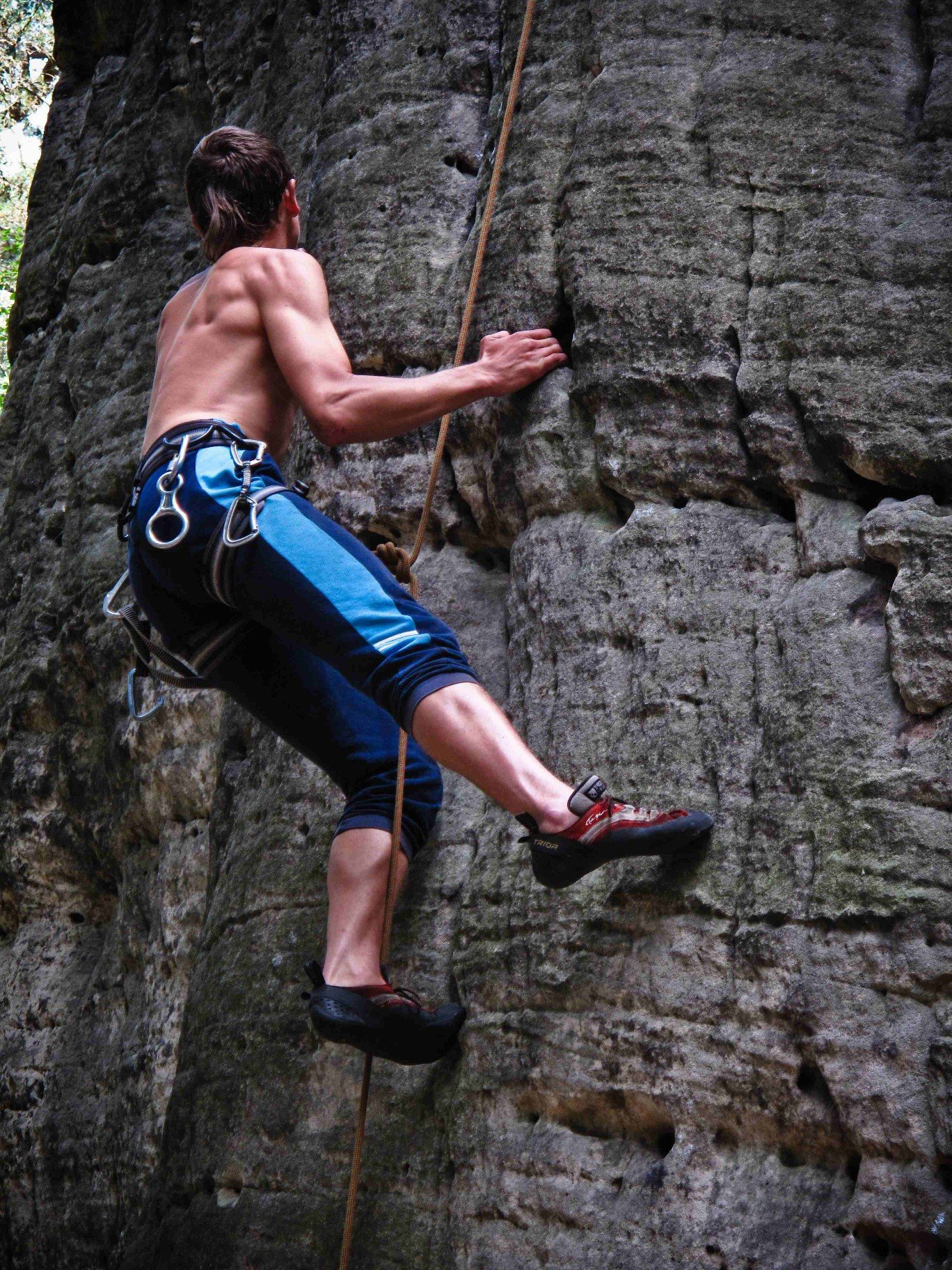 Dojezeno, vypito, jdeme na to. Cítíte ten divnej pocit kolem žaludku? To má člověk po zimě tak trošku strach. Půjde to, nebo nepůjde? Nechtělo to raději místo kafe panáka? Snad to půjde. Míříme tam, kde jsem před rokem skončil. Mušketýr na Křížáku má hezký rajbáskový cesty, ze kterých strašně rád utíkám traverzem do dvojkovýho komína. Luboš s Péťou si určitě vzpomenou na minulý rok a "Sudiválka".