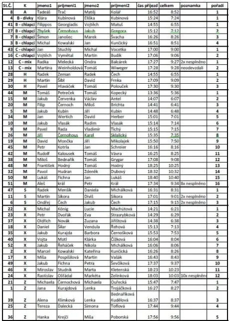 A jak to dopadlo: Naše dva týmy shodně skončili na konci první poloviny startovního pole (holt jsme jeden oddíl, otec a syn, ...). V absolutních číslech - Kuba a Zbyšek druzí v kategorii B (ročník 1996-1998). Karel a Fous osmí v kategorii mužů (vetrerány pro mě otevřít nechtěli).