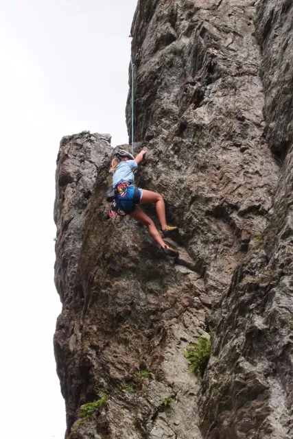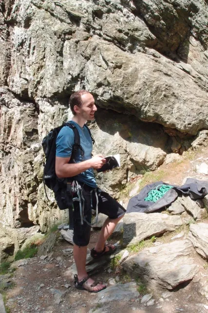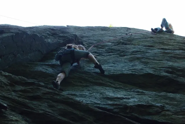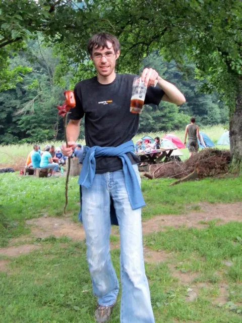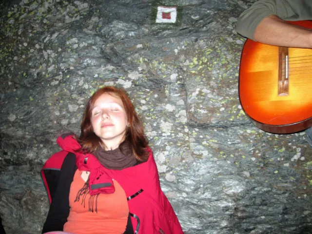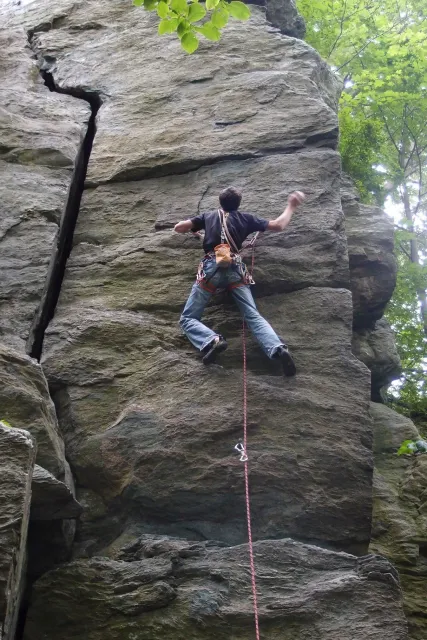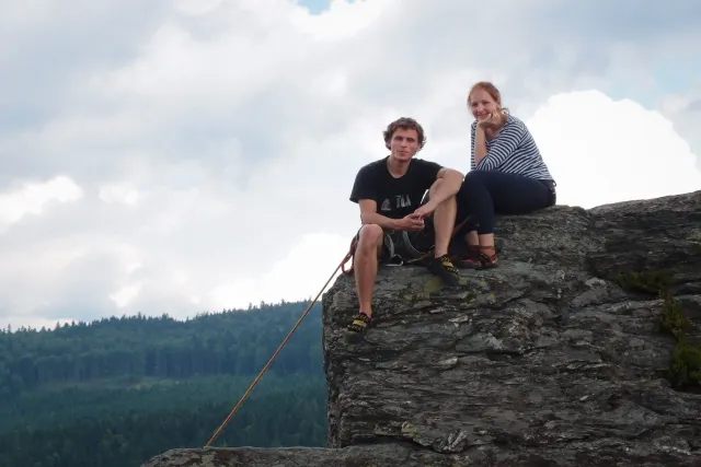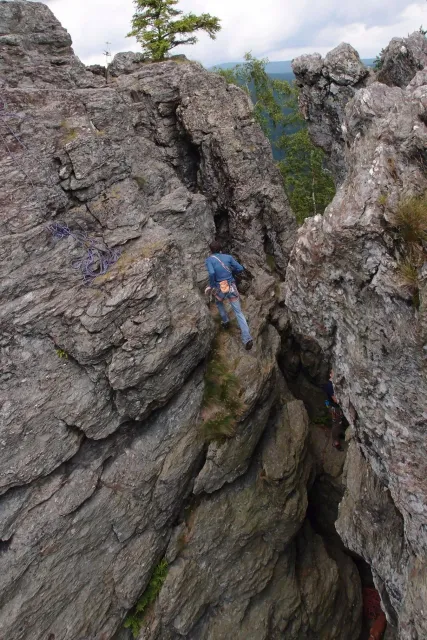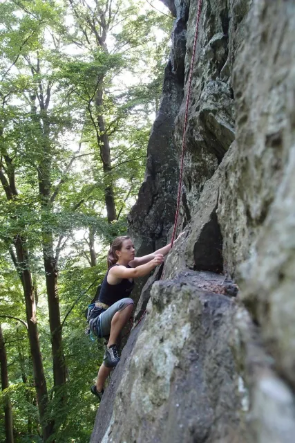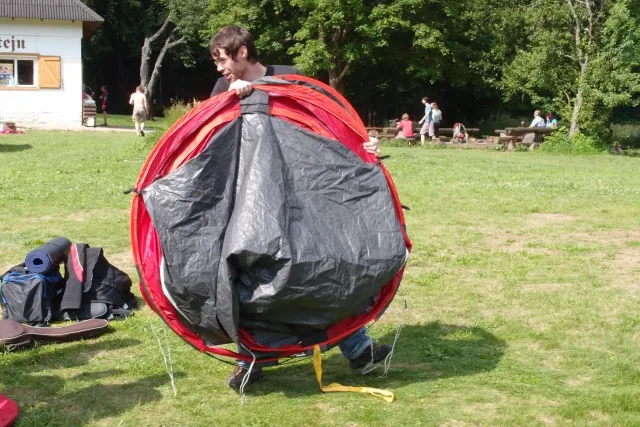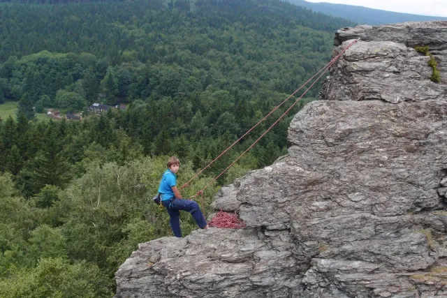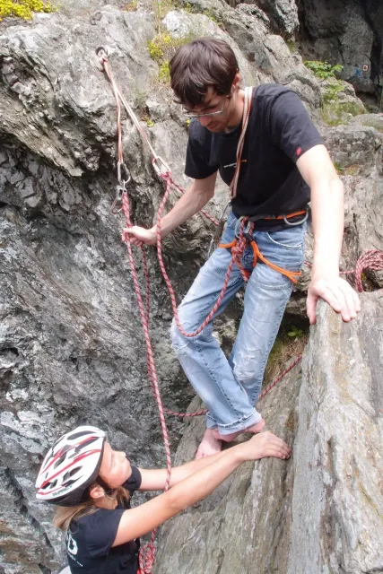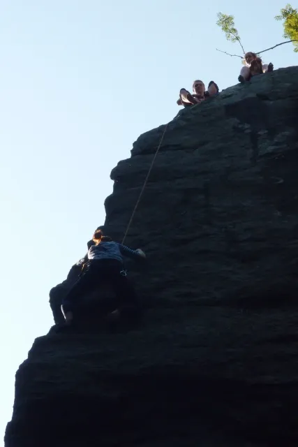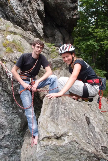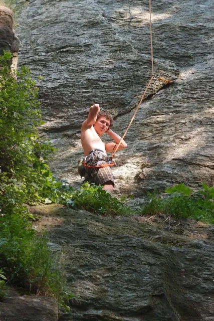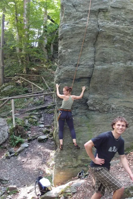 U hospody jsme si sedli na lavičky a čekali na zbytek výpravy z Český třebové. Asi za 10 min je vidíme přicházet, taky zmohlý náročným výstupem. Přijel Marťas, Peťa, Jirka a Anička, Peťina spolužačka z vejšky. Po svačince jsme si šli postavit stany. Dejv vyhodil svůj “satelit“ do vzduchu a rázem z něho byl stan, jen zakolíkovat. Po dokončení práce už konečně jdeme lízt. Skupina z Český začíná na Rigu a my jdeme na oblast nazývaná Trosky. Lezeme výceméně ve dvojkách Dejv-Kuba, Libor-Anička a Já se Zdenkem a Mončou. Začínáme na lehkých cestám a Dejv se následně pustí do cesty vedle jedné koutové spáry. Mě ta cesta podle pohledu připadala tak za 7, byla v rozlámané převislé stěně , ale místní znalec nám poveděl, že je za 9+. Dejv nic neví a do cesty nalízá plně natěšen. Kuba ho po druhém pádu povzbudí slovy:„Zapytli to“. Dejv se nechce vzdát a urputně bojuje, avšak cesta je obtížnosti „Nejde to“ a je nad Dejvovy síly. Jeho terorie je vyvrácena. Lezeme dál a Já se dám v jedný pětce na výšívání. Má vysoko 1. kruh a nalízá se asi 6 m nad zemí ze šutru. Morál nemám a tak k 1 kruhu dolezám kolem 4. U druhého kruhu je to stejný, propínám 2 kruh ze čtyrky a vrh následně oblízám trochu víc zprava, než se asi má. Stidím se a z „vylezené“ pětky nemám žádnou radost. Nutno dodat, že Kuba ji lezl předemnou bez problémů. Je na tom morálově líp než já. Všichni pilně bušíme, dokonce i Zdenek, u kterýho se prokázalo, že antibiotika mu na lezení nejspíš pomáhají. Dejv nám natáhne krásnou Orlínovu hranu. Začátek těžší a pak nádherný dlouhý, poměrně lehký dolez. Mezitím dorazí skupina z Český k nám a Jirka si vybere linii borháků ve steně. Naleze do ní a za pár minutek to zapytlil. Stejně tak Marťas, i když cvakne o kruh víc. Volají k sobě Dejva a ten se ochotně navazuje. Na úroveň Marťase dolízá v pohodě, ale potom má problémy. Padá několikrát za sebou, avšak potom úspešně zdolá klíčový krok a cestu už doleze. Nechce se mu věřit, že cesta je v průvodci “jenom“ za 7+. Mládež už v tuhle dobu ztratila náladu lízt a má sundané sadáky. Čeká, až poslední členové doprovodu dolezou a bude si moc jít odpočinou ke stanům.