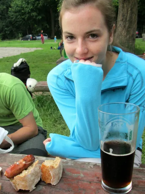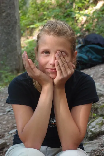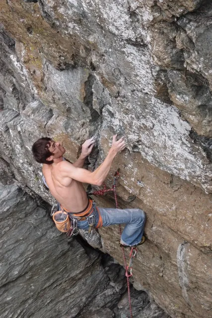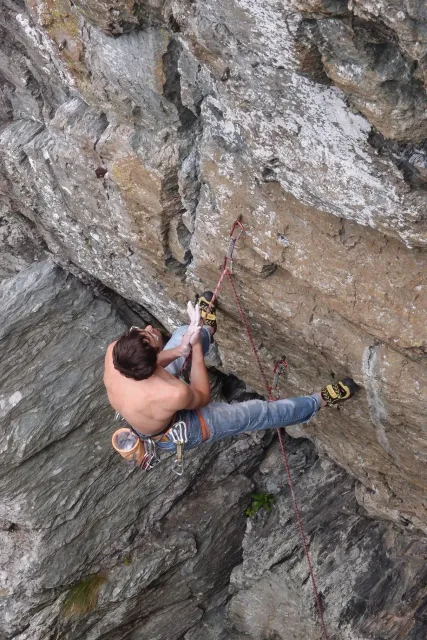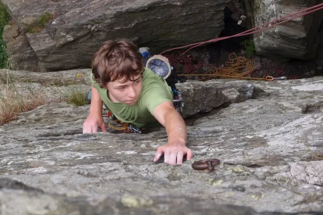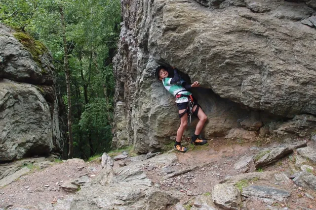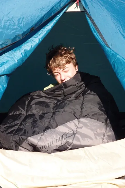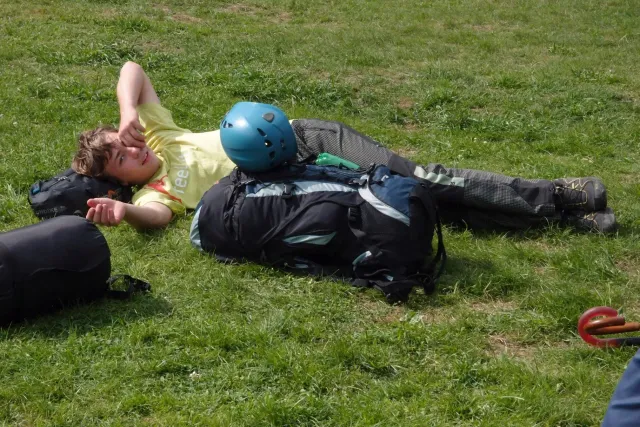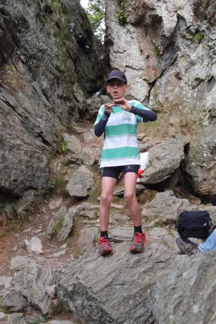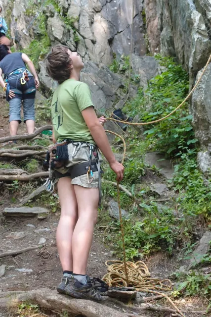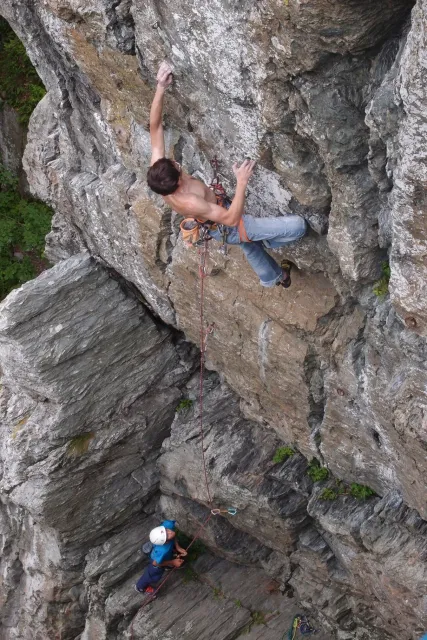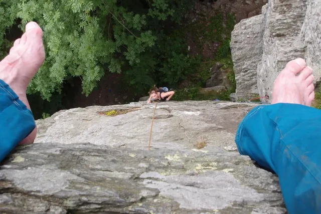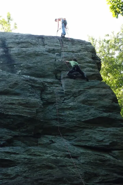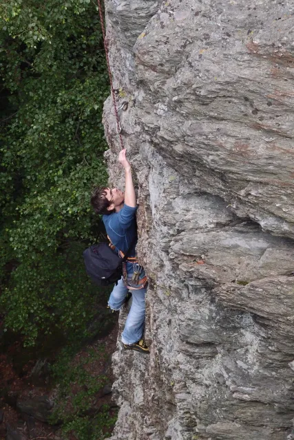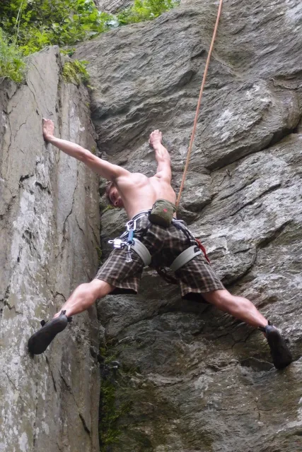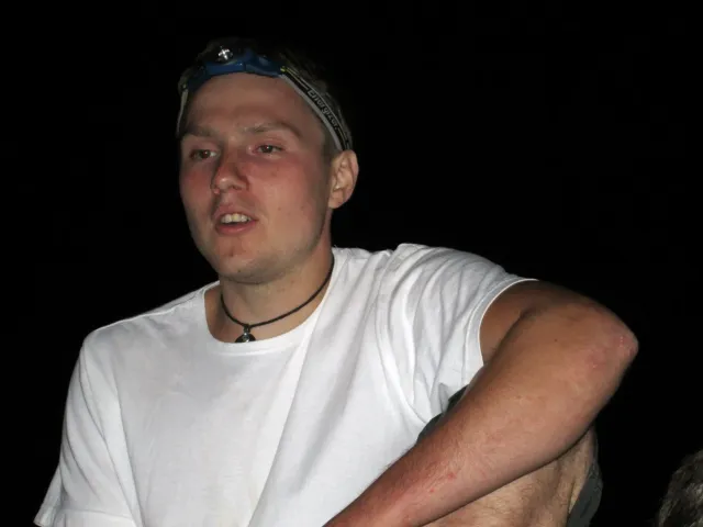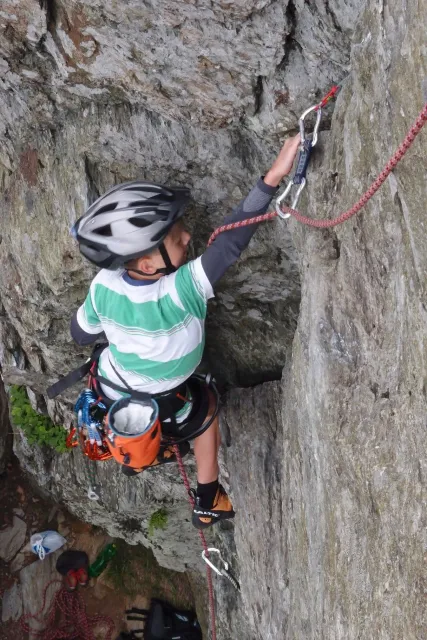 U hospody jsme si sedli na lavičky a čekali na zbytek výpravy z Český třebové. Asi za 10 min je vidíme přicházet, taky zmohlý náročným výstupem. Přijel Marťas, Peťa, Jirka a Anička, Peťina spolužačka z vejšky. Po svačince jsme si šli postavit stany. Dejv vyhodil svůj “satelit“ do vzduchu a rázem z něho byl stan, jen zakolíkovat. Po dokončení práce už konečně jdeme lízt. Skupina z Český začíná na Rigu a my jdeme na oblast nazývaná Trosky. Lezeme výceméně ve dvojkách Dejv-Kuba, Libor-Anička a Já se Zdenkem a Mončou. Začínáme na lehkých cestám a Dejv se následně pustí do cesty vedle jedné koutové spáry. Mě ta cesta podle pohledu připadala tak za 7, byla v rozlámané převislé stěně , ale místní znalec nám poveděl, že je za 9+. Dejv nic neví a do cesty nalízá plně natěšen. Kuba ho po druhém pádu povzbudí slovy:„Zapytli to“. Dejv se nechce vzdát a urputně bojuje, avšak cesta je obtížnosti „Nejde to“ a je nad Dejvovy síly. Jeho terorie je vyvrácena. Lezeme dál a Já se dám v jedný pětce na výšívání. Má vysoko 1. kruh a nalízá se asi 6 m nad zemí ze šutru. Morál nemám a tak k 1 kruhu dolezám kolem 4. U druhého kruhu je to stejný, propínám 2 kruh ze čtyrky a vrh následně oblízám trochu víc zprava, než se asi má. Stidím se a z „vylezené“ pětky nemám žádnou radost. Nutno dodat, že Kuba ji lezl předemnou bez problémů. Je na tom morálově líp než já. Všichni pilně bušíme, dokonce i Zdenek, u kterýho se prokázalo, že antibiotika mu na lezení nejspíš pomáhají. Dejv nám natáhne krásnou Orlínovu hranu. Začátek těžší a pak nádherný dlouhý, poměrně lehký dolez. Mezitím dorazí skupina z Český k nám a Jirka si vybere linii borháků ve steně. Naleze do ní a za pár minutek to zapytlil. Stejně tak Marťas, i když cvakne o kruh víc. Volají k sobě Dejva a ten se ochotně navazuje. Na úroveň Marťase dolízá v pohodě, ale potom má problémy. Padá několikrát za sebou, avšak potom úspešně zdolá klíčový krok a cestu už doleze. Nechce se mu věřit, že cesta je v průvodci “jenom“ za 7+. Mládež už v tuhle dobu ztratila náladu lízt a má sundané sadáky. Čeká, až poslední členové doprovodu dolezou a bude si moc jít odpočinou ke stanům.