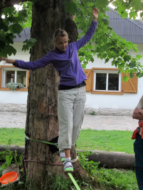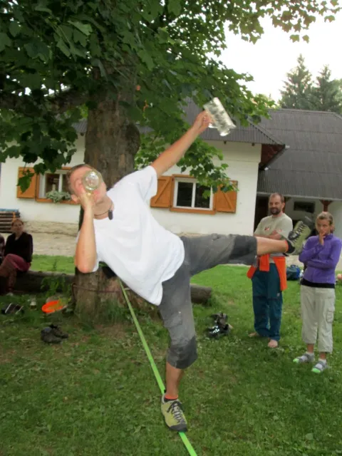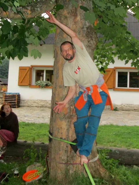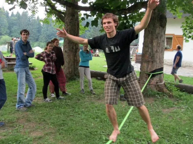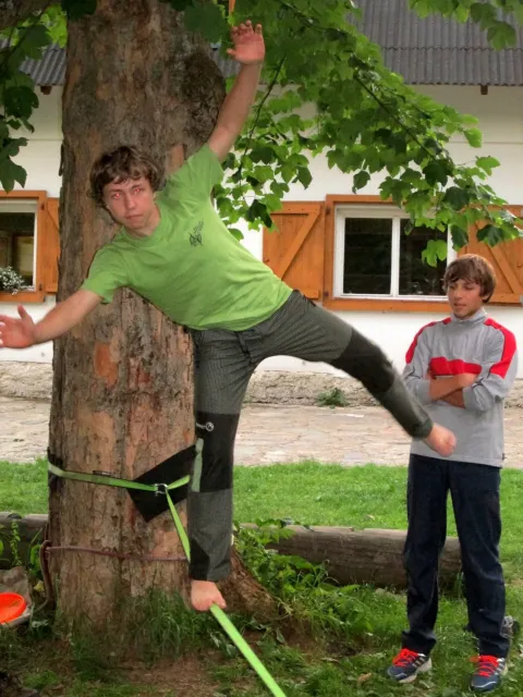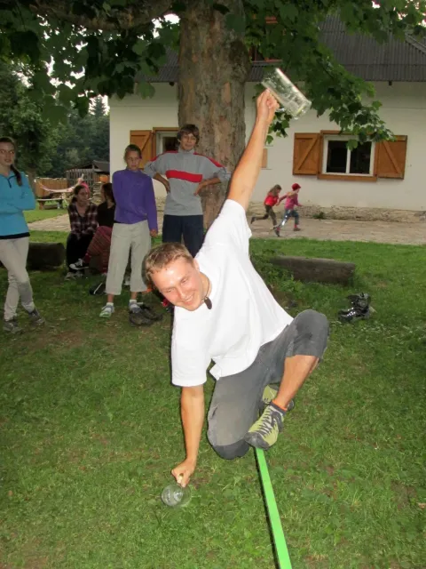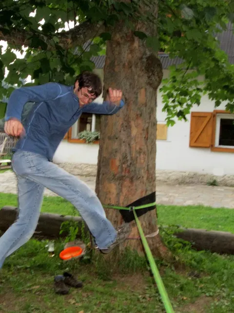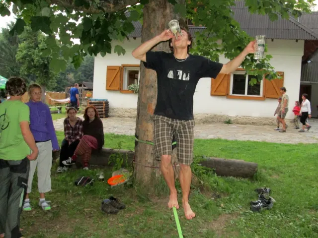 Po večeři Jirka vytahuju slacklinu a napína jí mezi 2 stromy. Vetšina účastníků soustředění na ní stojí poprvé a předhání se, kdo udělá víc než 3 kroky bez držení. Já už na ní trochu umím chodit a Marťas s Peťou a Jirkou jsou na tom ještě líp. Jako dobrý vyvažovací prostředek se osvěčili 2 půllitry od píva, prázdné samozřejmě. Během chození na slacklině na mě byli spácané dva atentáty Jirkou a Marťasem s cílem popálit mě kopřivami. Popré mě ochránila celta, na kterém jsem ležel a s kterou jsem byl vhozen do zeleně. Podruhé mě nic nechránilo, avšak atentát sehnal, protože kytky, které považovali za kopřivy vůbec kopřivami nebyli.Se stmíváním sklízíme slacklinu a ještě chvíli si hazíme s létajícím talířem. S tmou pro hru končíme pro velké nebezpečí našich zubů a jiných částí těla. Asi za 10 minut dostáváme nápad, půjdem se podívat na vyhlídku. Všichni souhlasí a tak směle vyrážíme. Zdenek bere sebou kytaru, ať máme při čem zpívat. Na vyhlídce zazní písničky jako, Bedna od whisky, Tři kříže, Holka modrooká se všemi jejími varianty na různé samohlásky, a mnohé další. Kromě toho taky znělo zparodované Dělání a začalo se uvažovat o úpravě skautské hymny na lezeckou. Od spívání nás vyrušil déšť a rychle slízáme dolů z vyhlídky. Do poslední chvíle neztrácíme naději a čekáme pod převisem, jestli nepřestane pršet. Déšť bohužel neustal a my se neradi vydáváme dolů. Při cestě sháníme nějaký pěkný kámen na mohylu pro usmíření bohů. Jak kameny dopadli na určené místo, skoro okamžitě se zmírnuje déšť a na když dojdem ke stanům, už skoro neprší. Před spaním si dem vyčistit zuby, až na Libora, který nechápe, proč se tak krásný lezecký víkend ničíme hygienou. Po očistě uleháme do stanů a těšíme se na neděli.