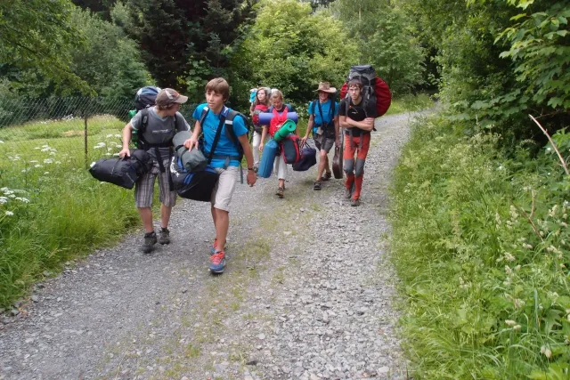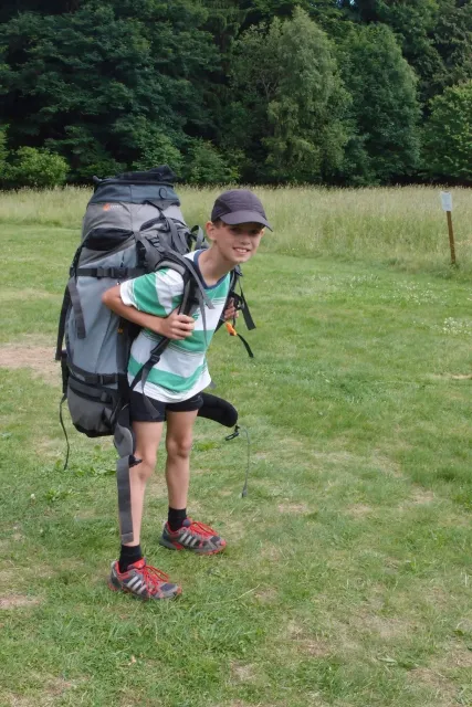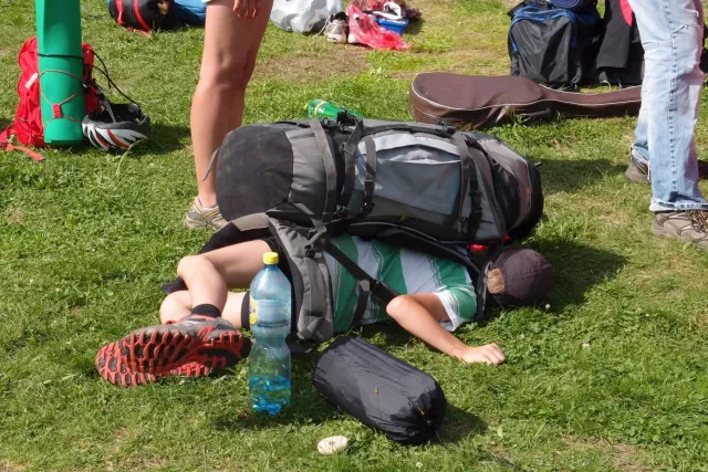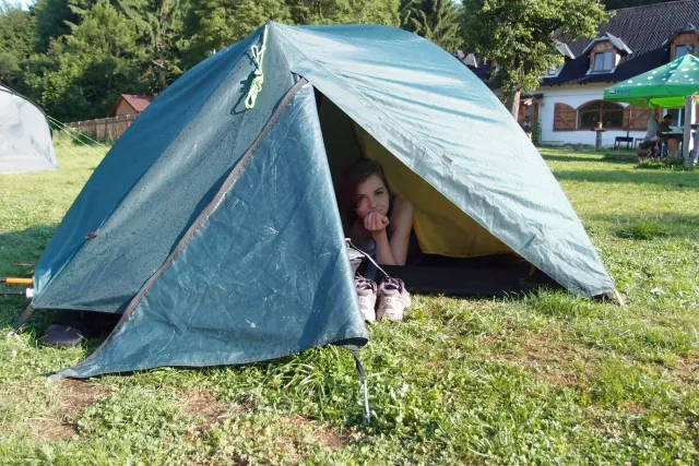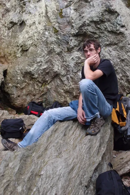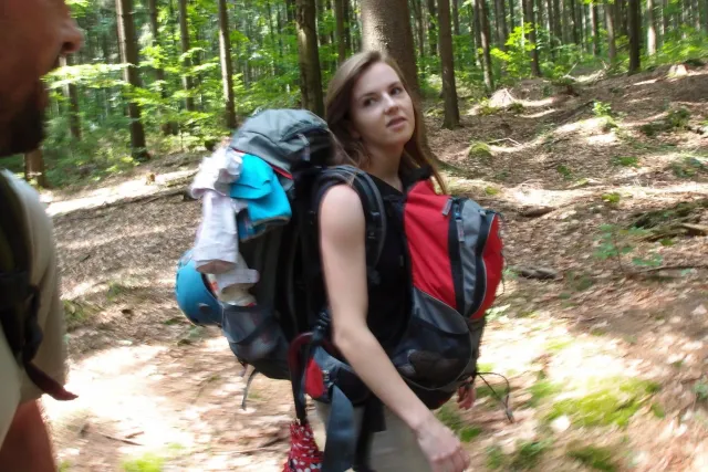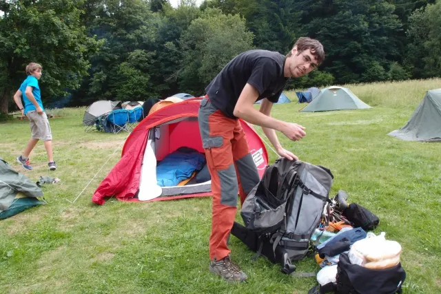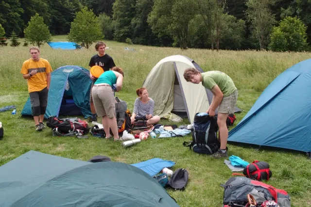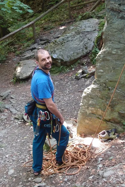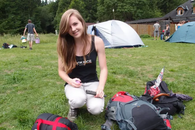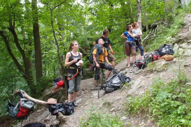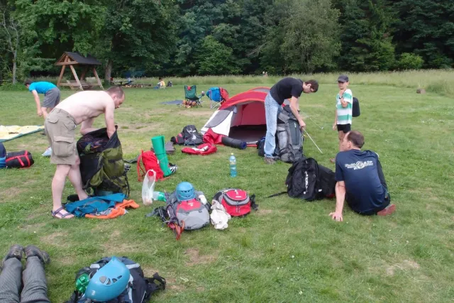 Sešli jsme se v 8 hodin u Alberta, já jsem si nakoupil zásoby a rozdělili jsme se do aut. Z Lanškrouna nás celkem jelo 7. Já, Libor, Anička, Kuba, Zdenek, Monča a trenér Dejv.První zastávka byla v Šumperském albertu, kde jsme všichni dořešili problémi ohledně jídla a Dejv prohlásil, že vetší obtížnost než 8 na Ráblu není, tudíž by tam měl všechno vylízt. Za půl hodiny po nákupu jsme už stepovali v Bedřichově celý natěšený na lezení. Bohužel předtím nás čekal strmý výstup se všema věcma na tábořiště. Odvážně jsme vykročili, přičemž někteří z nás nenesli jenom batohy, ale i hromadu věcí v ruce. Největší nosičkou ve velké konkurenci se stala Monča, která nesla 2 batohy, 3 karimatky a 1 spacák. Dejv mimo jiné na svém batohu táhl satelit. Asi za čtyricet minut jsme došli živí, ale vyčerpání do cíle cesty. Tázávě jsme se ptali vedení, proč jsme sem nemohli vyjet autem, když u chaty jich stojí 2 desítky.