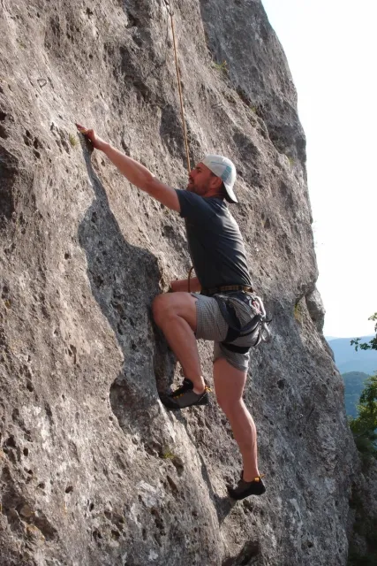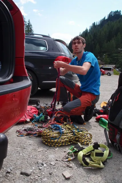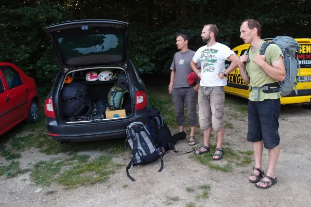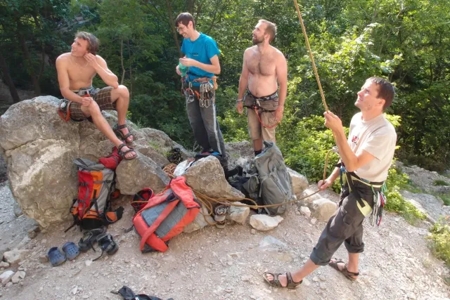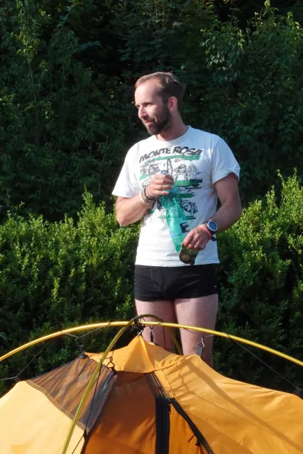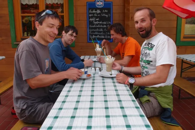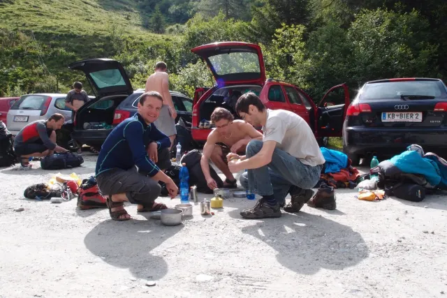 Poprvé se myjeme až následující večer v kempu kousek za Vídní, kde jsme se rozhodli strávit dva půldny lezením na skalách. Nikomu se totiž nechtělo na Stüdlhütte kvůli hygieně utratit čtyři eura za několikaminutovou sprchu, když za stejnou cenu lze pořídit nefiltrované pivo. Těžko říct, kdo smrděl víc, asi všichni stejně.