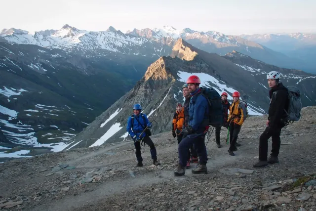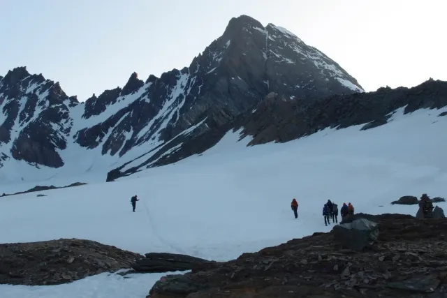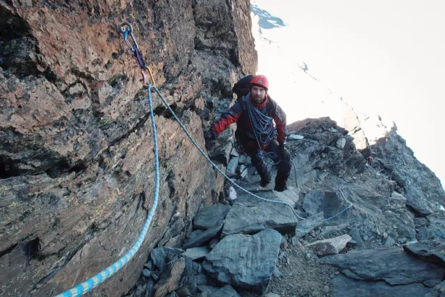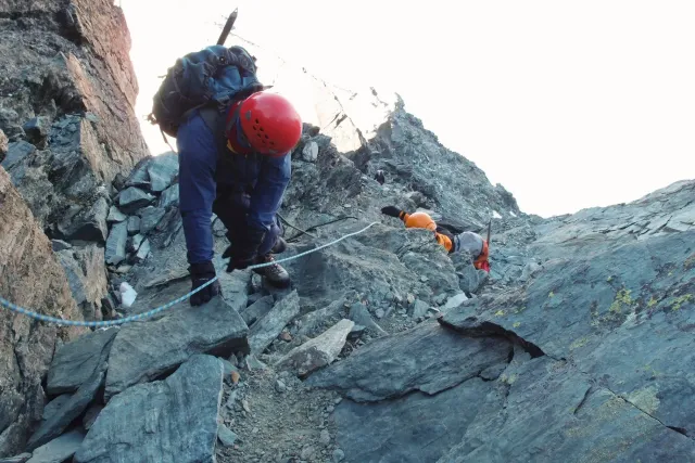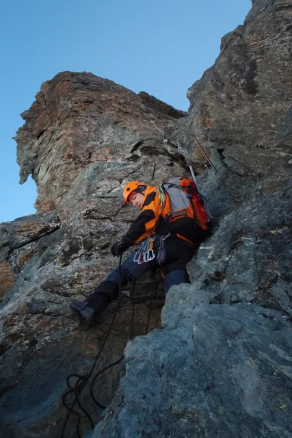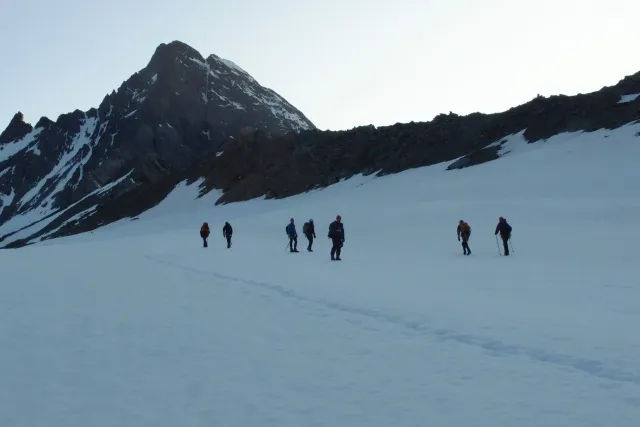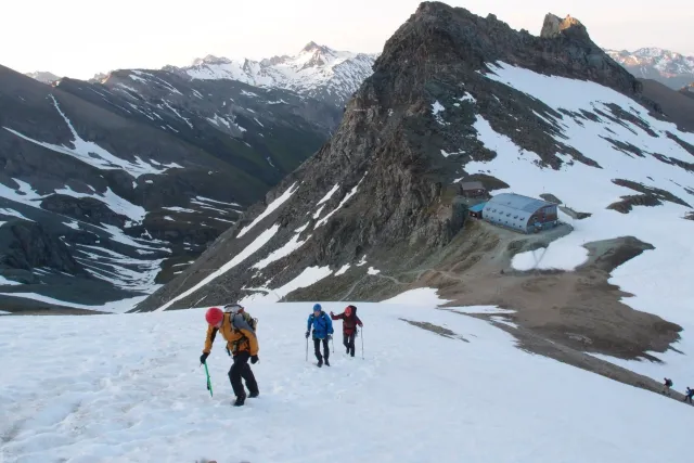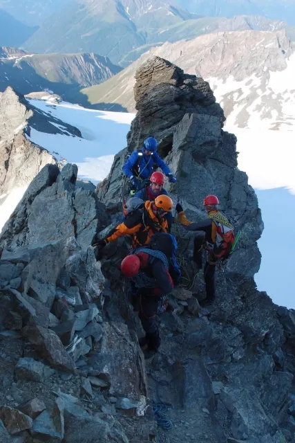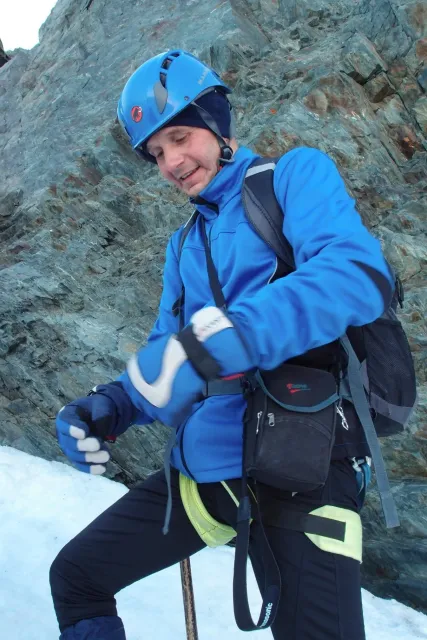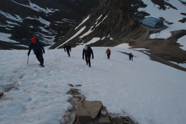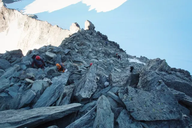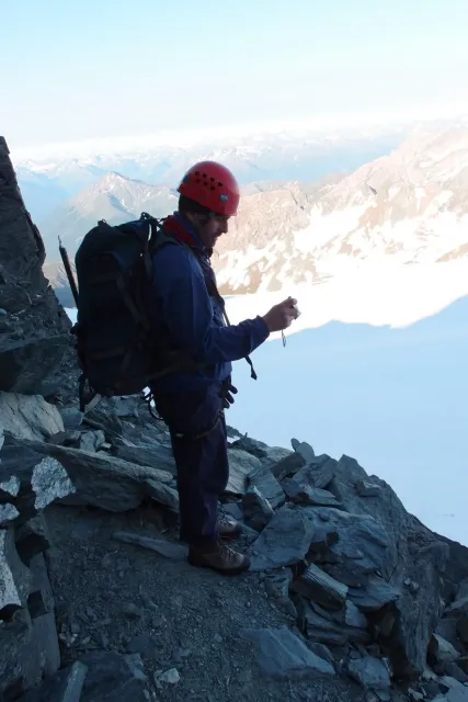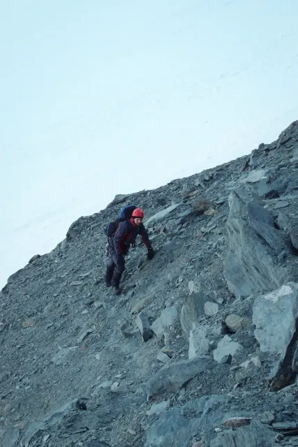 Venku je jasno a mrazivo. Přípravy batohů proběhly večer, teď už vše probíhá bez mluvení a rychle. Mačky, cepín, sedák, smyce, friendy, expresky, rukavice, helma, ledovcové brýle, dostatek pití i trochu vydatného jídla. Nic z toho nesmí chybět. Dole jen popadnu hole a pečlivě zalepím paty proti odření. Stejně jako i v při jiných podobných túrách zbytečně. V šest začínáme stoupat příkrým svahem, na kterém se střídá zmrzlý sníh a skála až k ledovci, po kterém postupujeme rychle vzhůru. U odtrhu pod hranou hřebene Stüdlgrat jsme za hodinu. Šlo to rychle a od chaty jsme se posunuli o bezmála 400 výškových metrů. Po krátké poradě se rozhodujeme, že počáteční metry polezeme sólo bez jištění. Lehký horolezecký terén to umožňuje, ale znamená to i maximální soustředění. Teplota je stále pod nulou a na sever obrácenou stranu hřebene místy podniká výpady silný nárazový vítr. Za několik desítek minut dosahujeme „ostří hřebene“ a i přes prozatím celkem snadný výstup se ve dvojicích navazujeme na lano. Volíme taktiku současného výstupu obou lezců, mezi kterými se průběžně zakládá jištění. I díky tomu postupu zakrátko dosahujeme důležitého bodu Frühstückplatz (snídaňové místo) s výškou 3550m. Odtud se hřeben ještě o něco více napřímí a začíná skutečné lezení. Odhadujeme, že závěrečných 350 výškových metrů zdoláme za dvě hodiny. Výstup se však zpomaluje a některé těžší úseky lezeme jeden po druhém s relativně