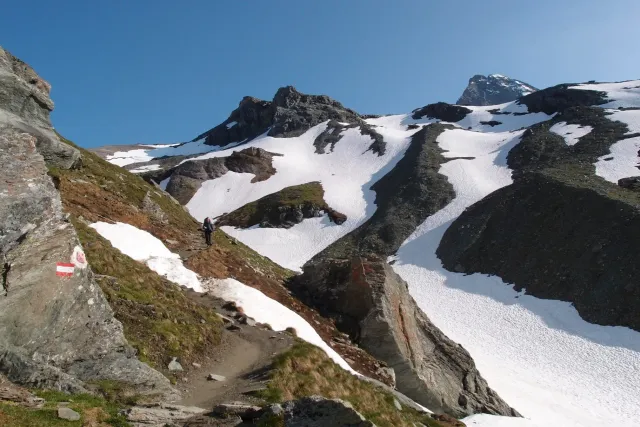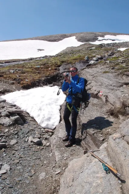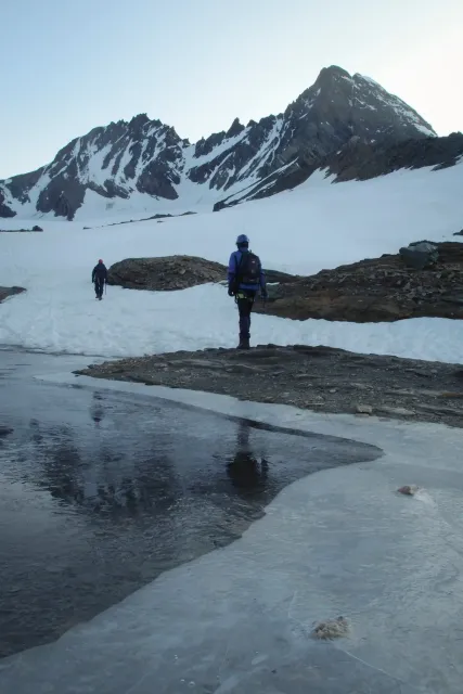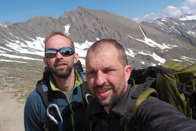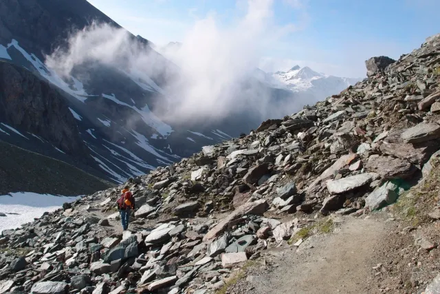 Šlapu do kopce na chvostu osmičlenné skupiny a vnitřně si nadávám, protože mě výstup s báglem stojí více sil než jindy. Netrénoval jsem, jak by bylo potřeba a tak poněkud lapám po dechu. Čeká nás asi 1000 výškových metrů a přemýšlím, co pražského obchodníka Johanna Stüdla vedlo k tomu, aby v sedle ve výšce 2802m nechal postavit už v roce 1864 horskou boudu. Cestou zjišťuji, že mi z trekové hole odpadl ochranný klobouček. Svůj nenacházím, ale leží zde jiný, pasuje přesně, tak ho našroubuju nad hrot a mám pocit, že je to dobré znamení.