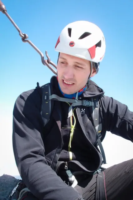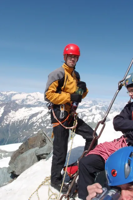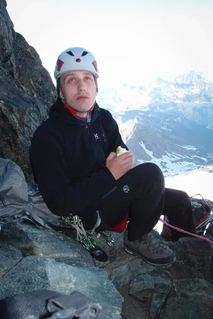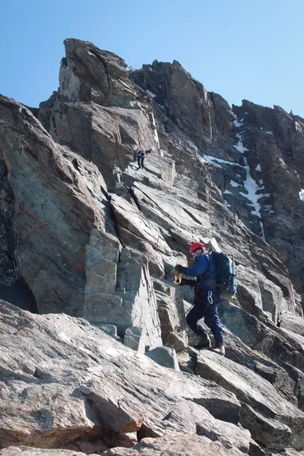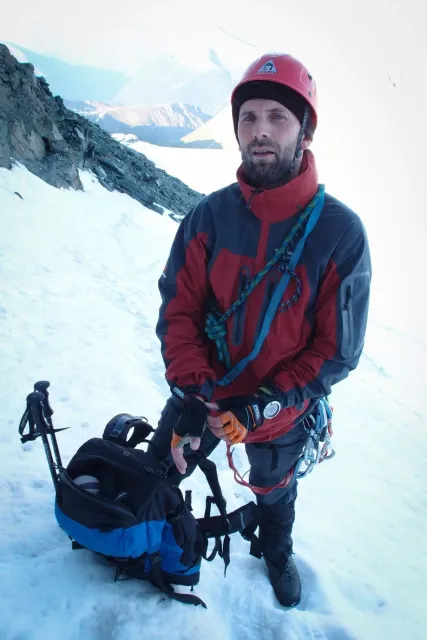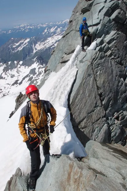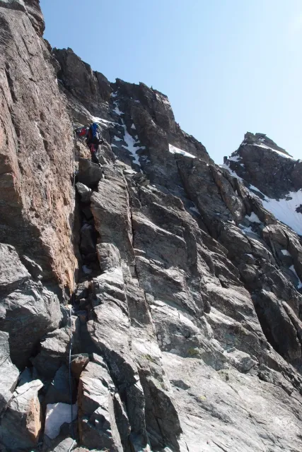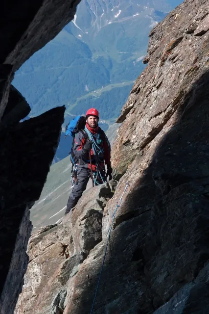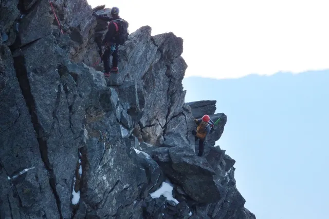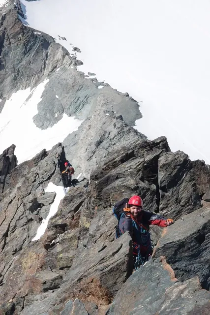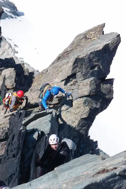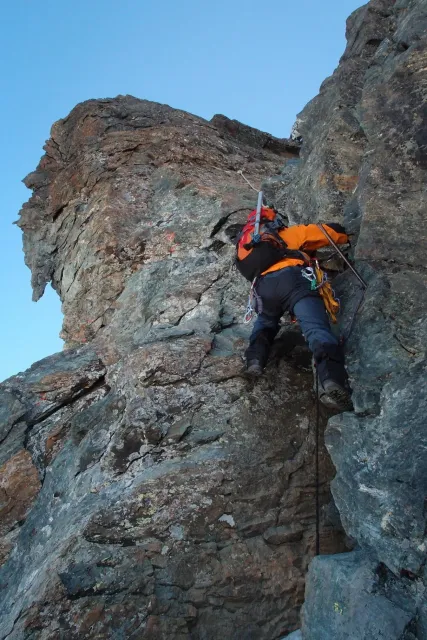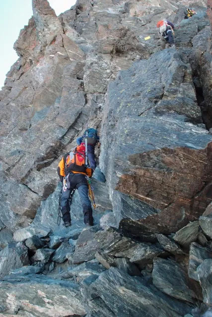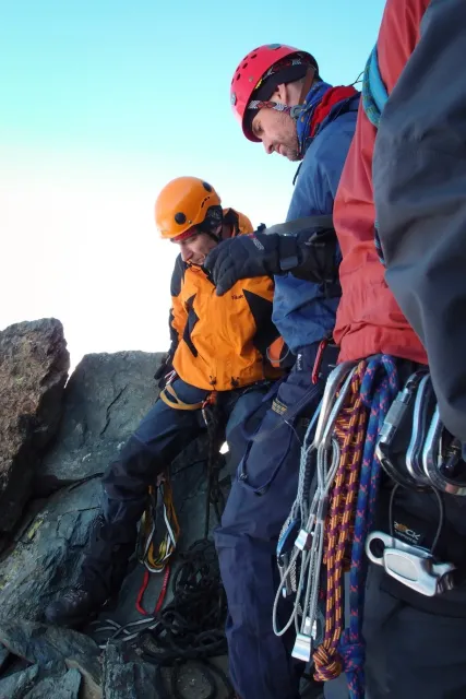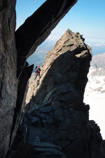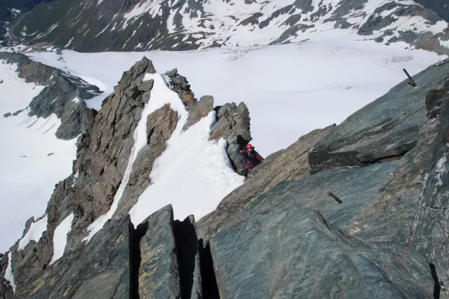 Na osluněné části hřebene slunce doslova peče a tak cítím, že mi pot ztéká po zádech. Ve stínu stále mrzne, ale i přesto měním zimní rukavice za cyklistické. To se hodí hned v následující pasáži, kterou si hned po vyhoupnutí se na vrchol hřebene vybavuji z fotografie na netu. Ve výšce 3690 m leží na velmi exponovaném místě nakloněná hladká hrana. Mělo by to být jedno z těch těžších míst, ale na povrchu nacházím drobné lišty a tři tutové boráky k zajištění, takže přelezení mi netrvá déle než tři minuty. Vrchol je téměř na dosah, ale postup se na několik desítek minut zastavuje. Petr s Milanem, kteří stoupají před námi dolezli maďarskou dvojici a musí čekat. Mně je na sluníčku zrovna docela dobře, ale Libor mrzne ve stínu. Trvá téměř půl hodiny, než můžeme pokračovat ve výstupu. Čeká nás znovu přesun do stínu. Tentokrát zúžením, do kterého se snad každý z nás i s báglem docela slušně zašprajcuje.Vykláním se nad stometrovou hlubinu a píďalkovitým pohybem se snažím uvolnit z téhle krkolomnosti. Libor se popadá za břicho, když vidí, jak bojuju a pak mi popisuje vlastní, neméně zábavnou metodu průlezu.