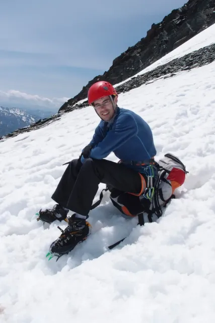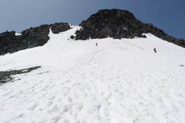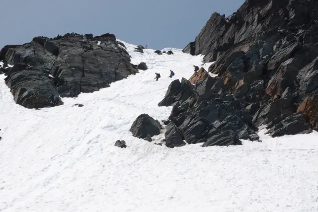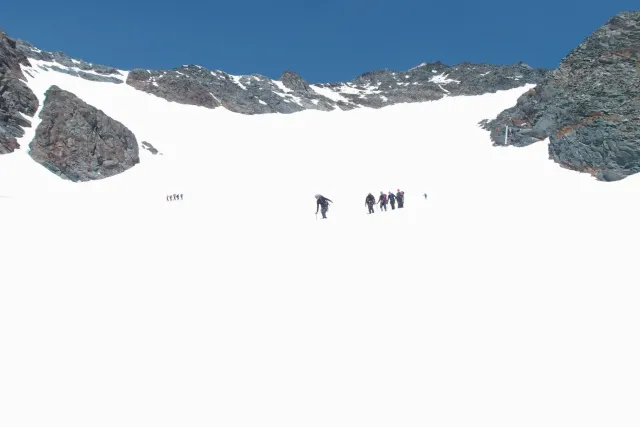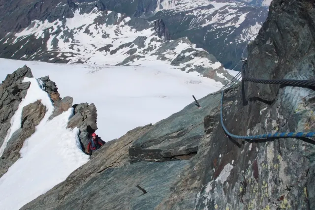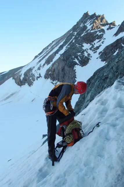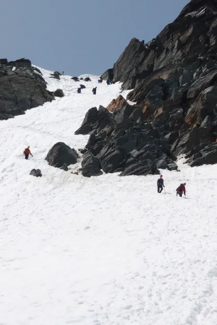 Hned v zápětí se ukazuje, že lano mezi mnou a Liborem potřebuje z důvodu bezpečnosti přece jen prodloužit a tak se snažím odmotat 2 – 5 metrů z asi dvacítky záložních. Libor v tu chvíli stojí na úzkém chodníčku nad exponovaným žlebem a oprávněně vnímá situaci s neblahými pocity. David už se na mou marnou snahu nemůže dívat a pomáhá mi vše uspořádat, tak jak se má. Nadávám si, že mám lano zašmodrchané do smyc a vše řešíme v nepříliš vhodné části sestupu. Opouští mě pohoda i koncentrace. Potřebuju víc cukru, ale poslední sojový suk zabírá jen částečně. Za malým Glocknerem docházím, no to neuhodnete, jinou, ale znovu maďarskou dvojici lezců a konvoj osmi lanškrouňáků tak opět zpomaluje. Cesta se po chvíli stáčí vlevo do ostrého svahu pokrytého rozbředlou vrstvou sněhu. Sklon ve vrchních partiích žlebu odhaduji okolo 50° a sestupová linka vede cik-cak mezi skalisky. Z batohu odvazuji cepín a nasazuju mačky. Ty ve sněhové kaši vůbec nedrží, bořím se a místy propadám až po pás, částečně jde i o sjezd po zadku, bodec cepínu zajíždí do sněhu vždy až po rukojeť. Ostatní jsou na tom podobně, vypadáme jak parta opilců.