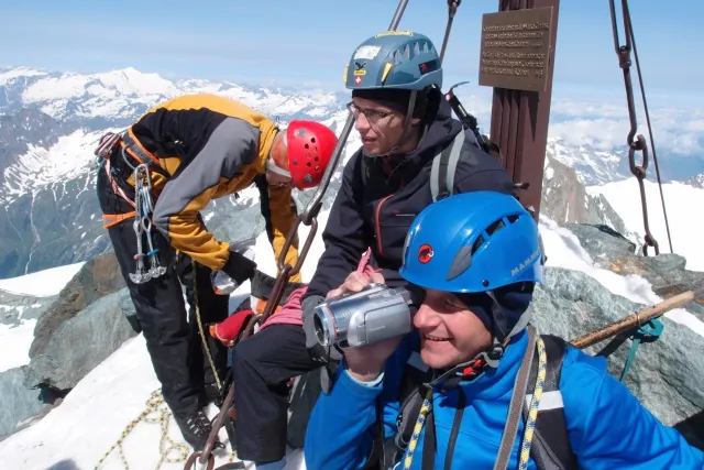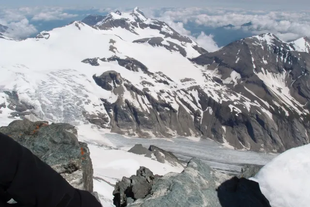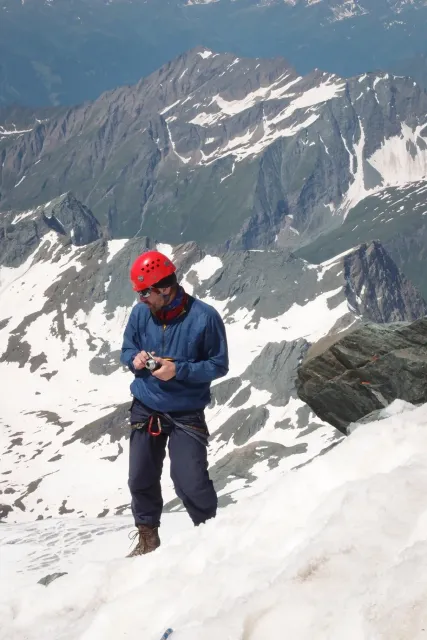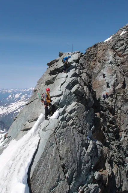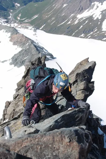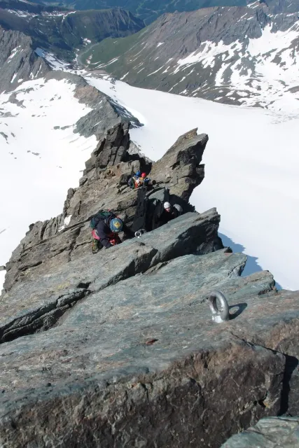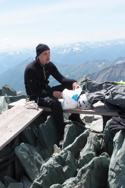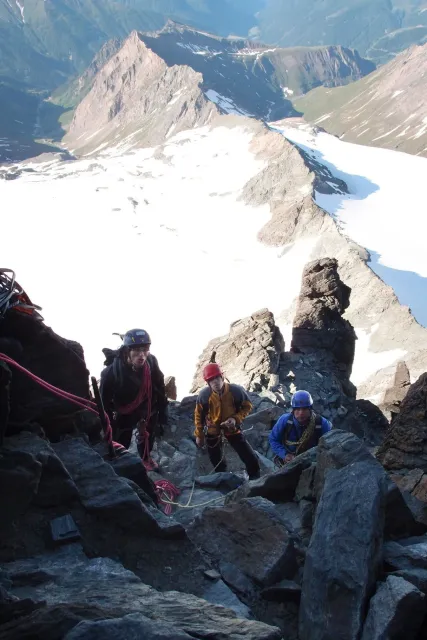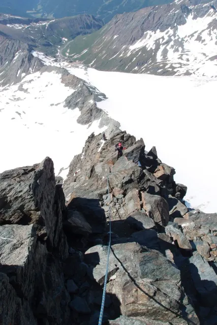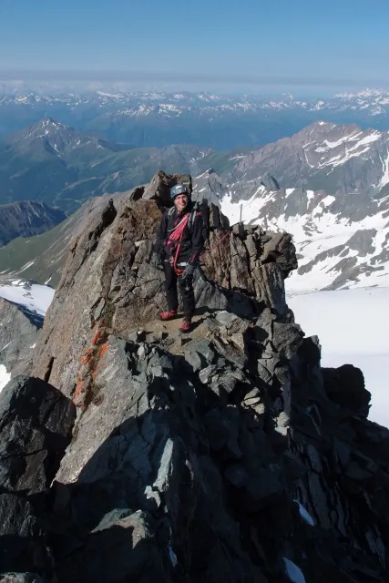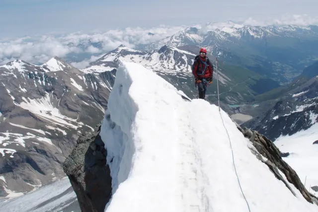 Majestátný jehlan lze zdolat několika cestami, tři z nich jsou všeobecně nejznámější. Nejčastěji lezená cesta vede východním hřebenem, který má nejpříznivější sklon a lze do něj nastoupit od chaty arcivévody Johanna, ležící ve výšce 3454m. Za příznivých podmínek se výstup odtud dá zvládnout za 2 – 3 hodiny. Ze severu vede na vrchol klasická „zimní“ cesta Pallavicciniho žlebem s převahou lezení po příkrém firnu a ledu, to je ale trošku jiné kafe. My zvolili třetí variantu – výstup na vrchol od JZ z chaty Stüdlhütte po hřebenu Stüdlgrat a sestup klasickou cestou přes malý Glockner a východní hřeben. Následující popis berte jako s mírnou nadsázkou psaný deníček pocitů z výstupu.