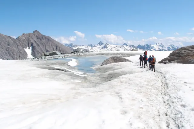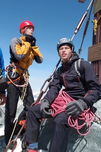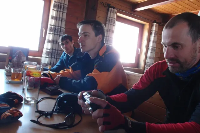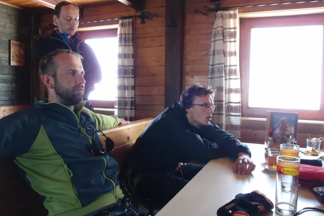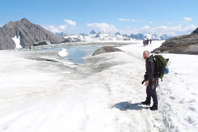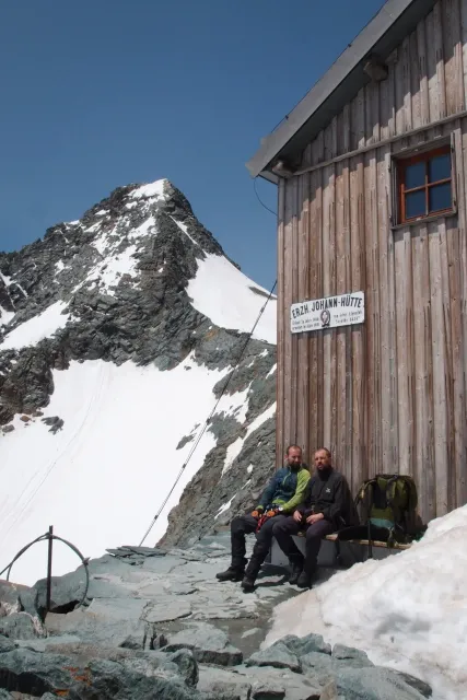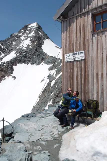 V dolní partii očekáváme, že už nastává pohoda a tak na sebe navzájem čekáme. Pohyb závěrečné skupinky však prozrazuje, že něco není v pořádku. Martin doslova klopýtá svahem a Milan s obavami vysvětluje, že je mu zle a zvracel. Příšerně ho bolí hlava a motá se, je evidentní, že se potřebuje dostat dolů, protože nadmořská výška, nedostatek tekutin a únava udělaly své. Nezbývá, než ho rychle dostat do nejvýše položené rakouské chaty arcivévody Johanna. Zde se snažíme Martina postavit na nohy čajem, ale výsledkem je další „šavle“. Jsme stále moc vysoko. Nesmírně ochotný chatař, který dobře ví, o co jde, mu nakape do vody látku na posilnění oběhu. David si Martina naváže na lano a ten se ještě jistí karabinami k ocelovému fixu ferraty. Začíná poslední obtížnější část sestupu. Za dvacet minut klesáme o dalších 300 metrů a Martin se vzpamatovává. Pohodlná cesta rozbředlým sněhem na povrchu ledovce nás rychle přibližuje k místu noclehu, chatě Stüdlhütte. S Lubošem testujeme jízdu po zadku a dobře 80 výškových metrů si takto zpříjemňujeme. Nápad to byl v mém podání samozřejmě pitomý, protože nemám nic na převlečení a s promočeným zadkem později nemůžu s ostatními na pivo. Skoro hodinu musím čekat, než mi kaťata uschnou. Plánovaná