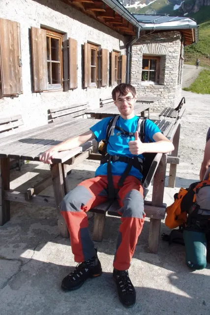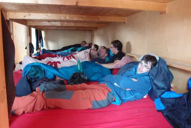 Za dvě hodiny stojíme u chaty, je tu kosa a překrásný výhled. Už chápu Johanna Stüdla. Moderní design chaty mě fascinuje, vysoušeče bot, obrovitý talíř pikantní asijské polévky i čepované kvasnicové pivo taky. Rakouští vojáci vedle u stolu popíjejí pivo a prokládají ho panáky něčeho ostřejšího, vojáci německého Bundeswehru srkají jablečný džus. Všichni se shodujeme na tom, ve které armádě bychom chtěli sloužit. Spát jdeme včas, ale do místnosti se po zhasnutí neustále trousí další alpinisté a zespodu hlomozí opilecké popěvky Rakušáků. Stávat máme okolo páté, ach jo.