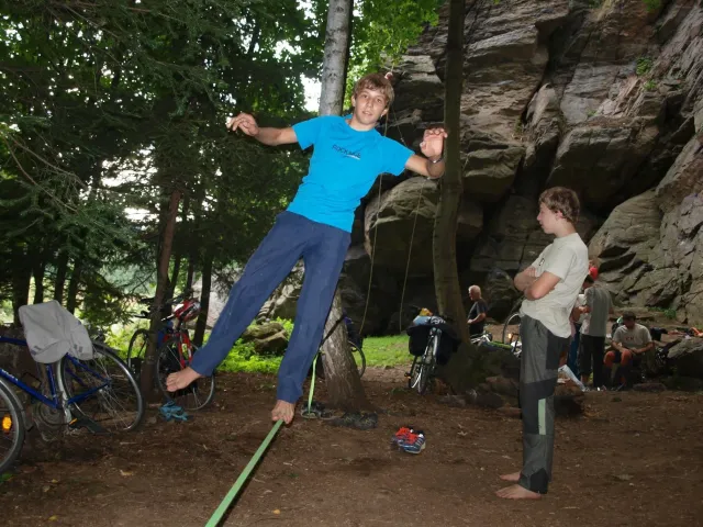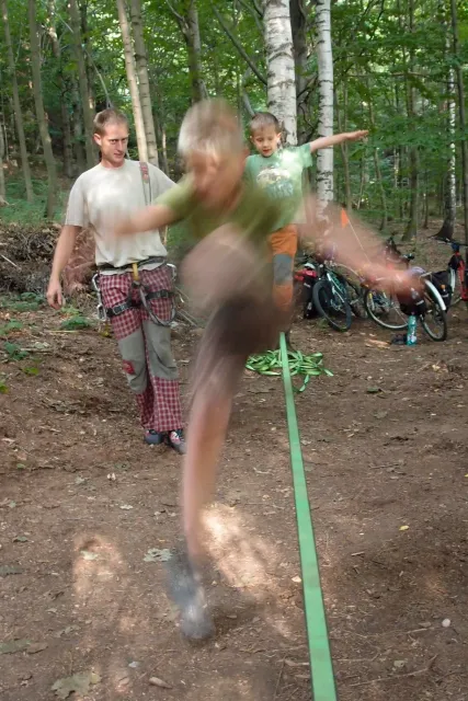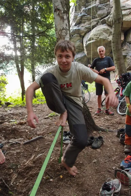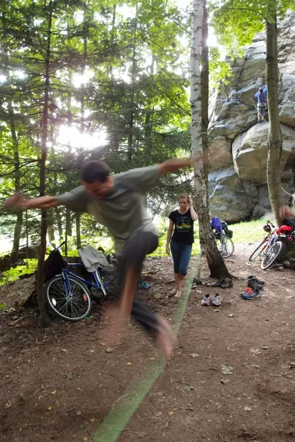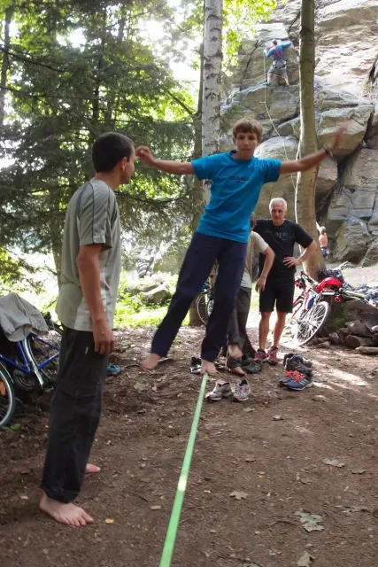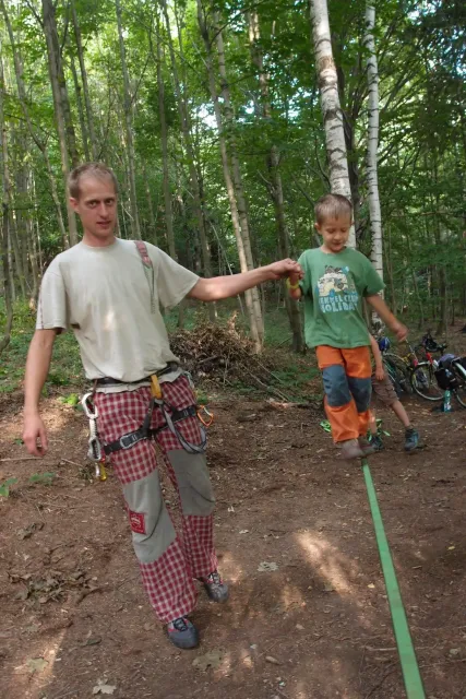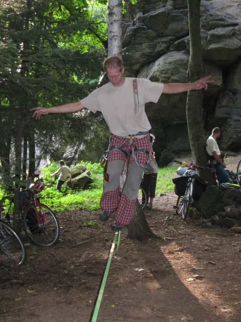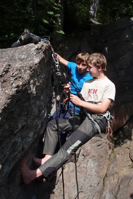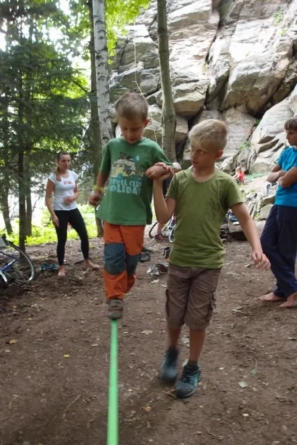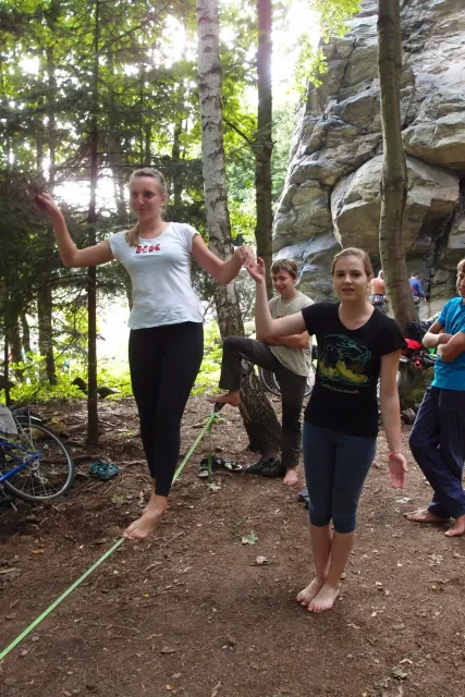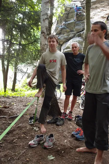 První část vyjela ve složení: Luboš Vyhnálek, Libor, Anička, Terka a Já. Cesta do Jablonýho byla v pohodě, jeli jsme pohodovým tempem a proto jsme ke zmrzlině dorazily asi ve třičtrvtě na dvanáct. Dospělí nezklamali, na zmrzlinu nešli a šli kousek vedle do hospody na první dnešní pěnivý mok. Asi za půl hodinky dorazil Zdenek s Kubou a mohli jsme znovu vyjet na zbytek náročné cesty. Poslední velký kopec nás čekal před Celným, který všichni úspešně vyjeli bez nadávek a slízaní s kola a za chvíly jsme už byli na Mladkově. Začali jsme bušit a asi kolem 3 dorazil vozič zavazadel Dejv, Karel Skalický s rodinkou a moji oba rodičové. Všichny jsme makali a za zmínění stojí Pic Badile natažený Aničkou, Kubovi a moje pokusy na Koblížkovi ( bohužel marné ), Kubou natažená Růže s menším letem na závěr :D, přelezení Růže Liborem na druhým a nová pohádka vymyšlená debatním kroužkem při jištění Terky na Badilákovi nazváná Pohádka o Terce. Čas plynul a pro slabost rukou jsme natáhli Liborovu slack lainu, na které jsme se dosita vyblbli a samy sobě zasmáli. Při zjištění, že mám píchlé kolo jsem hned šel opravovat, ale dospělí ve velké míře nabízeli pomocí a společnýma silama mi opravili kolo.