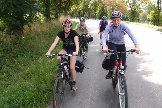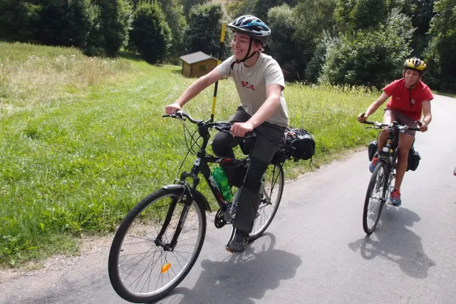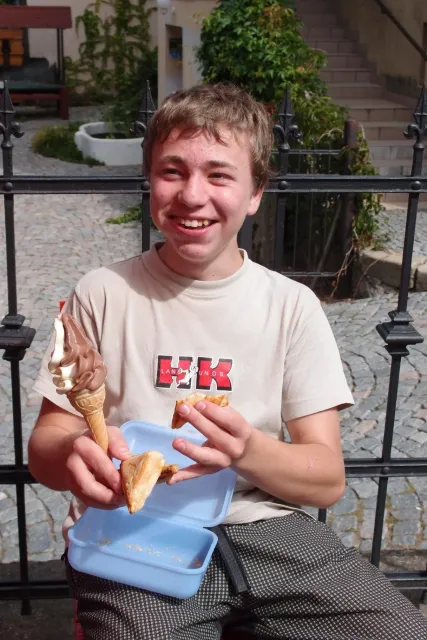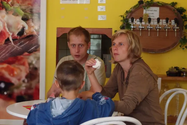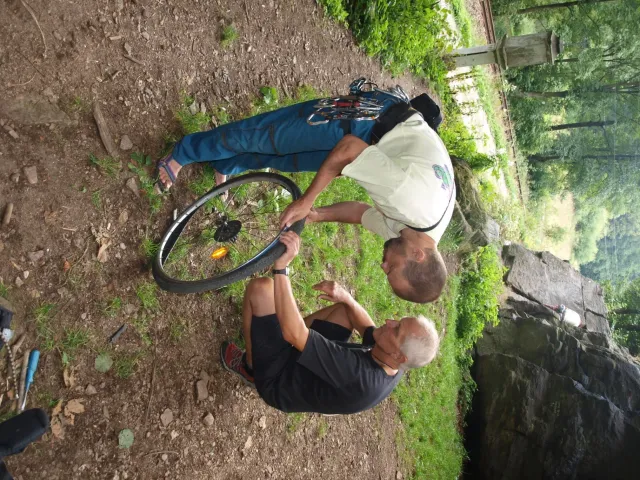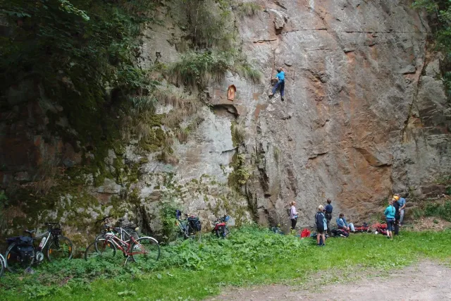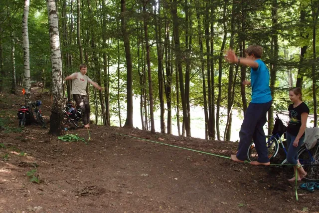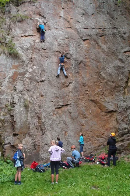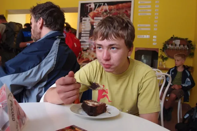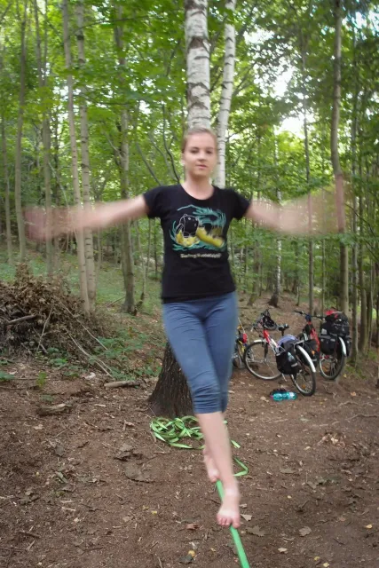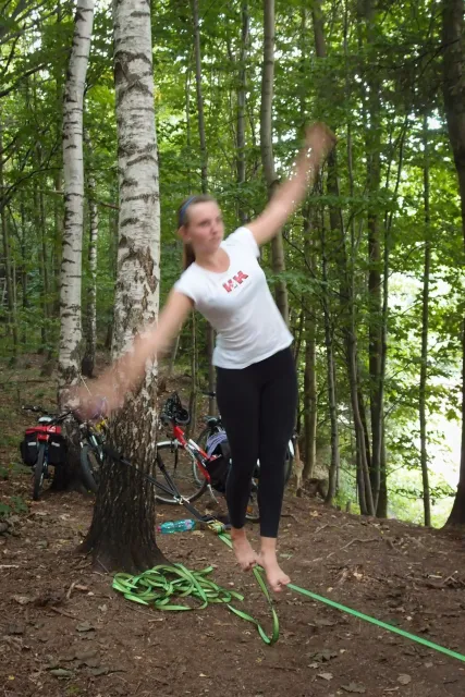 První část vyjela ve složení: Luboš Vyhnálek, Libor, Anička, Terka a Já. Cesta do Jablonýho byla v pohodě, jeli jsme pohodovým tempem a proto jsme ke zmrzlině dorazily asi ve třičtrvtě na dvanáct. Dospělí nezklamali, na zmrzlinu nešli a šli kousek vedle do hospody na první dnešní pěnivý mok. Asi za půl hodinky dorazil Zdenek s Kubou a mohli jsme znovu vyjet na zbytek náročné cesty. Poslední velký kopec nás čekal před Celným, který všichni úspešně vyjeli bez nadávek a slízaní s kola a za chvíly jsme už byli na Mladkově. Začali jsme bušit a asi kolem 3 dorazil vozič zavazadel Dejv, Karel Skalický s rodinkou a moji oba rodičové. Všichny jsme makali a za zmínění stojí Pic Badile natažený Aničkou, Kubovi a moje pokusy na Koblížkovi ( bohužel marné ), Kubou natažená Růže s menším letem na závěr :D, přelezení Růže Liborem na druhým a nová pohádka vymyšlená debatním kroužkem při jištění Terky na Badilákovi nazváná Pohádka o Terce. Čas plynul a pro slabost rukou jsme natáhli Liborovu slack lainu, na které jsme se dosita vyblbli a samy sobě zasmáli. Při zjištění, že mám píchlé kolo jsem hned šel opravovat, ale dospělí ve velké míře nabízeli pomocí a společnýma silama mi opravili kolo.