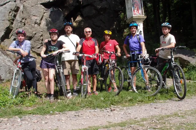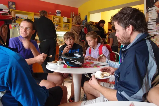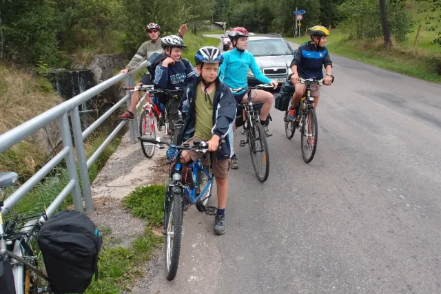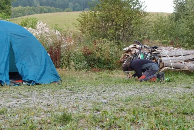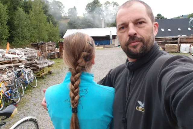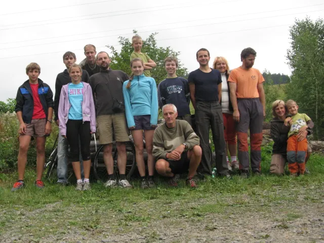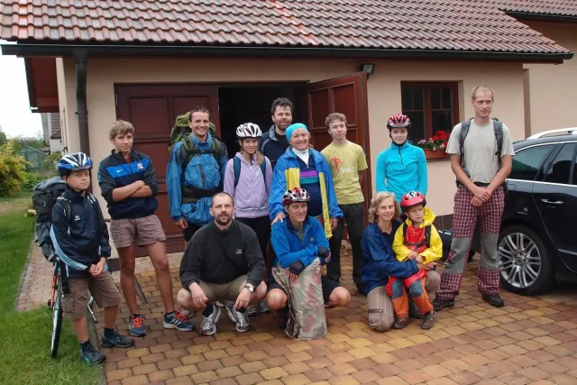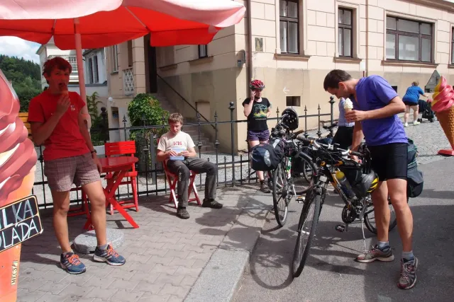 U Libora jsme se sešli v 10.00. Když jsem přijížděl, překvapil mě velký počet účastníků. Až po chvíli mi došlo, že za to může z velké části pouze rodina Gregorů. Za chvíli odjeli na den otevřených dveří v Inně s tím, že nás Zdenek s Kubou dojedou u zmrzliny v Jabloným a Monča dojede autem večer po závodě. Ještě jsem s Liborem uvázali můj baťoh na nosič slušivou růžovou šnůrou a mohly jsme vyjet...