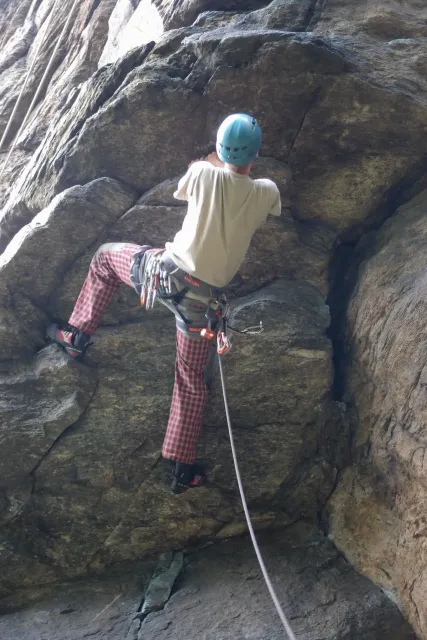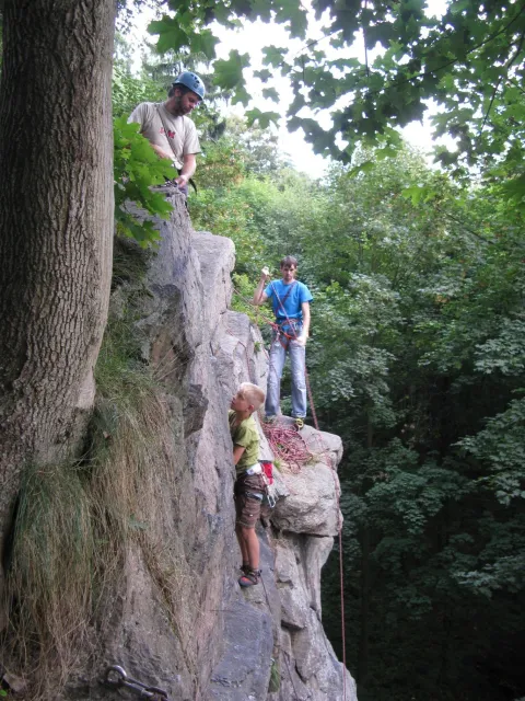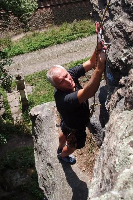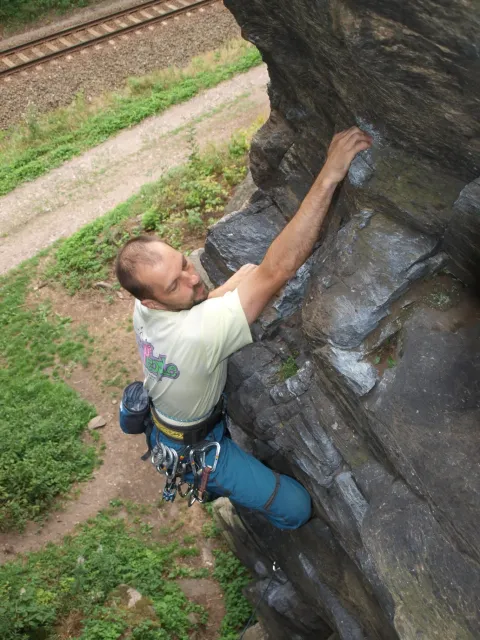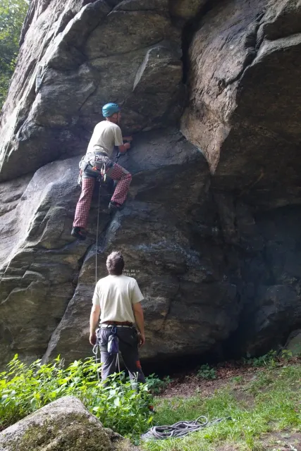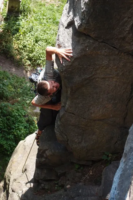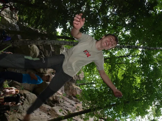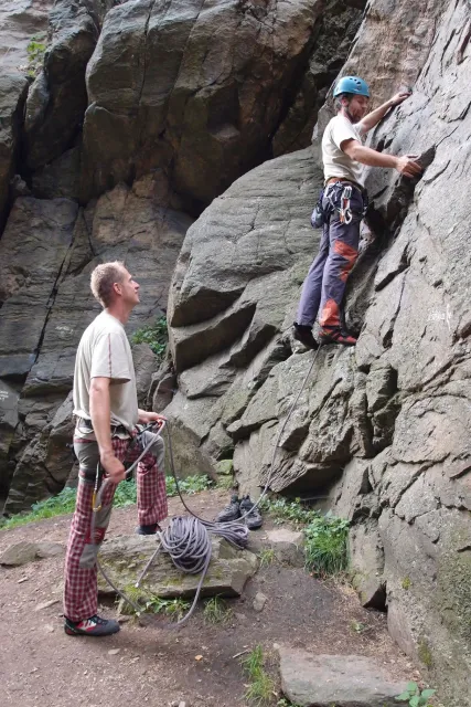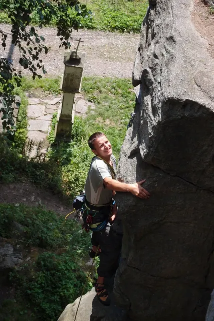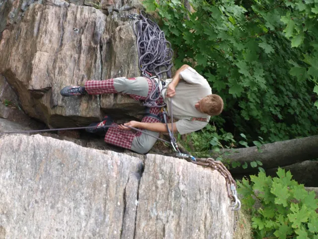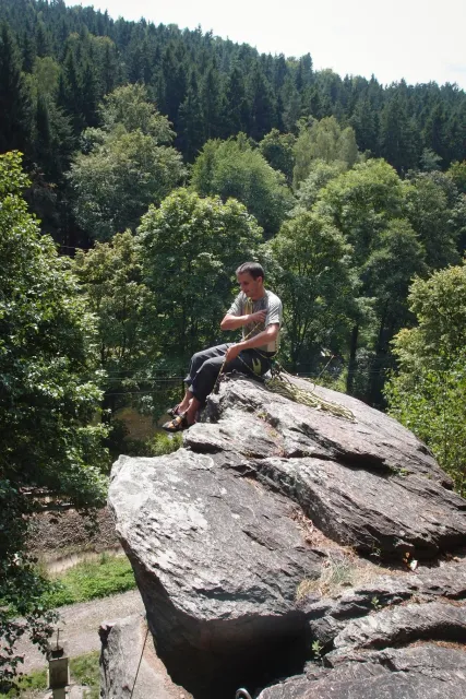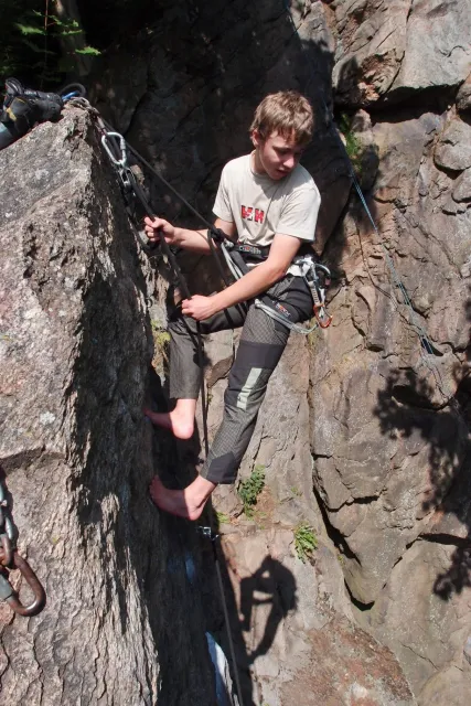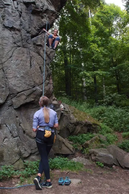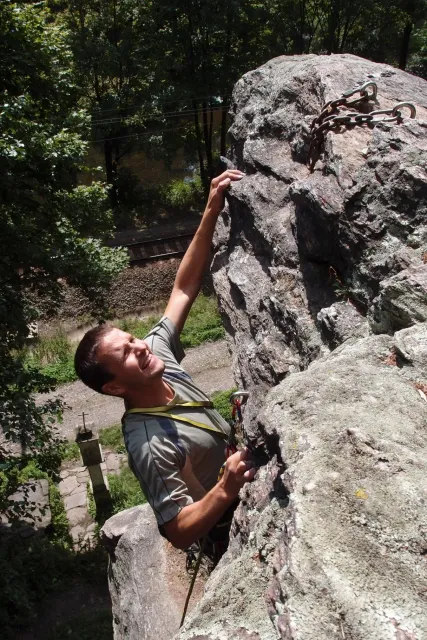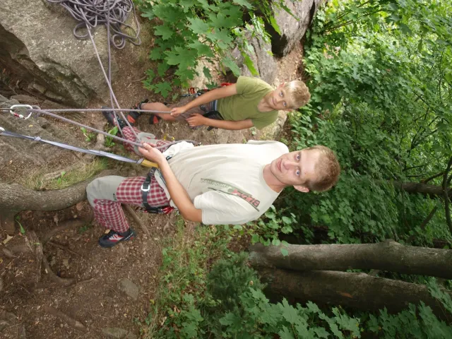 Gregorovy nezklamaly, stejně jako na Ráblu jeli ráno do kostela v Jabloným. Po probuzení ostatních byla klidná hromadná snídaně u ohně, který zapálil topič Matěj. Následovalo obdivování Martinový sprchy, která se zkládala z Koryta, které vedlo vodu z pastvin a končilo nad dřevěnou paletou s dírou uprosřed sloužicí jako vana. Někteří z nás teplotu vody vyzkoušely na vlastní kůži( dobrovolně i nedobrovolně ). Před odjezdem jsme ještě změnili kvůli počasí cíl cesty, ze Studenýho na Jablonné. Před desátou jsme opustily tábor a vyjeli na vstříc jablonému. Do hodinky jsme pod skálou a dělíme se na dvě skupiny. Jedna jde na Vlčí tlamu, druhá zůstává na Placce a potkává Martina Břízů( Já, Libor, Anička, Monča, Zdenek, Kuba, Matěj a Dejv jsme na placce). Natáhneme Natálku, Dejv natáhne Nechť je prča a jdeme bušit. Kuba se pustí do Veroniky ( 7+ ) na prvním. Pomalu dolezá asi do půlky a je u klíčového místa. To po chvilce přelízá a zasekává se nad ním, půl metru pod borhákem. Snaha veliká, leč marná a Kuba jde po několika pokusech dolů. Lezečky značky Saltik mu asi moc nepomohly. Ještě asi hodinku rubem a když balíme, dorazí druhá část z výpravi z Vlčí tlamy. Akci zakončíme v cukrárně u Luxů a za deště vyjíždíme do Lanškrouna, ve kterém jsme za hodinku a pár minut k tomu. U Libora oficiálně akci ukončíme a rozjedeme se domů.