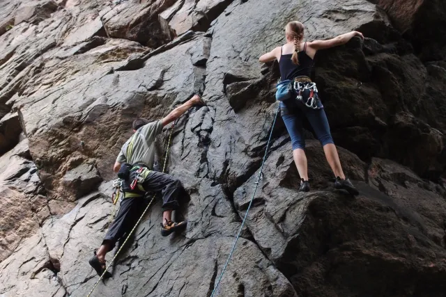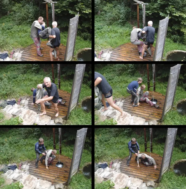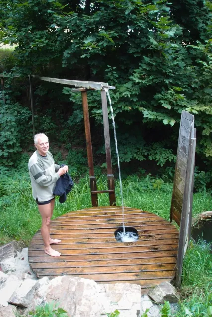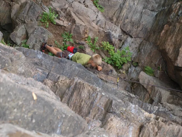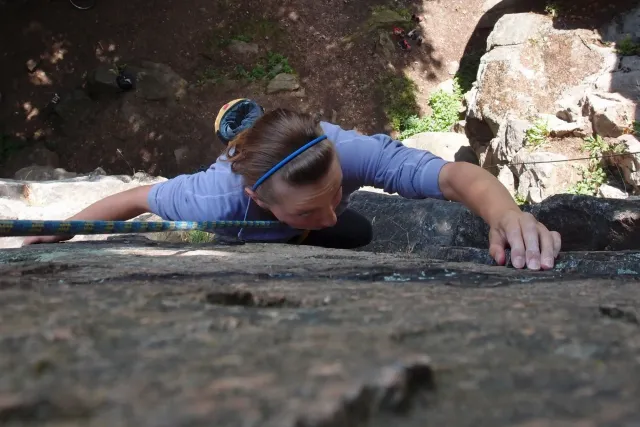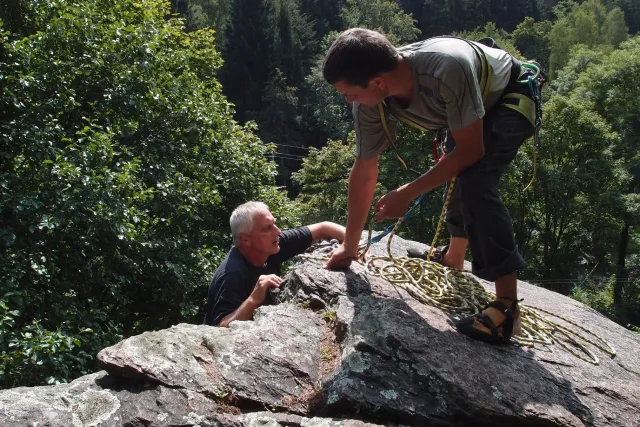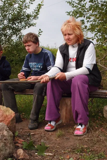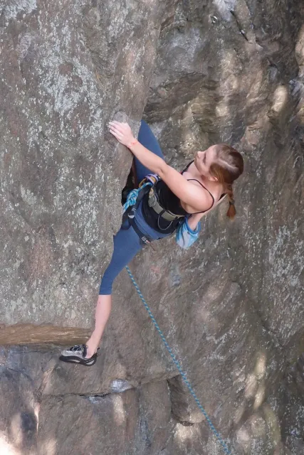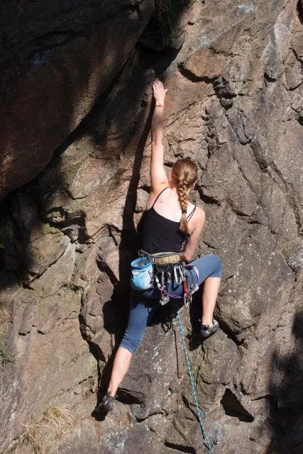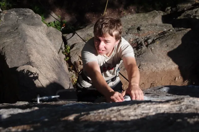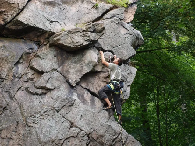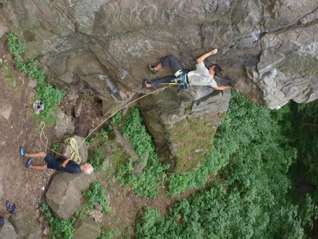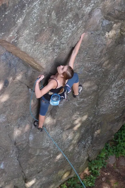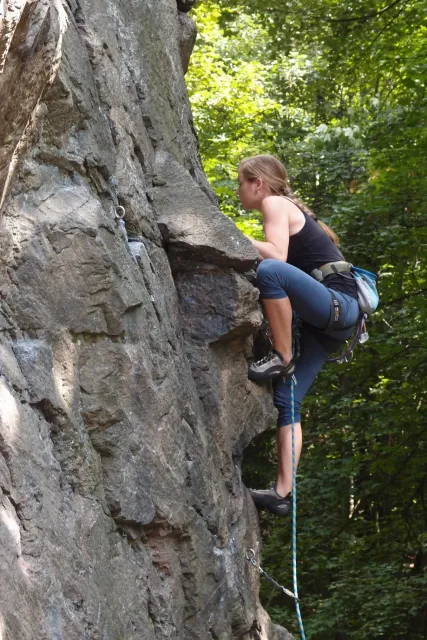 Gregorovy nezklamaly, stejně jako na Ráblu jeli ráno do kostela v Jabloným. Po probuzení ostatních byla klidná hromadná snídaně u ohně, který zapálil topič Matěj. Následovalo obdivování Martinový sprchy, která se zkládala z Koryta, které vedlo vodu z pastvin a končilo nad dřevěnou paletou s dírou uprosřed sloužicí jako vana. Někteří z nás teplotu vody vyzkoušely na vlastní kůži( dobrovolně i nedobrovolně ). Před odjezdem jsme ještě změnili kvůli počasí cíl cesty, ze Studenýho na Jablonné. Před desátou jsme opustily tábor a vyjeli na vstříc jablonému. Do hodinky jsme pod skálou a dělíme se na dvě skupiny. Jedna jde na Vlčí tlamu, druhá zůstává na Placce a potkává Martina Břízů( Já, Libor, Anička, Monča, Zdenek, Kuba, Matěj a Dejv jsme na placce). Natáhneme Natálku, Dejv natáhne Nechť je prča a jdeme bušit. Kuba se pustí do Veroniky ( 7+ ) na prvním. Pomalu dolezá asi do půlky a je u klíčového místa. To po chvilce přelízá a zasekává se nad ním, půl metru pod borhákem. Snaha veliká, leč marná a Kuba jde po několika pokusech dolů. Lezečky značky Saltik mu asi moc nepomohly. Ještě asi hodinku rubem a když balíme, dorazí druhá část z výpravi z Vlčí tlamy. Akci zakončíme v cukrárně u Luxů a za deště vyjíždíme do Lanškrouna, ve kterém jsme za hodinku a pár minut k tomu. U Libora oficiálně akci ukončíme a rozjedeme se domů.