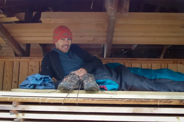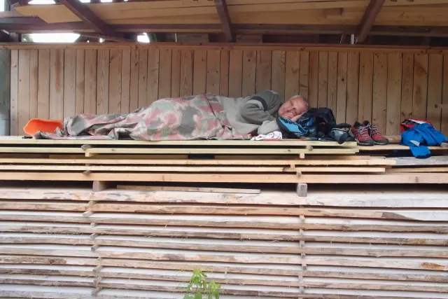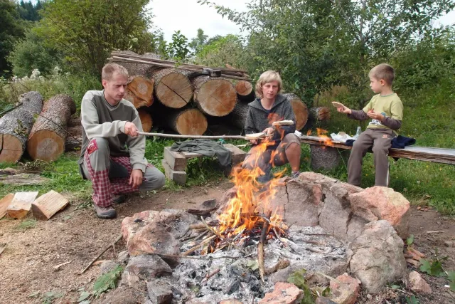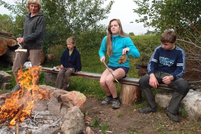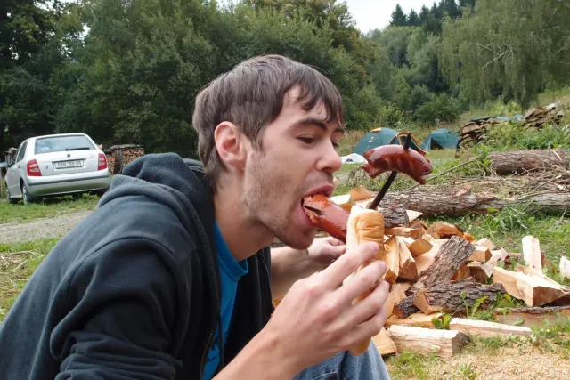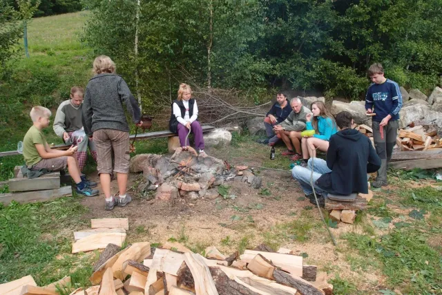 Po pylné práci nás čekala zasloužená odměna, jako vždycky v hospodě. Někteří dospělí si dávali už dnešní druhý pěnivý mok. Dejv musel apstinovat, řídil, proto mu joho oblíbené pivko nahradila malá kofola a samozřejmě kafe. Při pylných radách, jakým způsobem si mám vydělat na Paklenici, jídlo rychle ulteklo a odjely jsme na místo noclehu u Martina na pile( v Celném ). Na místě jsme připravili dřevo na táborák, postavili stany a líní si připravili noclech na dřevě pod sřechou. A už nic nebránilo začít posezení u táboráku. U ohně jsme se všichni dobře bavili ( i z „ubytovatelem“ Martinem). Omladina si vytvořli svoji skupinku, kde jsme se bavili, „pomlouvali“ ostatní a dělali vetšinu věcí, které jsou pubertákům podobné.Jak čas plynul, Pro Terku si přijeli rodiče, dorazila Monča a s ní i má celta. Také se objevila Martinova kočka Anička, která podle jeho slov dokáže slintat blahem. Zábava pokračovala a začalo se hrát na kytaru, pít Martinova domací hruškovice( někteří ji vypili trochu víc a pak u ohně „bavili“ostatní). S postupem času se hra na kytaru měnila na show, kterou hlavně provozovala moje mamka s Lubošem, no prostě pohodovej večer u kytary... Spát jsme šli kolem 12 a čerpali síly na následující den.