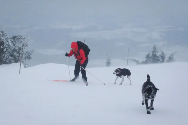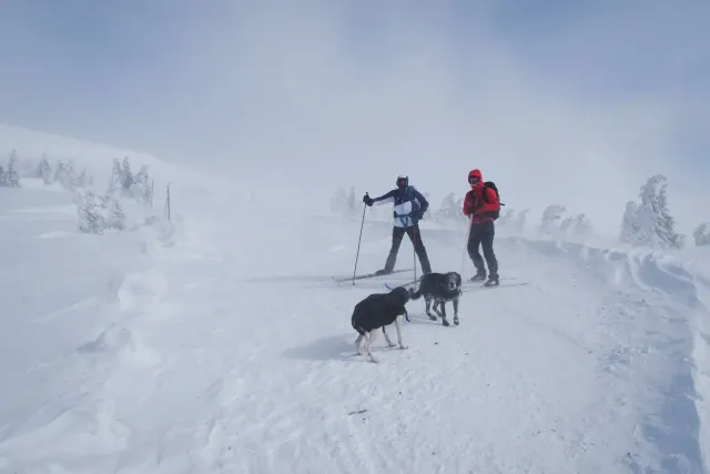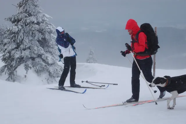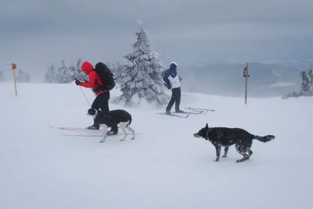 Zima se dostává do své poslední křeče a pravděpodobně posledních letošních běžek si užijeme na Krkonošsném hřebenu. Auto jsme zanechali v Trutnově a z vlaku jsme vystoupili v Rokytnici nad Jizerou. Že na chladivé a větrné předpovědi bude něco pravda jsme pocítili již nad Dvoračkami a když jsme bez remcání zalézali do Labské na fazolačku, místní teploměr ukazoval mínus čtrnáct a psi ve větru skučeli, že by prý psa nevyhnal. Nasadili jsme teplejší rukavice a co šlo zakryli proti útokům větru se vším, co s sebou nesl. Po ose Martinovka, parádním lesním traverzem na Petrovu jsme dorazili Na Špindlerovku v pět odpoledne. Čas to nebyl závodní, ale odpovídal počasí a našim možnostem. Zde jsme již zvažovali, zdali pokračovat či lenošit. Na Luční jsme dorazili s padajícím soumrakem a měli jsme pocit, že je vyhráno, když na Výrovku je to jen přes kopeček. S příchodem tmy, kdy bylo vidět stěží k další tyči, s vychřicí v zádech, která nám z kopce nedovolila zastavit ani s lyžemi naštorc, jsme však museli ještě krapet zabojovat. Zdenek se nám omluvil za vulgární výrazy použité po střetu s tyčí, přestože jsme je neslyšeli, Hanka nalezla při pádu ztracenu termosku, se kterou se ve svahu již rozloučila a já jsem neodvrátil s odporem zrak, když Zdenek zapl svoji GPSku, abychom našli správný směr k boudě. Na Výrovku jsme dorazili pět minut před osmou, tedy pět minut před zavíráním kuchyně s gulášem, takže den zkončil lahodně. Vlastně ještě lahodněji, když jsme si dopřáli vyhřátí našich dotlučených zadků v místní sauně. Hančini psi si zatím zjednali respekt ve společné ložnici, kde nejenže nepustili ostatní nocležníky k Hančinýmu batohu, ale ani k jejich vlastním svrškům.