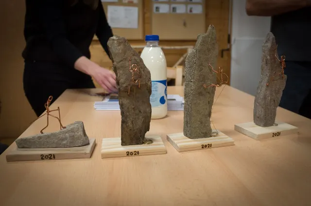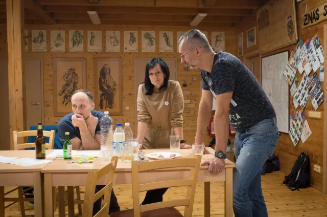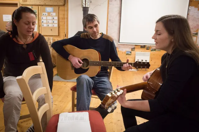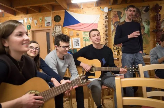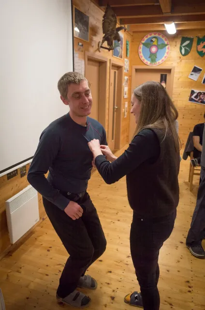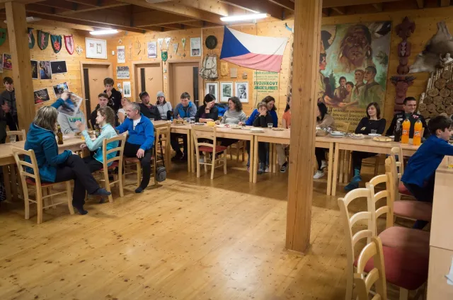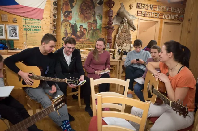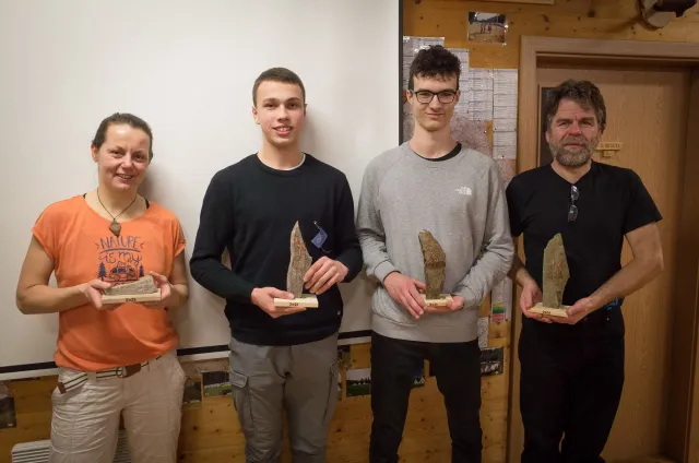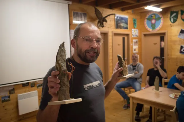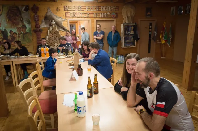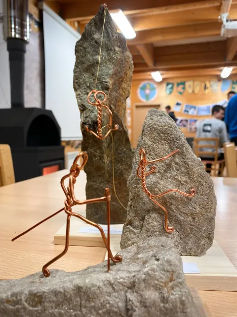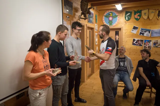 Večerní mecheche korunoval guláš, co pro nás znamenitě vykuchtil Míra, a následně jsme korunovali nejlepší výkony roku, pro které nám pamětní ceny vytvořil zase kutil všeuměl Charlí. Přehled nejlepších výstupů je k nalezení v ročence, co vytvořil náš předseda Franta s talentem novináře, k vidění také na těchto stránkách. Naši mladí lezci nacvičili představení "Jak se nezkušený lezec lezení vyučí" a co bylo ještě neobvyklé? Tolik kytar se tu na závěr najednou ještě nesešlo.